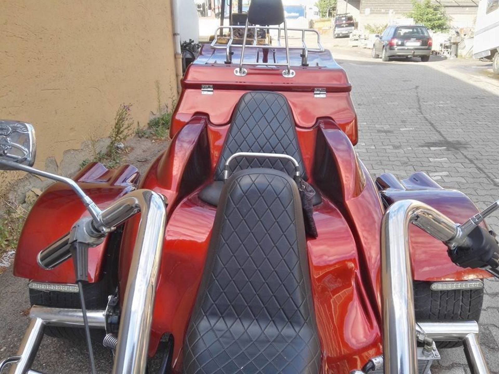 60 mm Unterfahrschutz, elektrischer Tacho, LED Rücklichter. Neue Batterie und neuer 1,4 KW Anlasser, 2 Wasserkühler mit Lüfter und ein Ölkühler der vorne links angebaut ist. Einen VA 38 mm Lenker. Hinten Scheibenbremsen mit neuen Bremsklötzen der Fa. EBC für bessere Bremskraft. Der Alfa 30 Wasser- Boxermotor 16 V wurde teilüberholt und abgedichtet. Ventiele eingeschliffen, Nockenwellen Lager getauscht und beide Zahnriemen gewechselt. Der Motor hat mit den zwei 40 er Weber Doppelvergasern und dem Fächer Auspuff ca. 130 PS. Der Auspuff hat einen richtig kernigen Sound und wurde speziell für den Motor und das Trike gebaut. Das gibt es nicht von der Stange. AHK gebremst 460 Kg ungebremst 280 Kg, Alufelge Vorne 5,25 Zoll X 17 mit 180/55 Bereifung, Hinten 10 Zoll 295/50/15. Die Bereifung hat 5 mm Profil. Sonderlackierung Rot Effekt, seperate 2 Klang Fanfahre, Tagfahrlicht und 12 V Anschluss. Das vordere Schutzblech hat ein Spritzschutz, beleuchtedes Nummernschild, Ölwechsel und neue Kerzen.