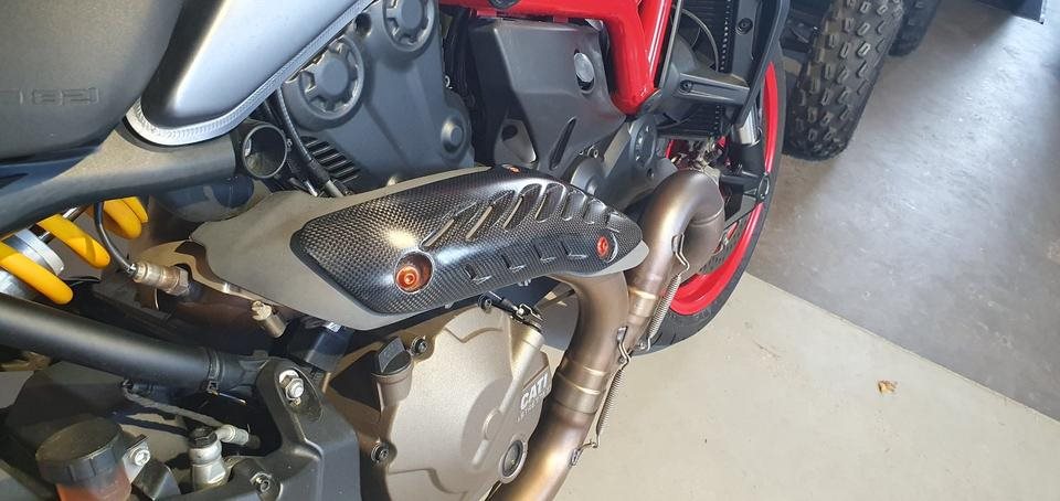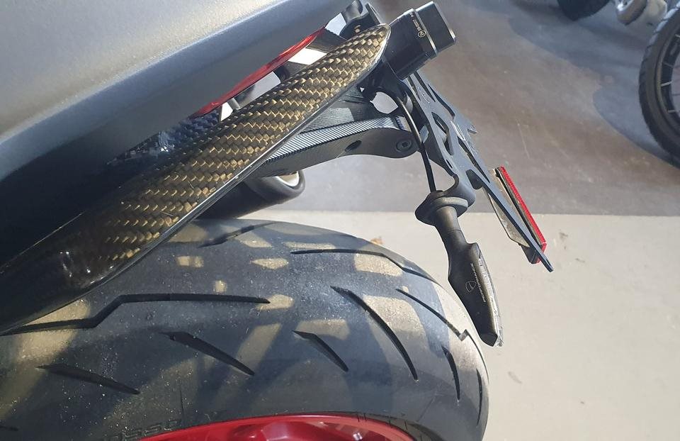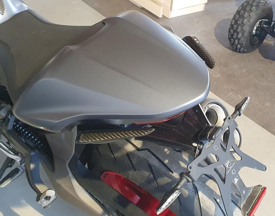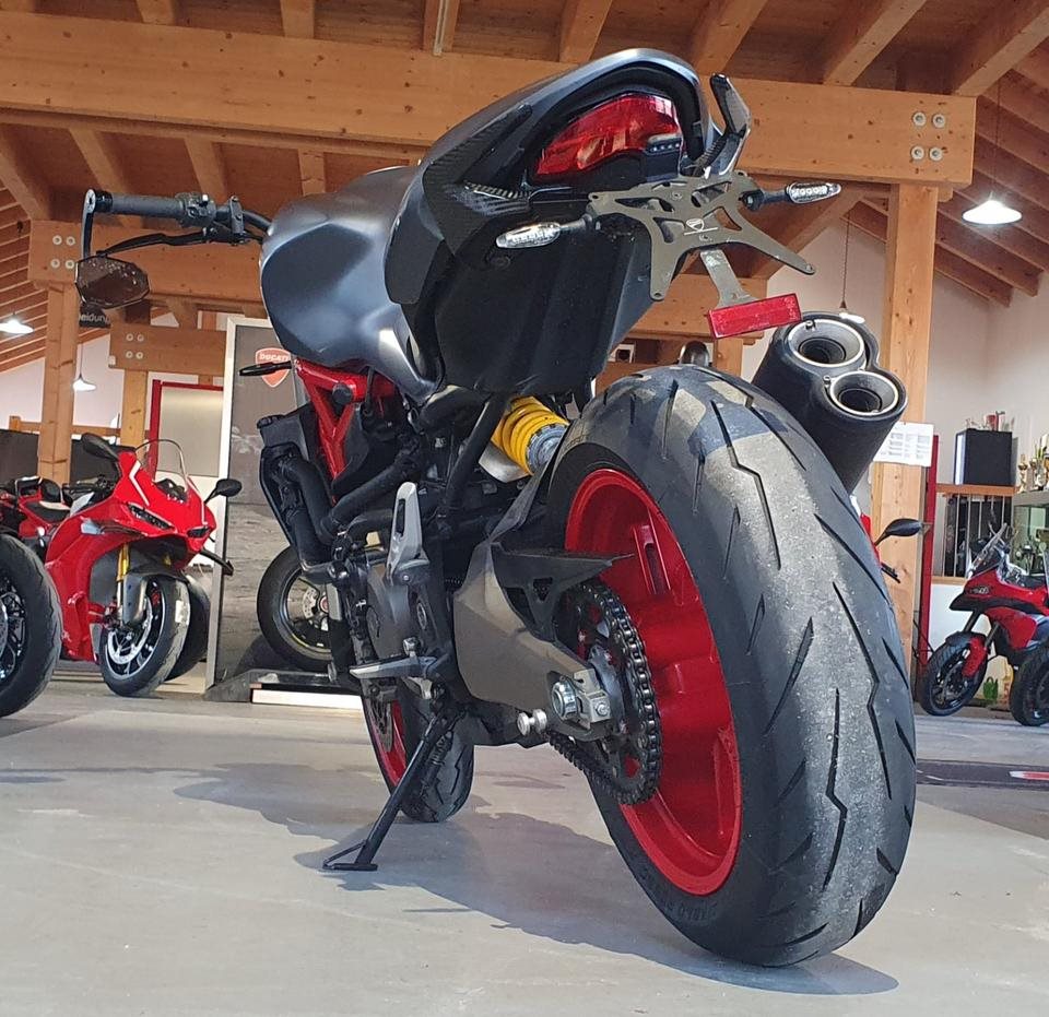 Ducati Monster 821 - Highsider Lenkerendenspiegel, Carbon Auspuff Abdeckung, Ducati Performance Kennzeichentraeger mit Blinkern, Carbon Verkleidung Soziusgriff