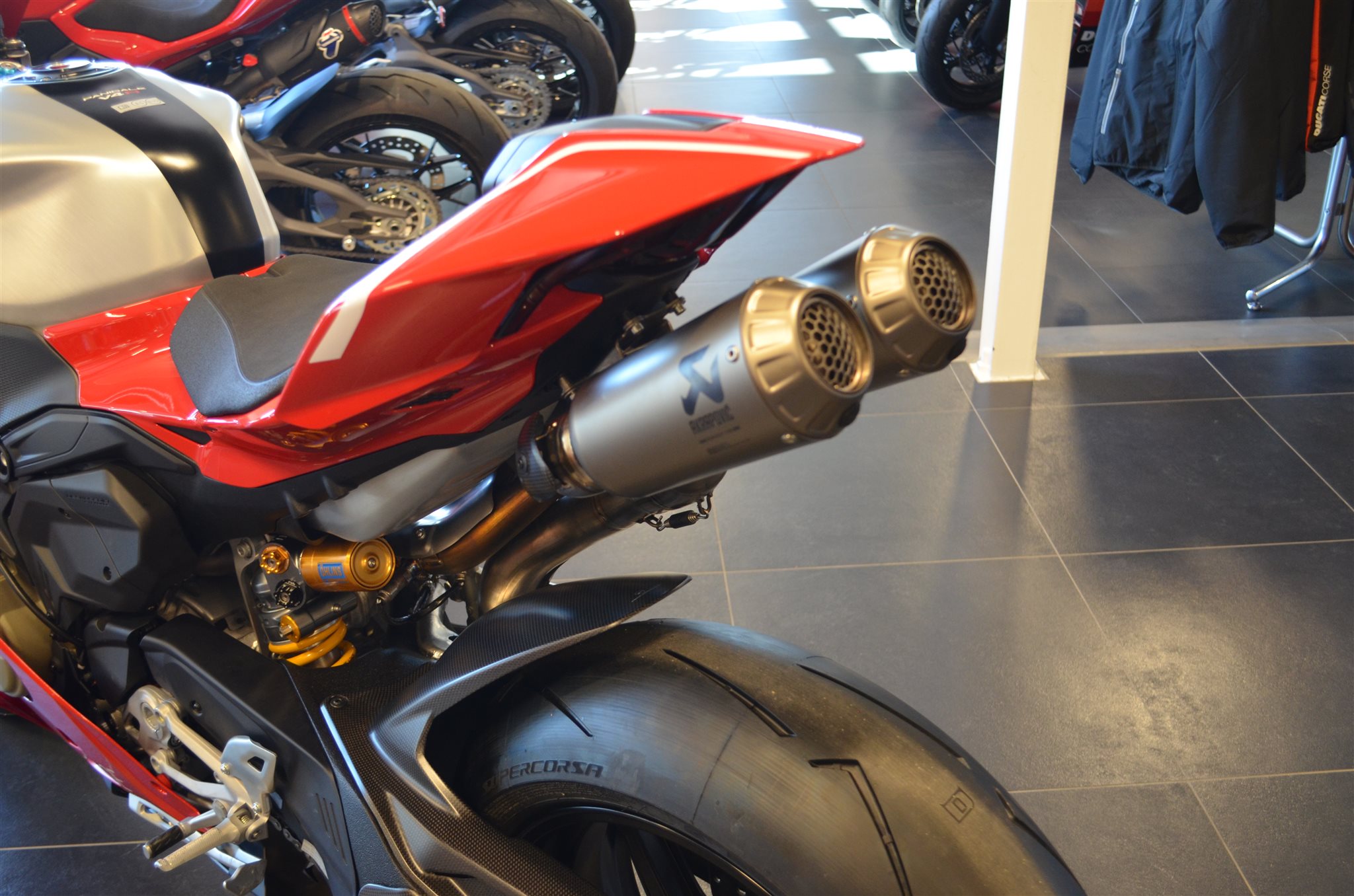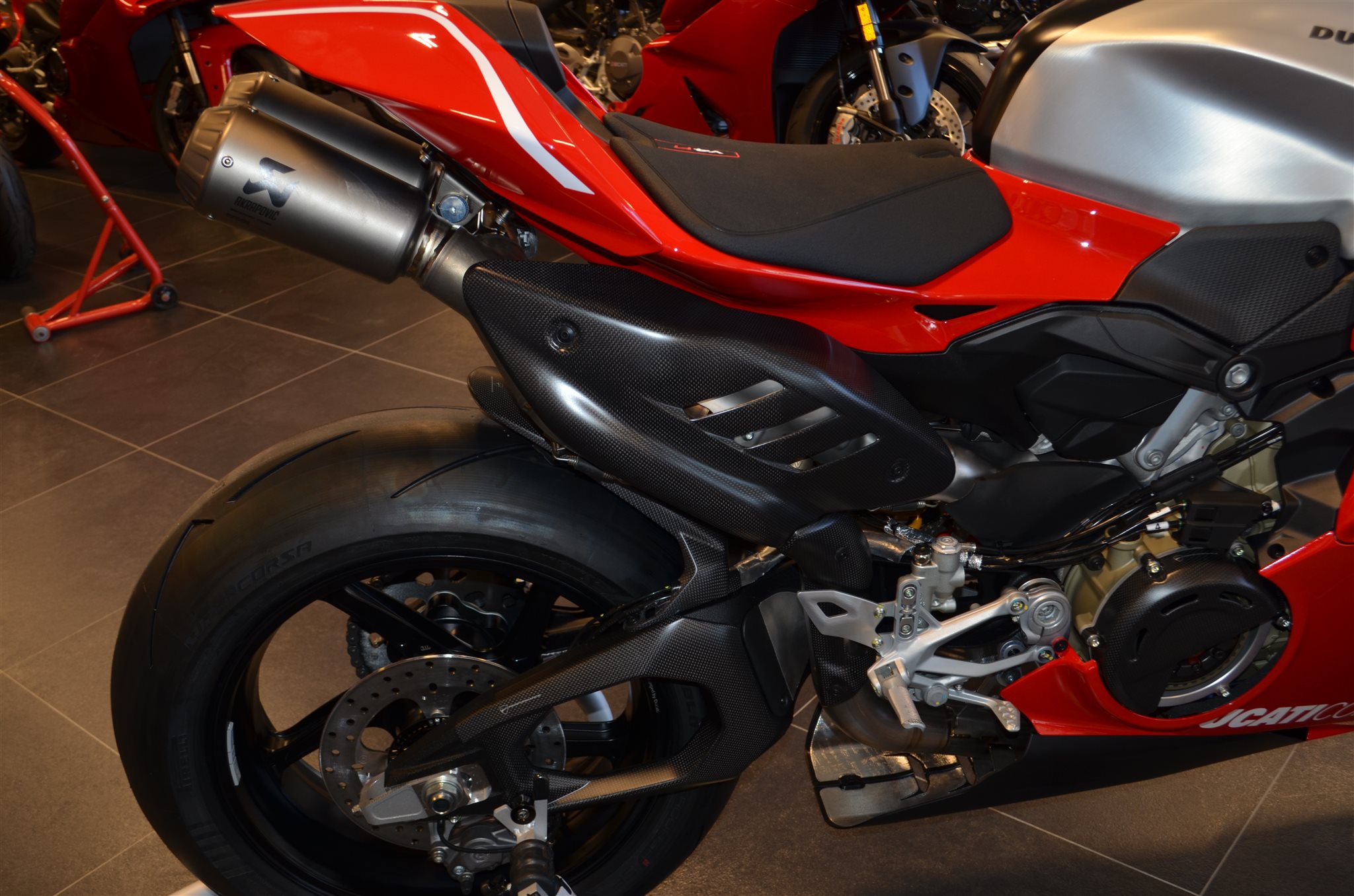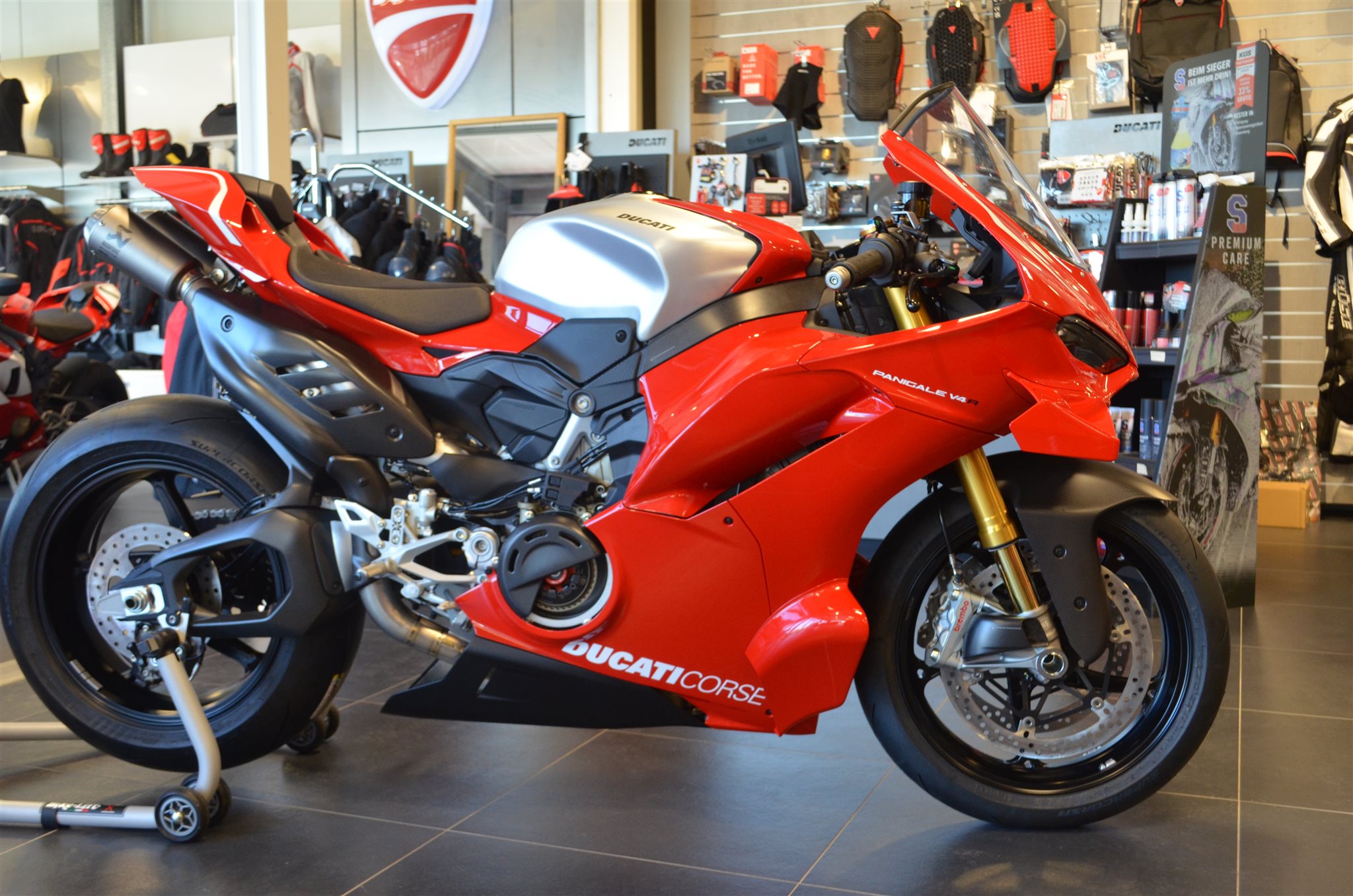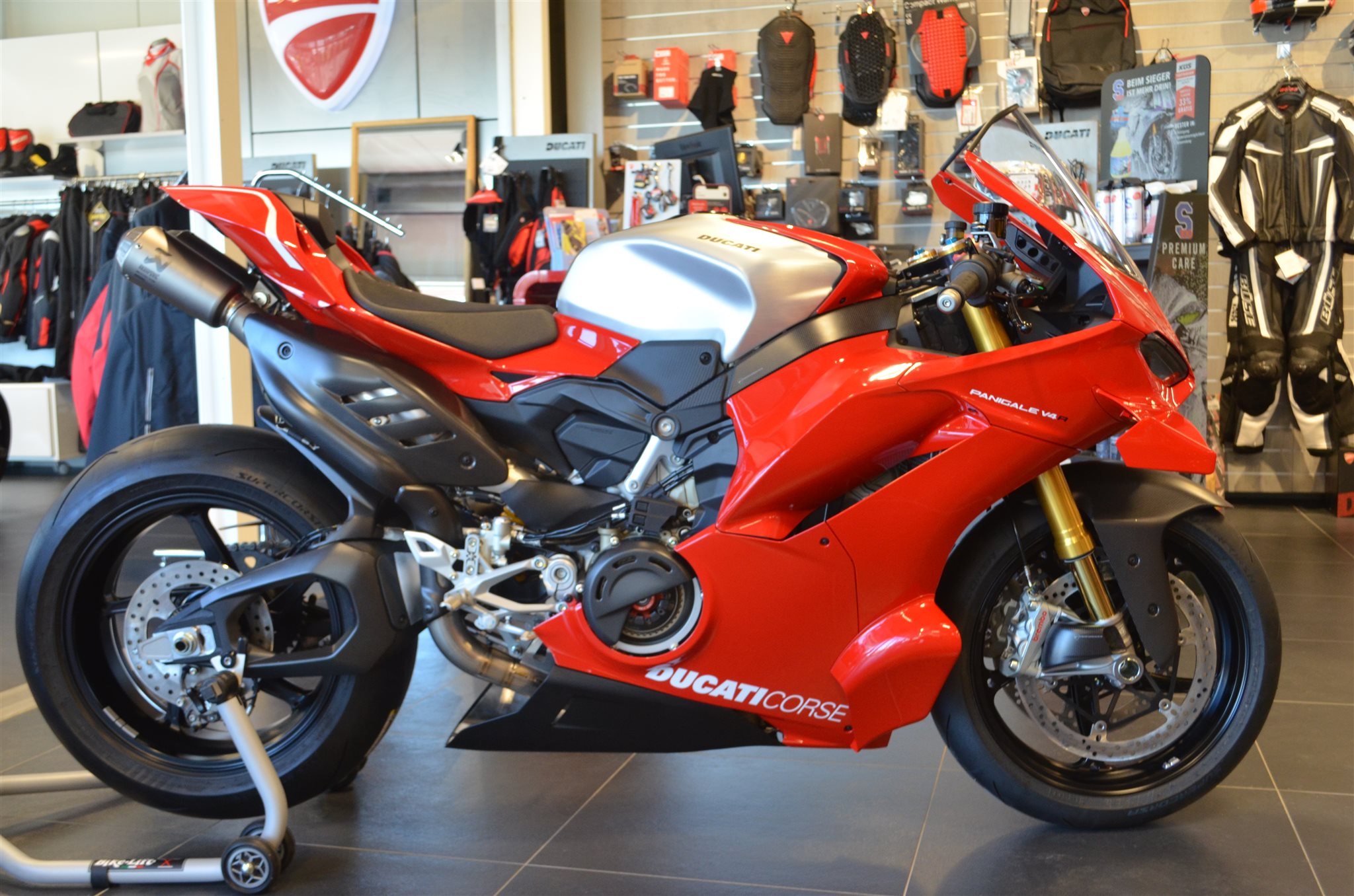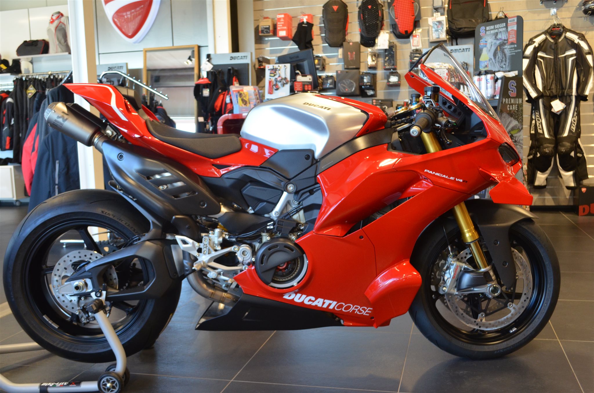 Hier haben wir eine neue Ducati Panigale V4 R mit sehr viel Zubehör.