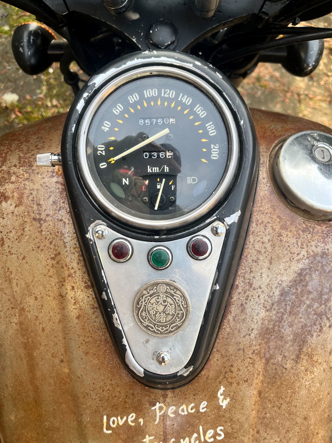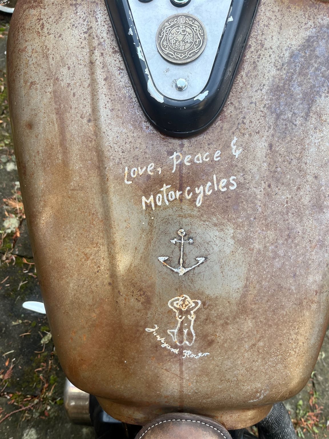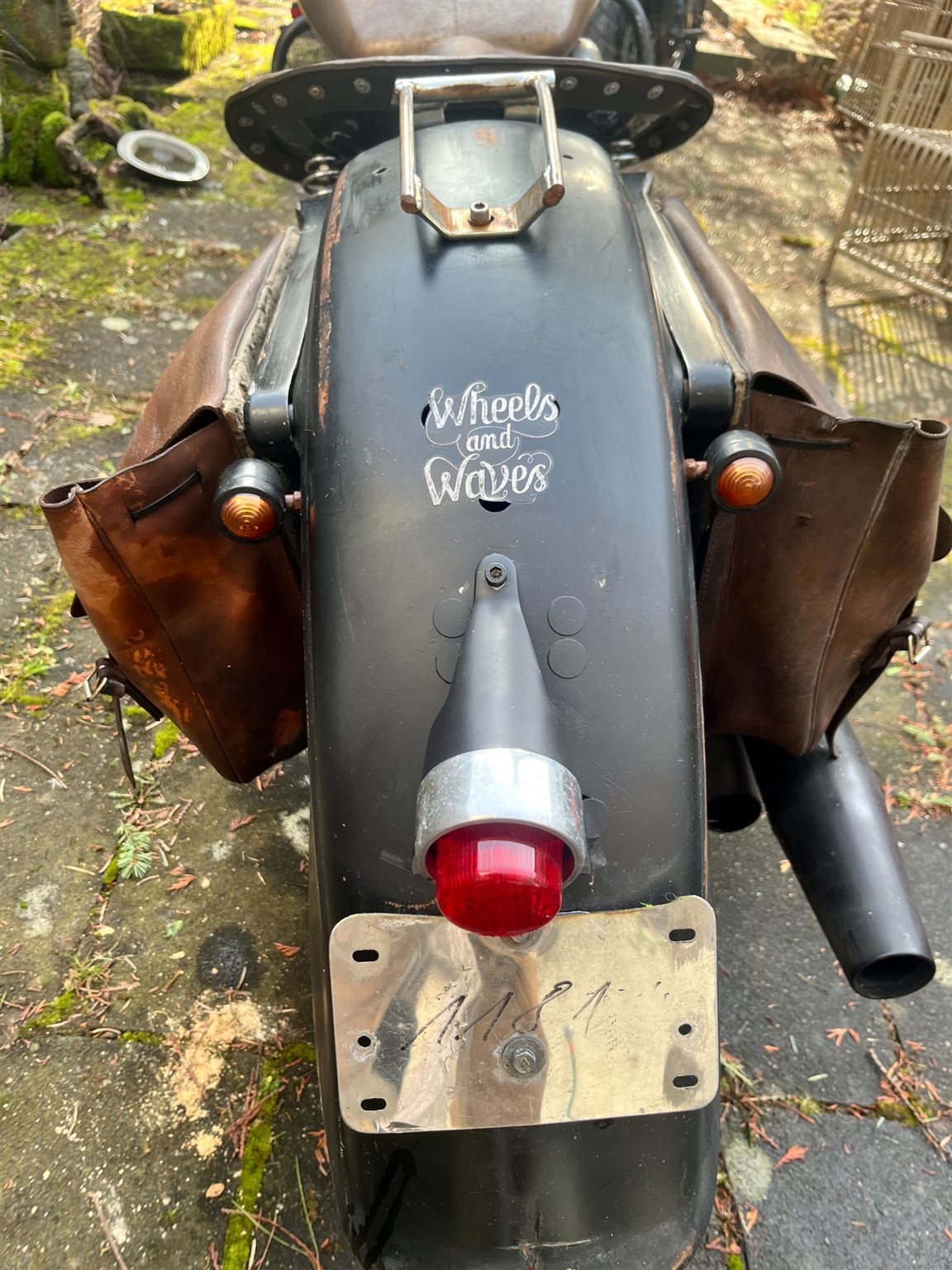 Scheibe, Einzelsattel, kein Chrom, Farbe mit Patina, kleine Blinker und Rücklicht.