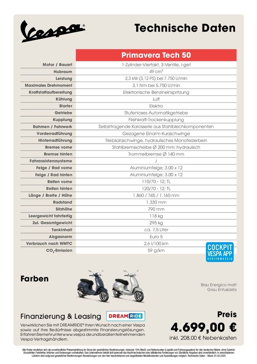 - Leistung Die Vespa Primavera Tech 50 wird von einem effizienten 50-cm3 3V i-get, Euro 5 Motor mit elektronischer Einspritzung angetrieben.