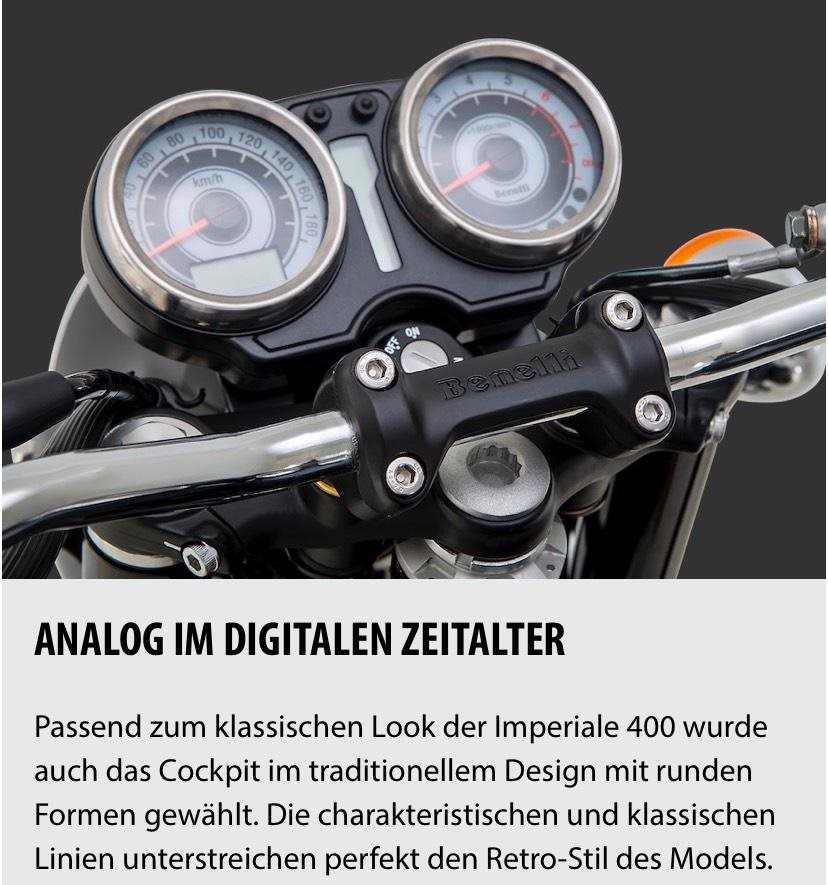 Ein klassisches Motorrad fuer Freigeister, das stark an die Leoncino erinnert - das ist die Imperiale 400. Als Neuinterpretation eines historischen Modells der Benelli-MotoBi-Reihe, das in den 1950er Jahren produziert wurde, ueberzeugt die Imperiale 400 mit klassischem Charakter. Das authentische und urspruengliche Wesen findet heute seine Bestimmung in einem eleganten, modernen Retro-Motorrad.