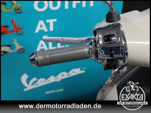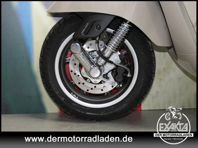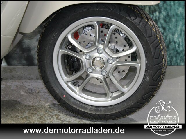Die neuen zweifarbigen Leichtmetallfelgen erinnern an die zerlegbaren Felgen von früher und unterstreichen die Sportlichkeit des 145sten Modells in der Geschichte von Vespa, auch dank der roten Feder der Vorderradaufhängung und der neuen Frontkaskade, die auf das Standlicht verzichtet, um einen mit verchromten Elementen bereicherten Grill zur Schau zu tragen.