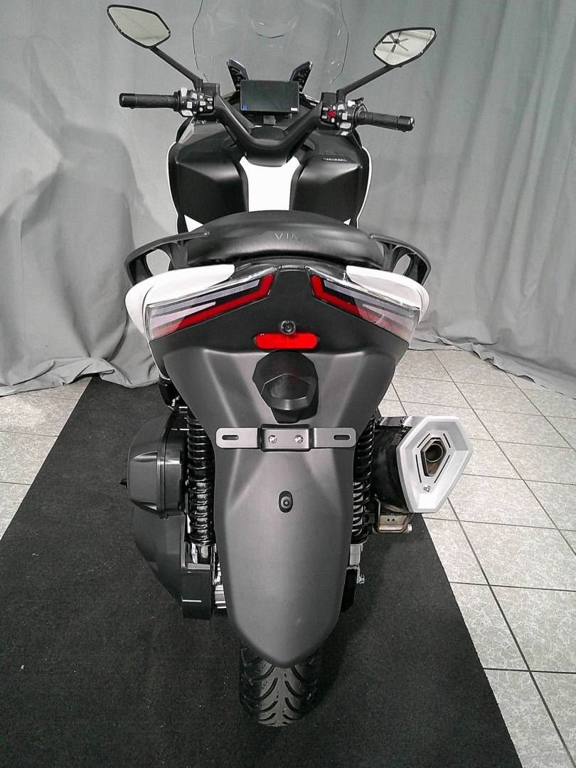 Außenfarbe weiß, Front- und Rückfahrkamera, Keyless mit automatischer Entriegelung, Fahrmodi Eco und Sport, TFT Vollfarb LCD Display, Nutzung als Navi Bildschirm, Spiegelung und Telefonverbindung, Bluetooth Anbindung, Reifendruckkontrollsystem, Verstellbarer Lenker aus Aluminium, Heizbare Griffe und Handschützer, Elektrisch verstellbares Windschild, Dualer USB Anschluß für Schnellladung, XXL Helmfach für zwei Integralhelme, LED Beleuchtungsanlage, Extra Komfortsitz mit Gasfeder, Zweikanal ABS, Traktionskontrolle