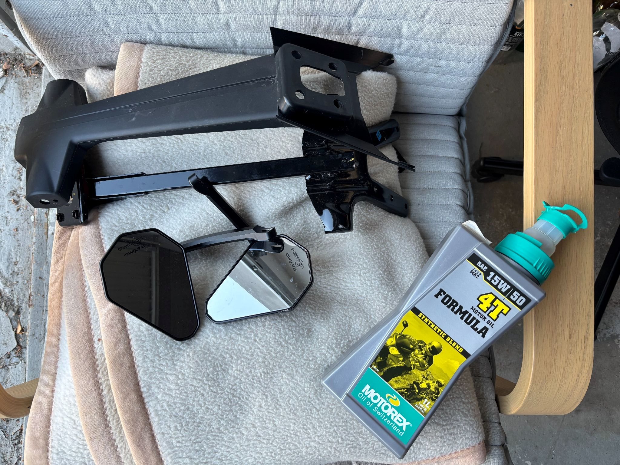 Zubehör wird mitgegeben: langer Kennz-halter, Lenkerendspiegel, Öl.