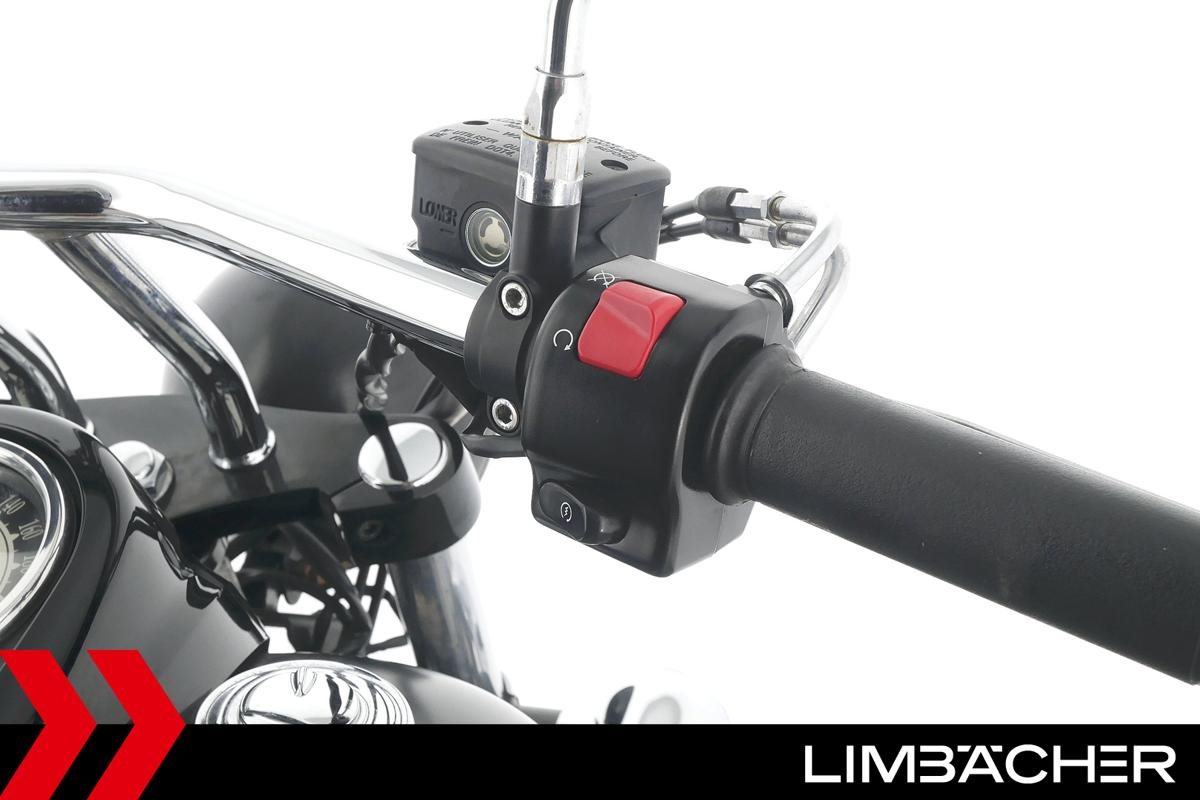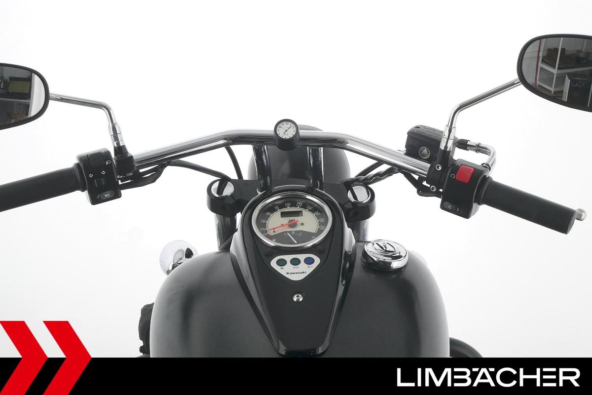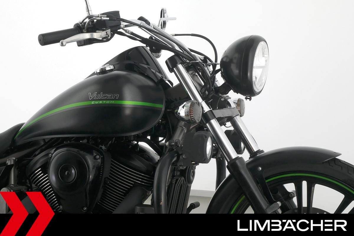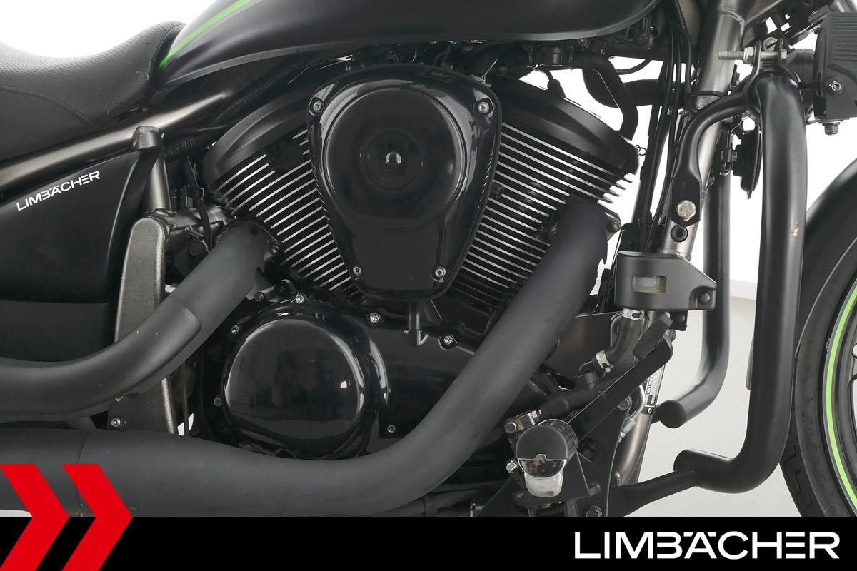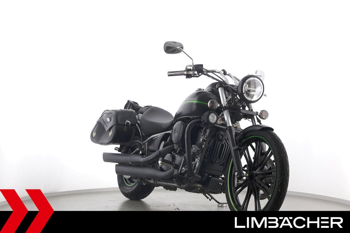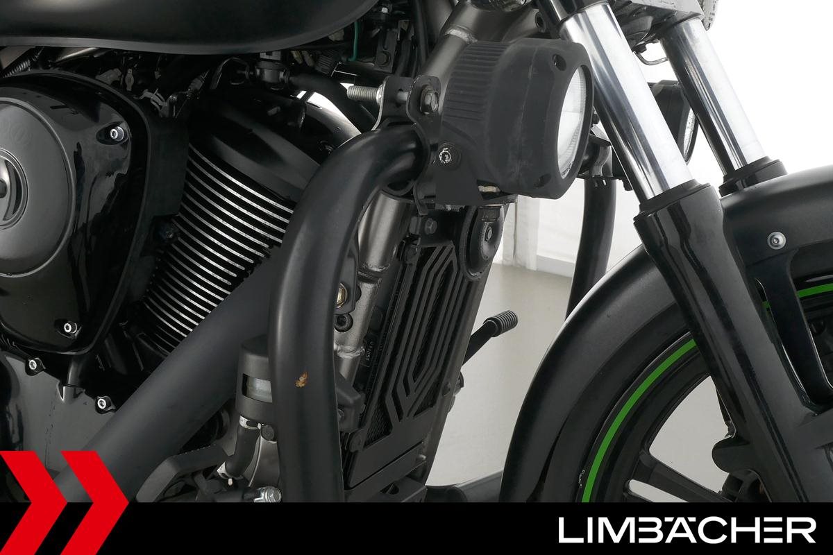 Eine Kawasaki VN 900 Custom aus zweiter Hand in gepflegtem Zustand u.a. mit Sturzbügel in schwarz sowie Zusatzscheinwerfern.