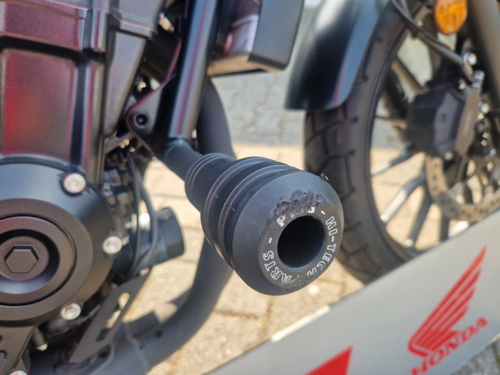 Das Motorrad ist im Stand einmal umgefallen. Dabei entstanden lediglich leichte Kratzer an der Auspuffabdeckung, der Soziusfußraste sowie am Sturzpad.