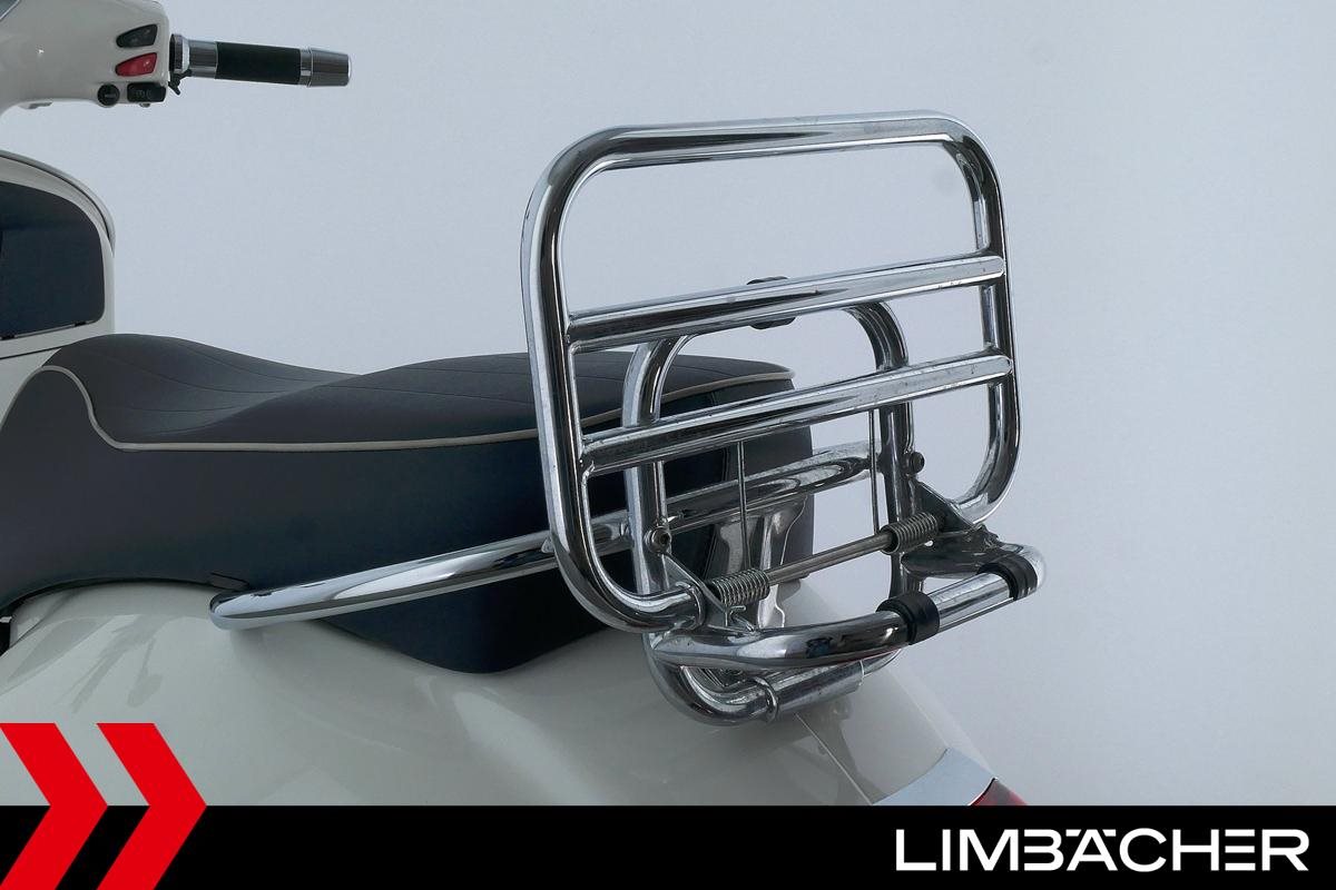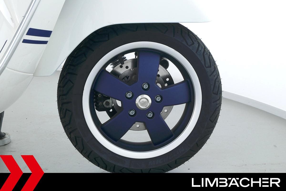 Eine Vespa GTS 300 aus zweiter Hand in gepflegtem Zustand u.a. als Yacht-Club Edition mit Chrom-Gepäckträger.