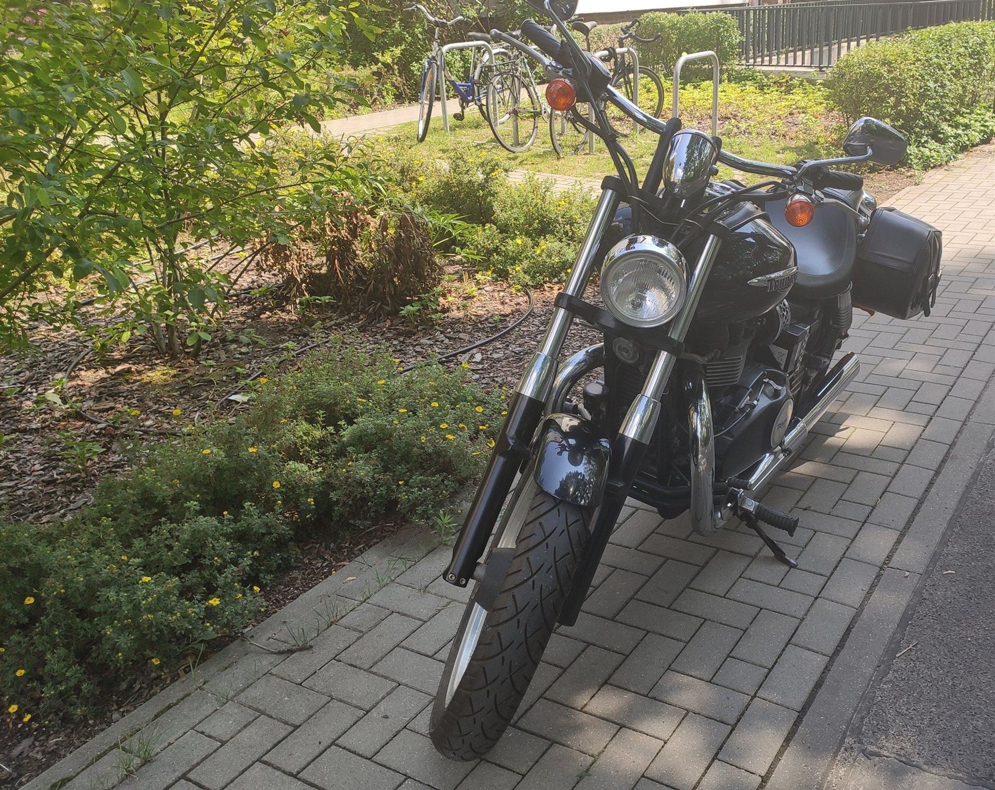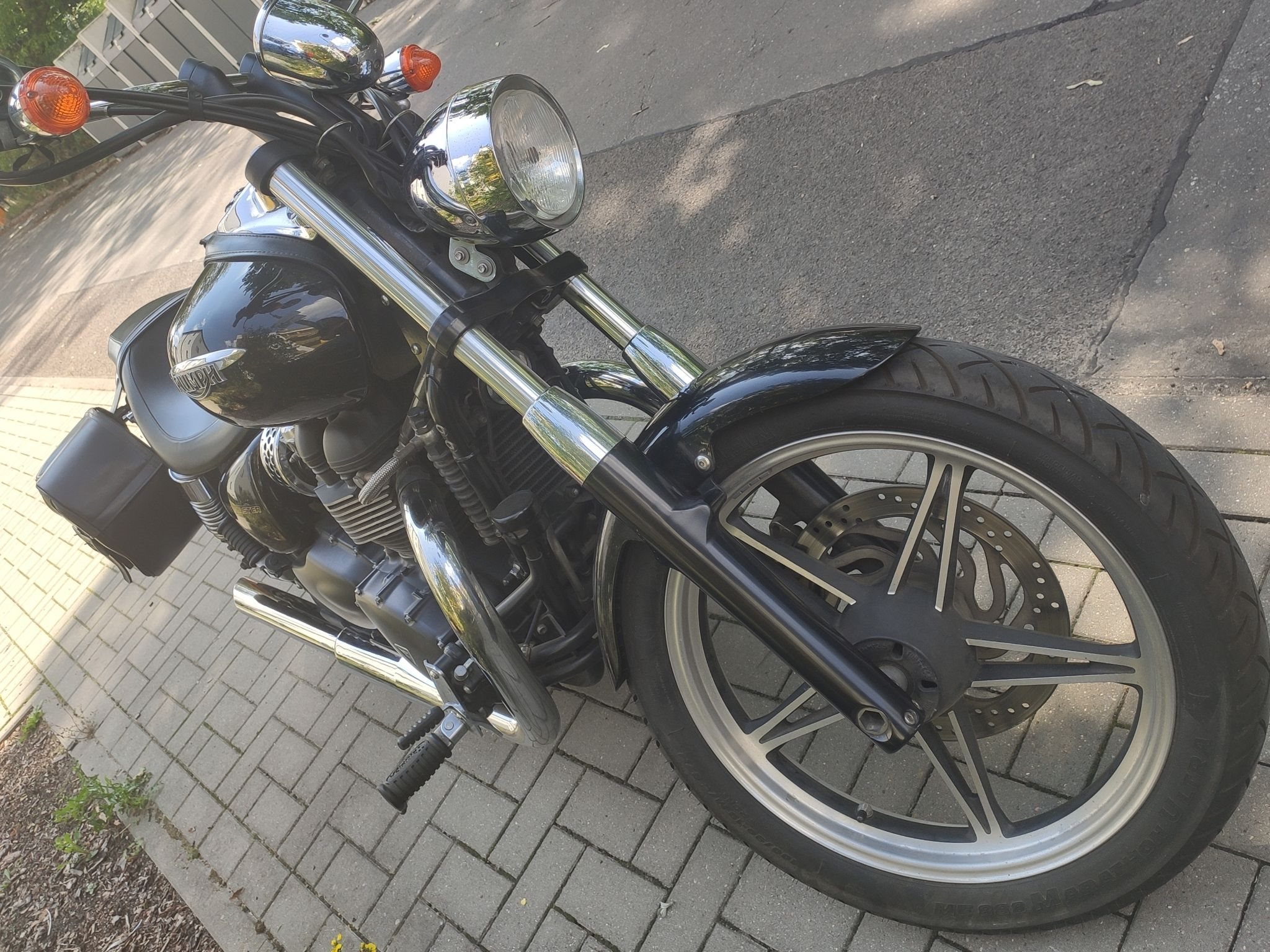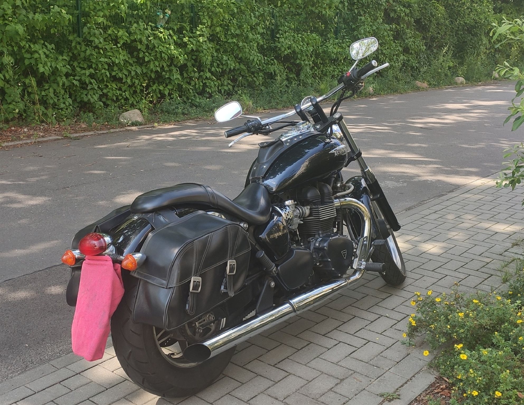 Extras am Bike: Original Triumph Leder-Satteltaschen, Leder-Tankschoner, abschließbarer Tankdeckel.