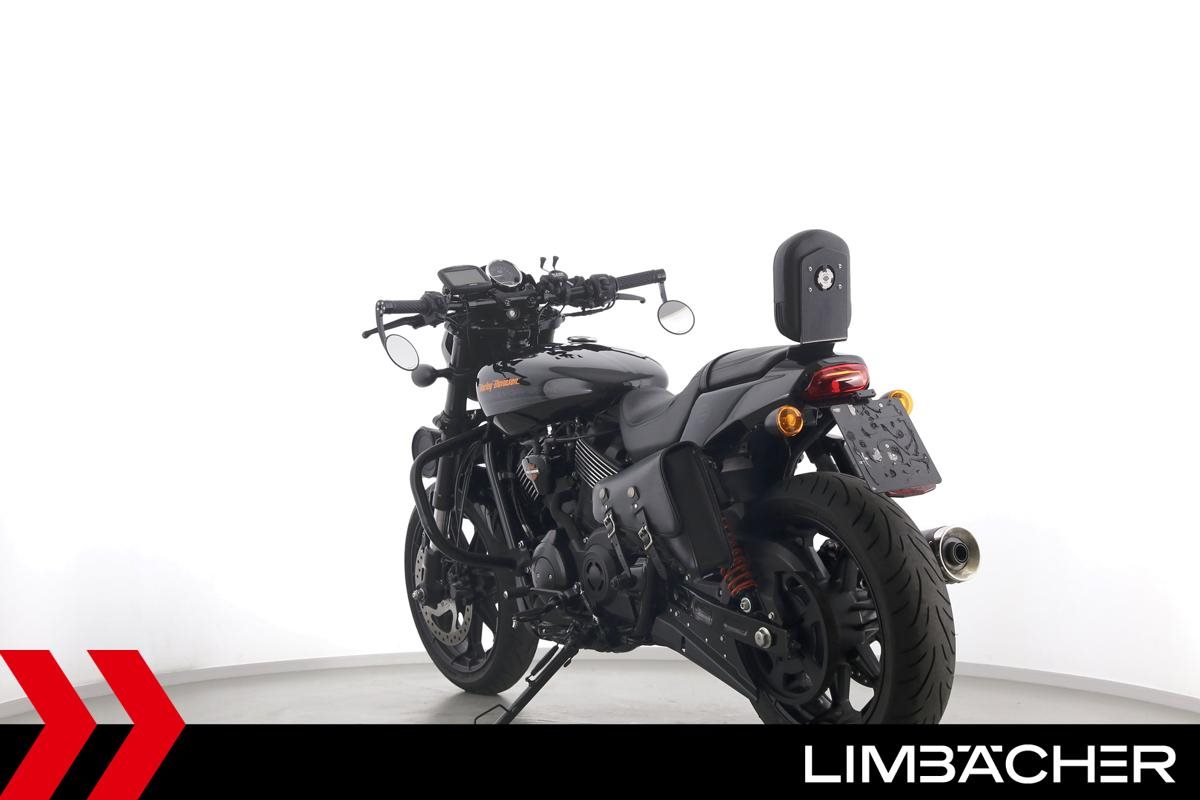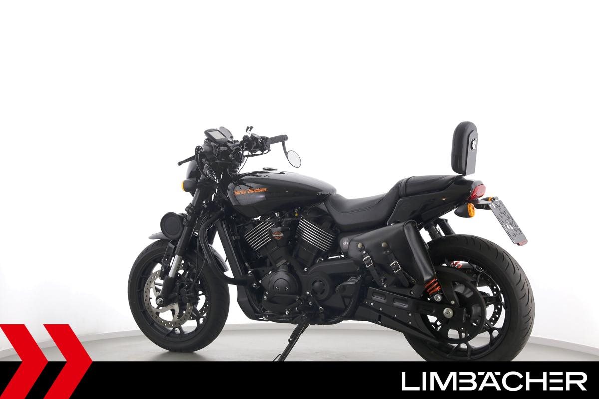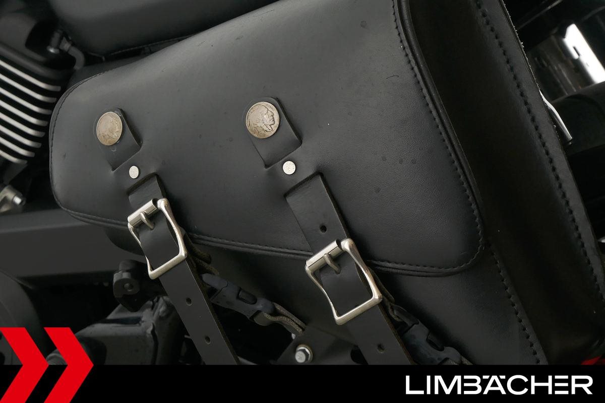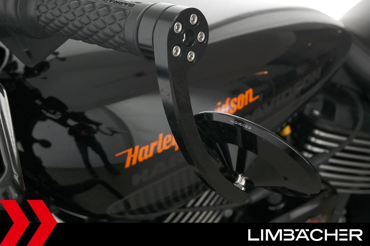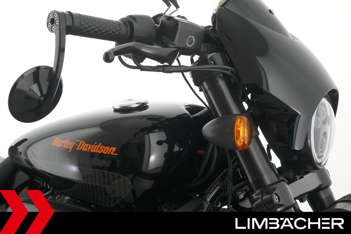 Eine scheckheftgepflegte Harley-Davidson Street Rod 750 in gepflegtem Zustand u.a. mit Screamin' Eagle Endschalldämpfer und Highsider-Lenkerendenspiegeln.