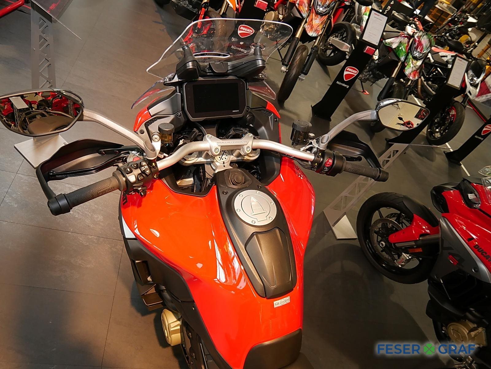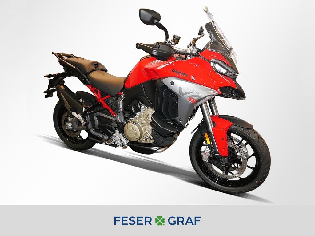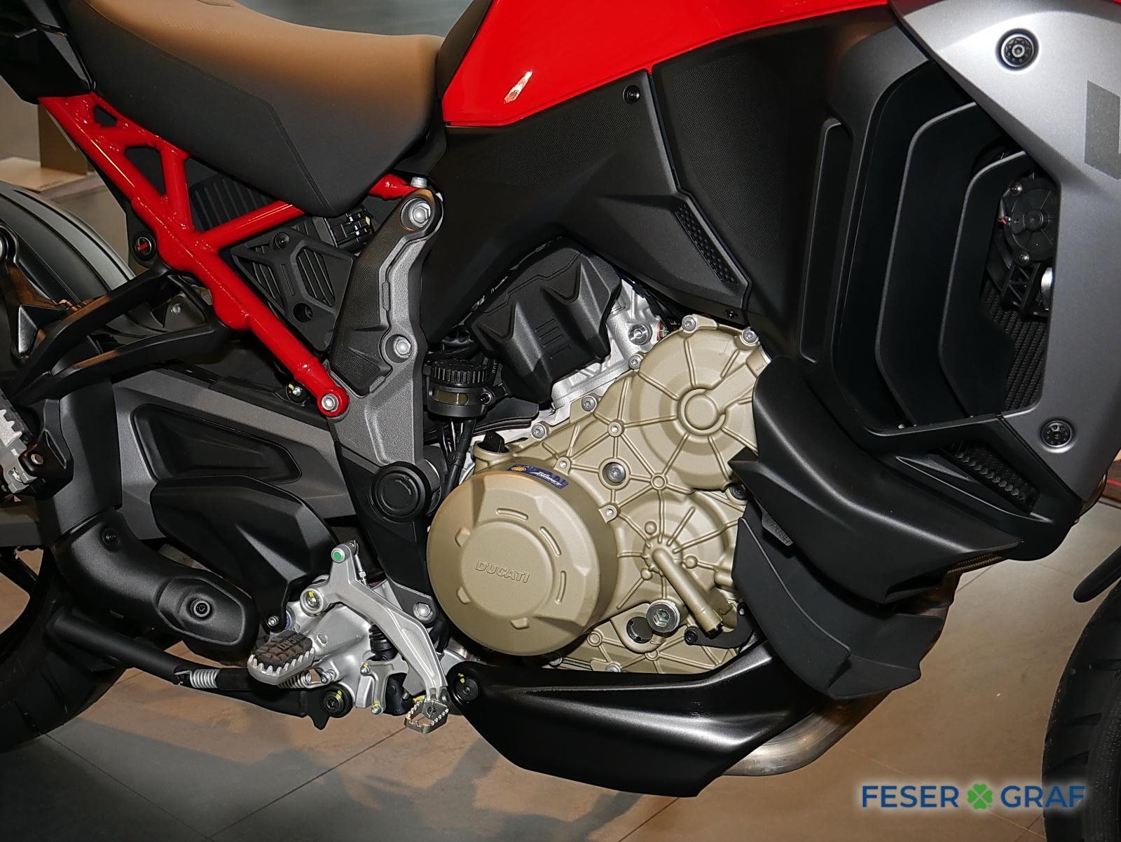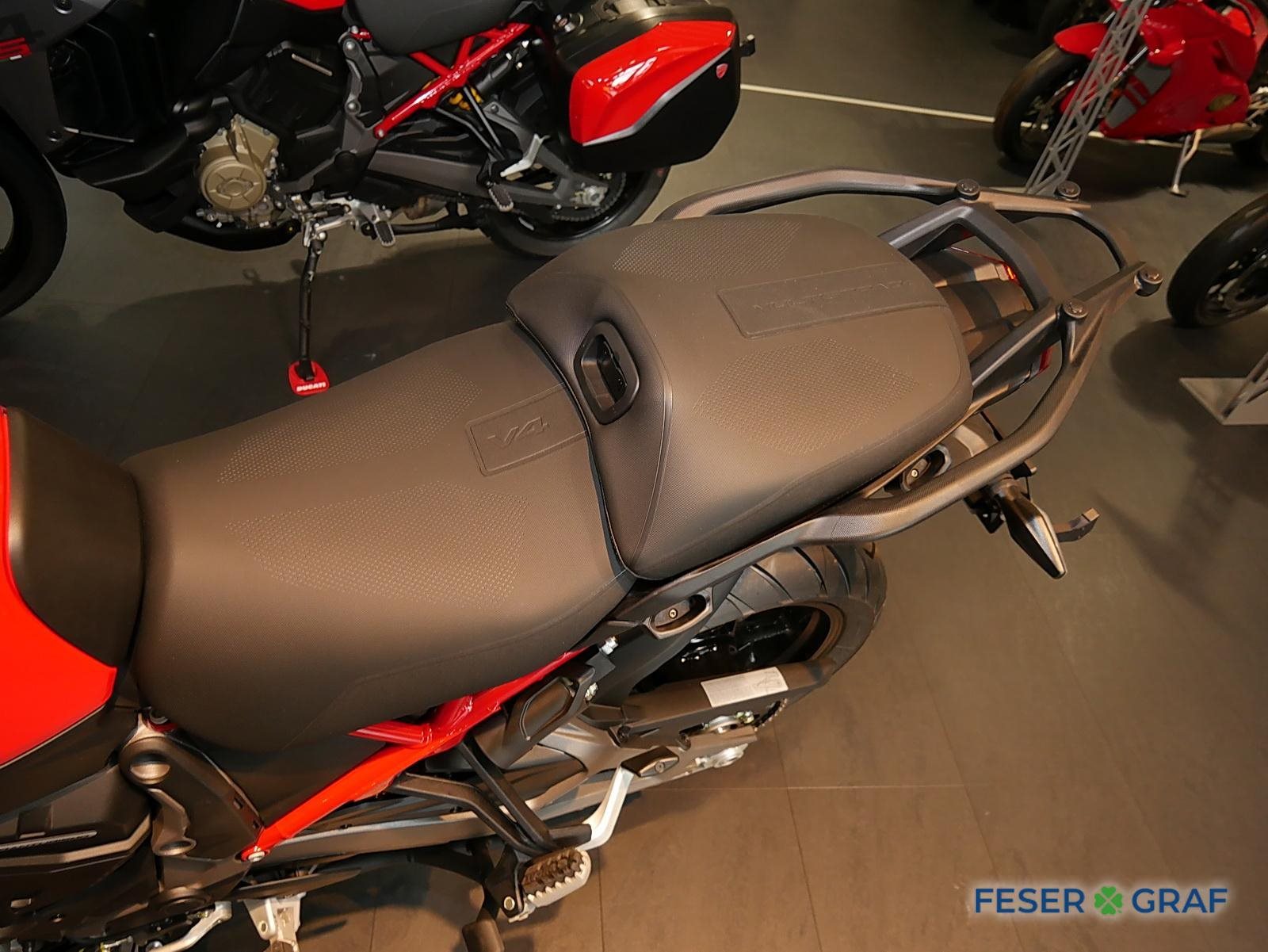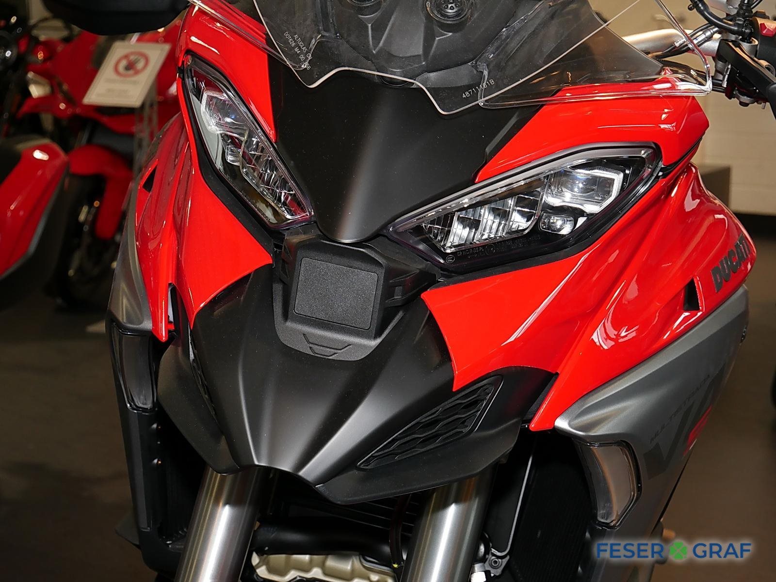 - Ausstattung:, Ducati Skyhook Suspension, Minimum Preload System, Ducati Quick Shift, Tempomat, Hands-Free, beleuchtete Bedienelemente,,6,5-Zoll-TFT-Farbdisplay mit Ducati Connect und Karten-Navigation, Voll-LED-Scheinwerfer, Front- und Heckradar-System mit adaptivem Tempomat, Kunststoff-Seitenkoffer, Hauptständer, beheizter Fahrer- und Soziussitz, beheizte Handgriffe
