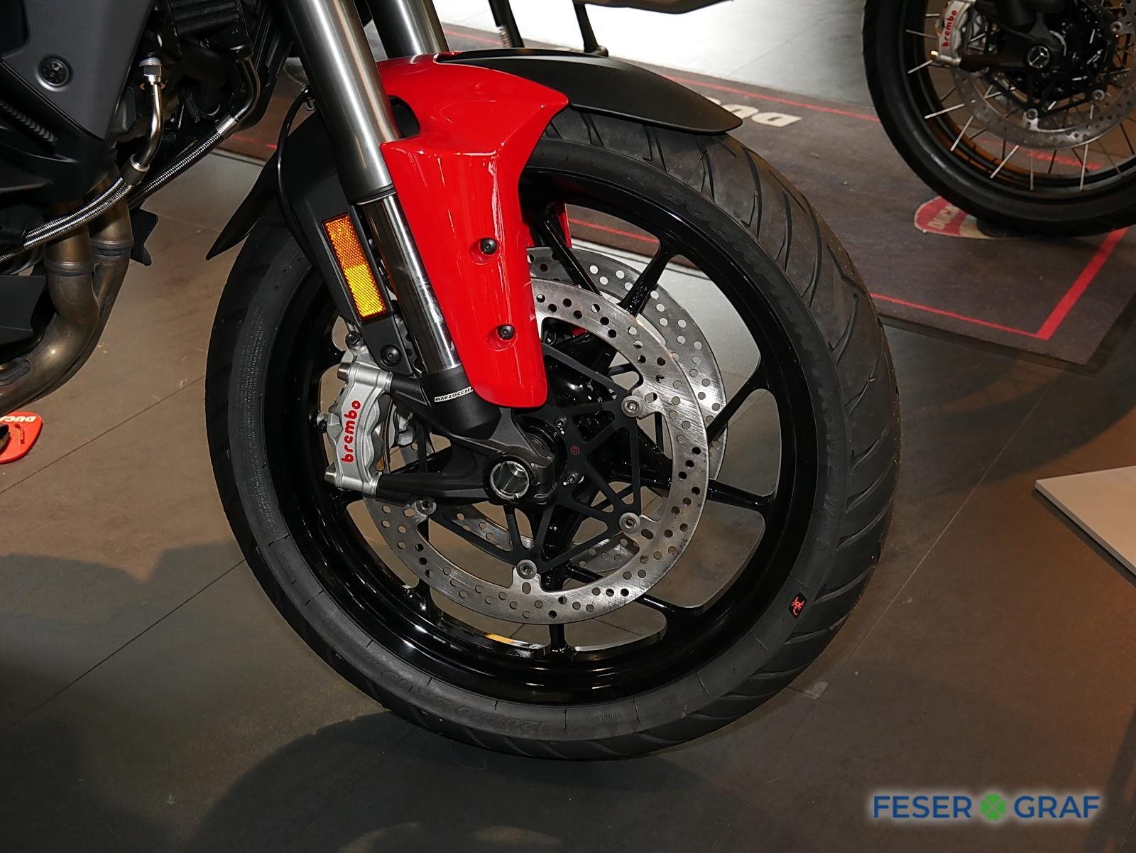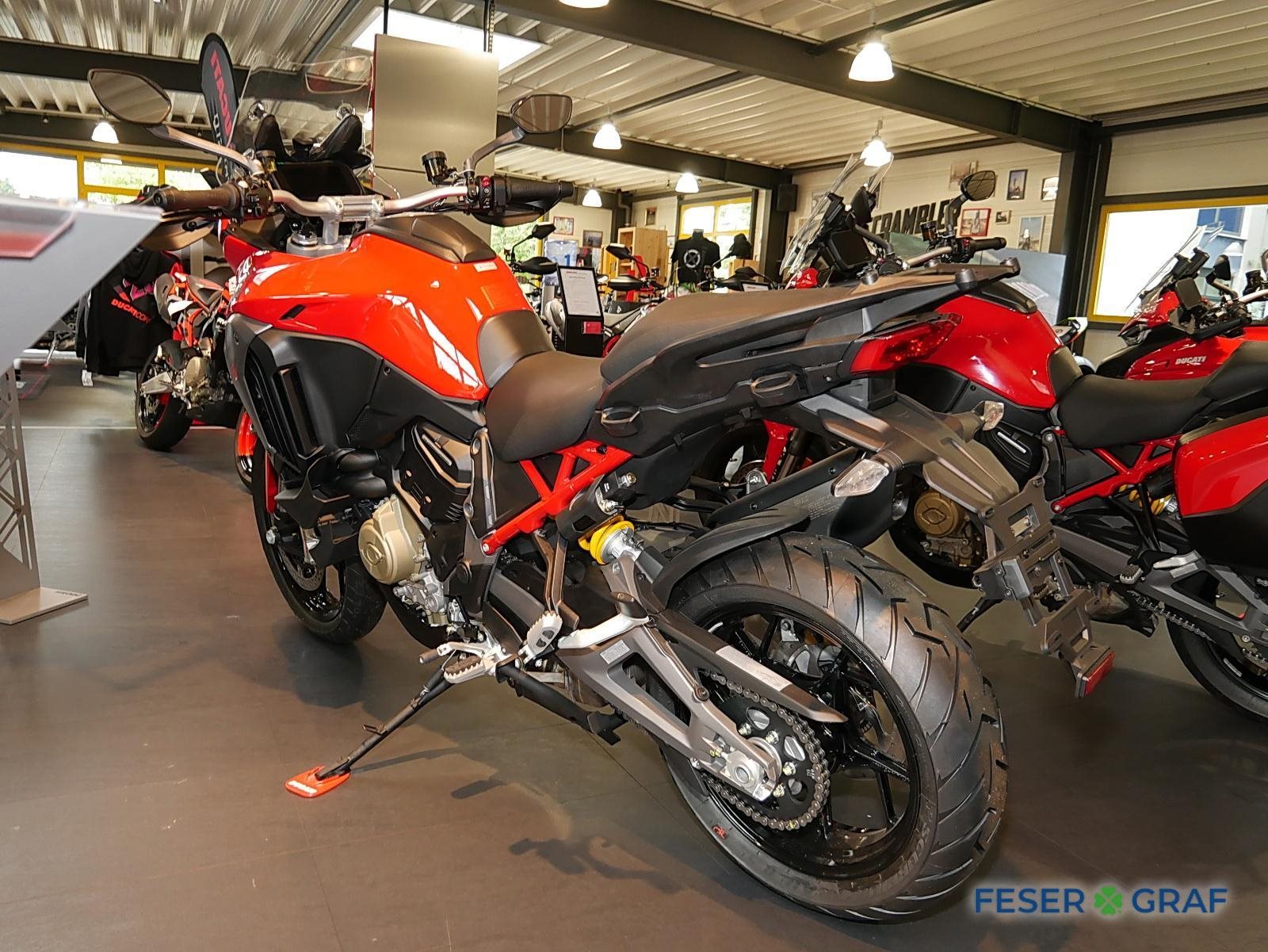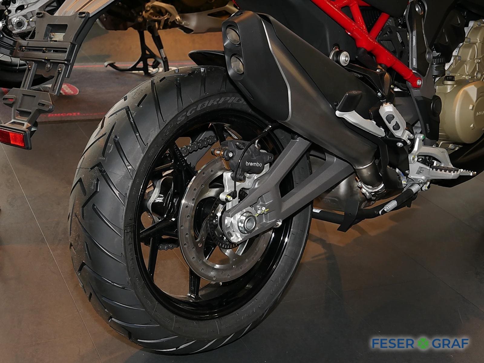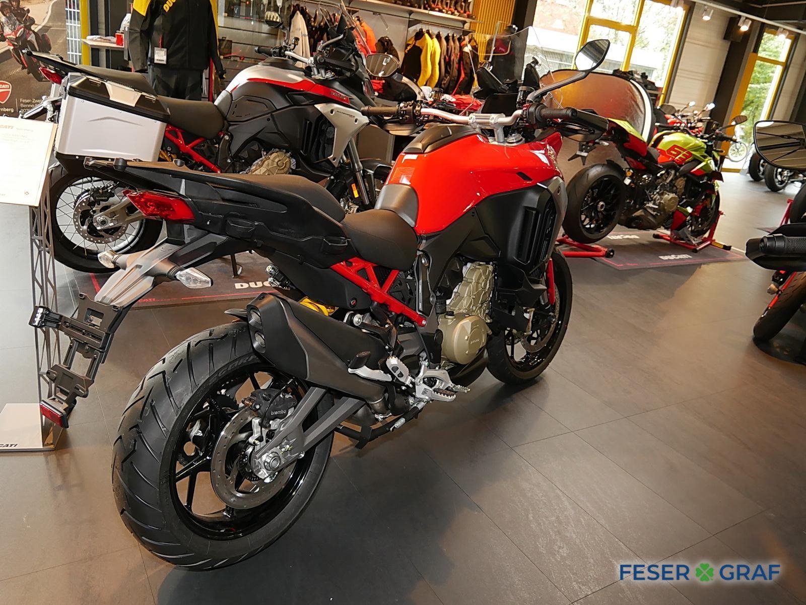 - Ausstattung:, Ducati Skyhook Suspension, Minimum Preload System, Ducati Quick Shift, Tempomat, Hands-Free, beleuchtete Bedienelemente,,6,5-Zoll-TFT-Farbdisplay mit Ducati Connect und Karten-Navigation, Voll-LED-Scheinwerfer, Front- und Heckradar-System mit adaptivem Tempomat, Kunststoff-Seitenkoffer, Hauptständer, beheizter Fahrer- und Soziussitz, beheizte Handgriffe