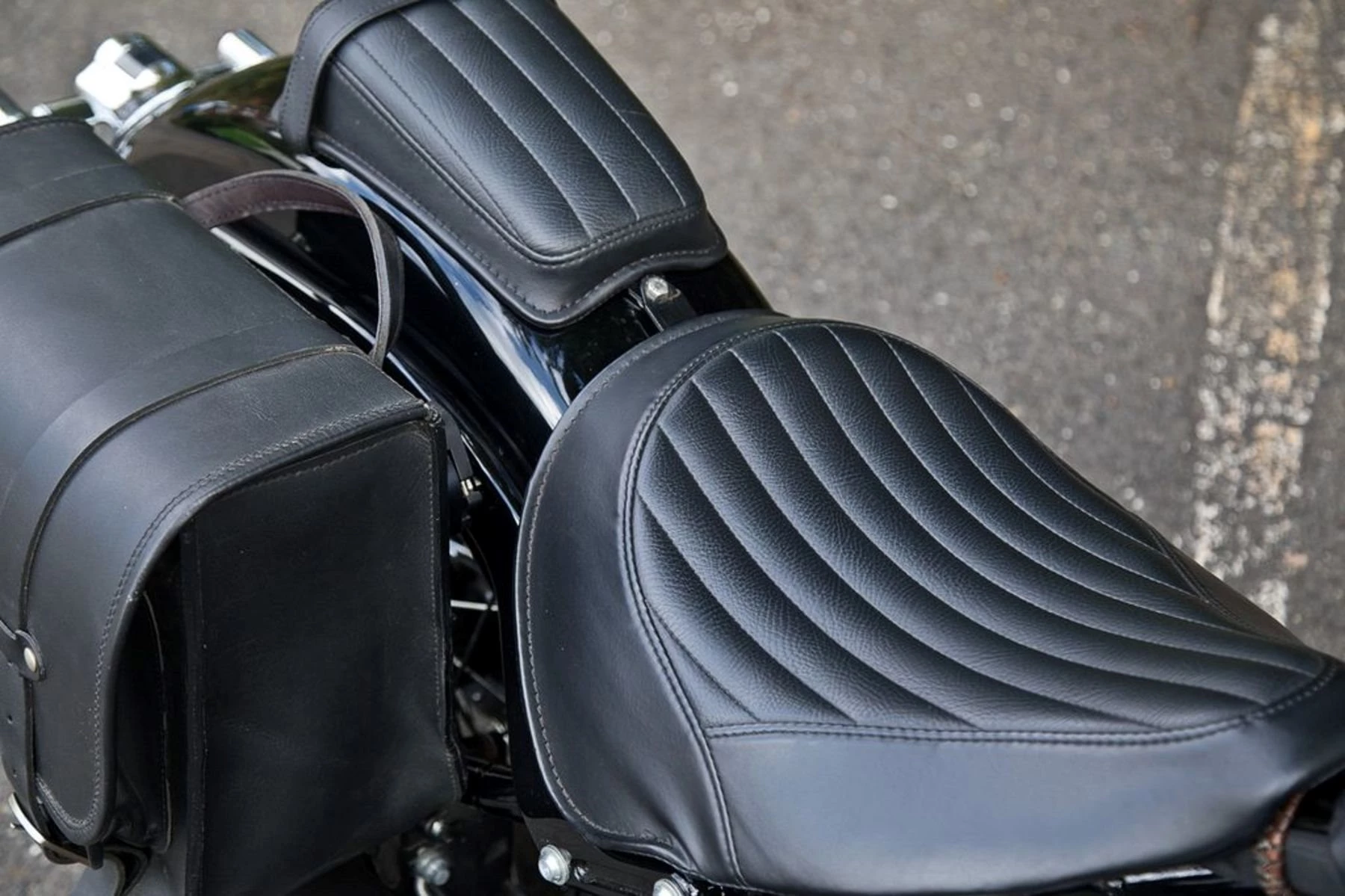 Diese von Haus aus klassisch gestaltete Maschine wurde mit schwarzer Lackierung, Seitentaschen und schwarzen Speichenfelgen mit silbernen Speichen bewusst nostalgisch konfiguriert. Eine zugelassene Auspuffanlage vom Harley-Davidson Veredler Dr. Jekill & Mr. Hyde® sorgt für einen besonders volumigen Sound des V2-Aggregates.