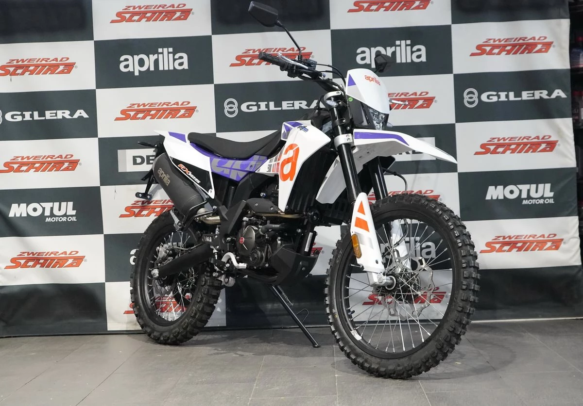 Das Design der Aprilia RX 125 ist schnittig und minimalistisch, mit scharfen Linien, die sich von vorne bis hinten erstrecken und ihre Rennsport-DNA betonen. Der mattschwarze Auspuff fügt sich nahtlos in den glänzend schwarzen Rahmen, den Lenker, den Motor und die Schwinge ein. Die eloxierten, glänzend schwarzen Räder, die für echte Offroad-Leistung ausgelegt sind (21 vorne, 18 hinten), sorgen in Kombination mit den Stollenreifen für optimale Kontrolle und Traktion auf jedem Gelände.