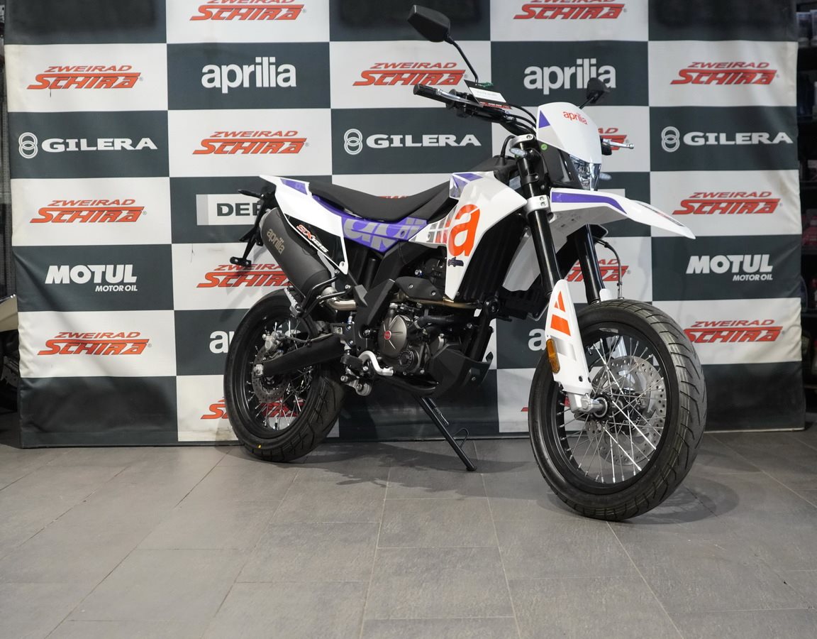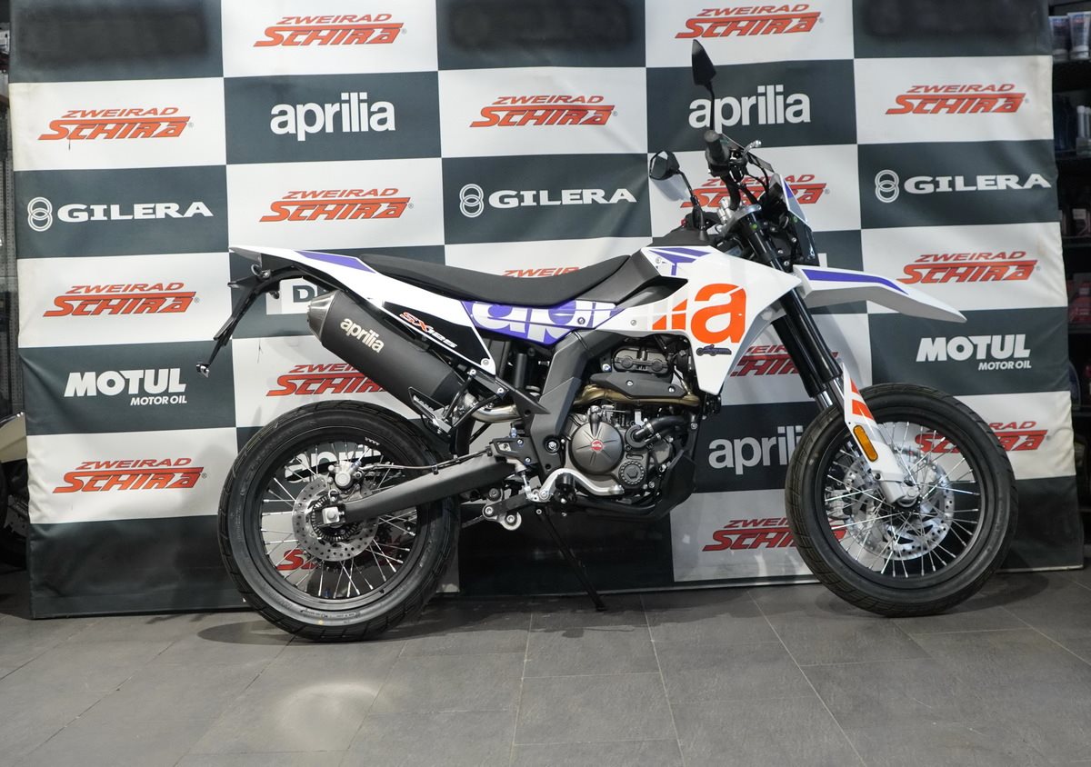Die SX 125 ist leicht und präzise in der Handhabung und wird von einem modernen Einzylinder-Motor mit vier Ventilen und Euro 5+ Norm angetrieben, der über alle Drehzahlbereiche hinweg ein hervorragendes Drehmoment und eine hervorragende Leistung bietet. Präzision und Sicherheit in Kurven werden durch eine Dämpfung mit langem Federweg und ein Bosch-ABS mit Anti-Überschlag-Funktion gewährleistet, das beim Bremsen auf das Vorderrad einwirkt, um das Anheben des Hinterrads zu regulieren. Das Bremssystem verfügt über zwei schwimmend gelagerte Bremssättel: Der vordere mit zwei Kolben greift auf eine 300 mm Scheibe zu, während der hintere auf eine 218 mm Scheibe wirkt.
