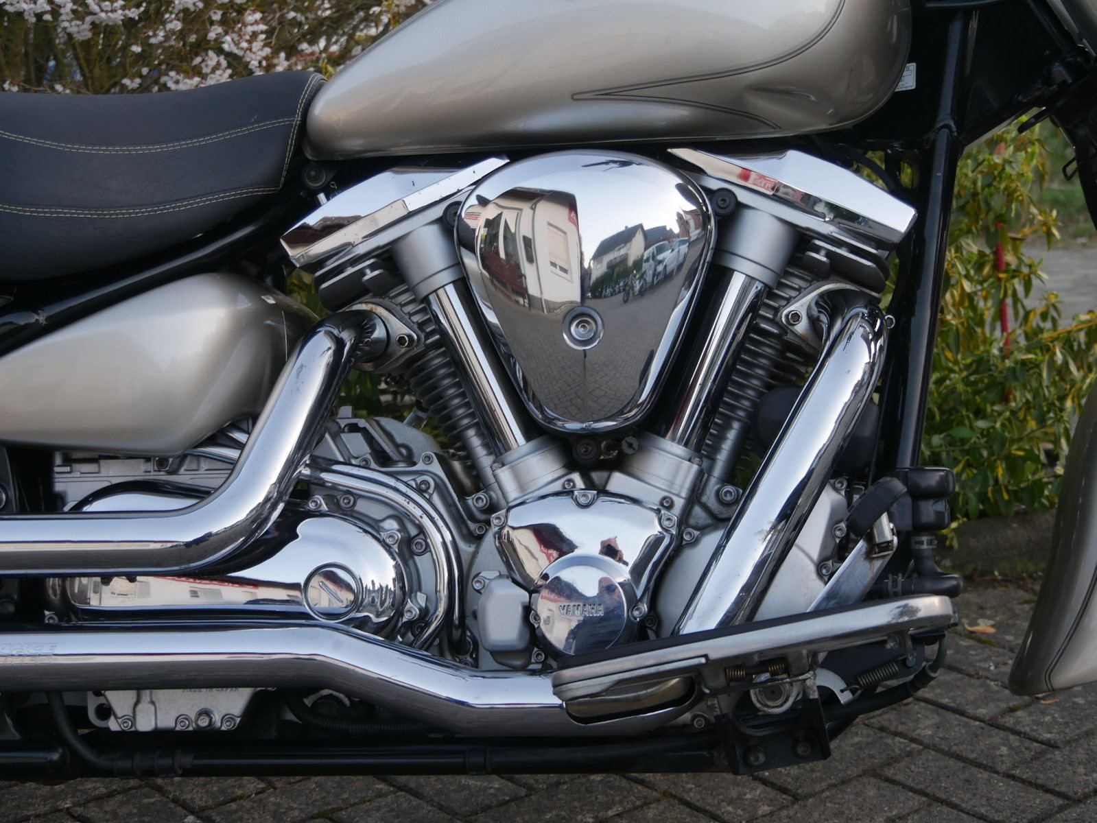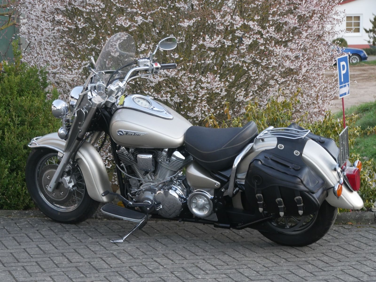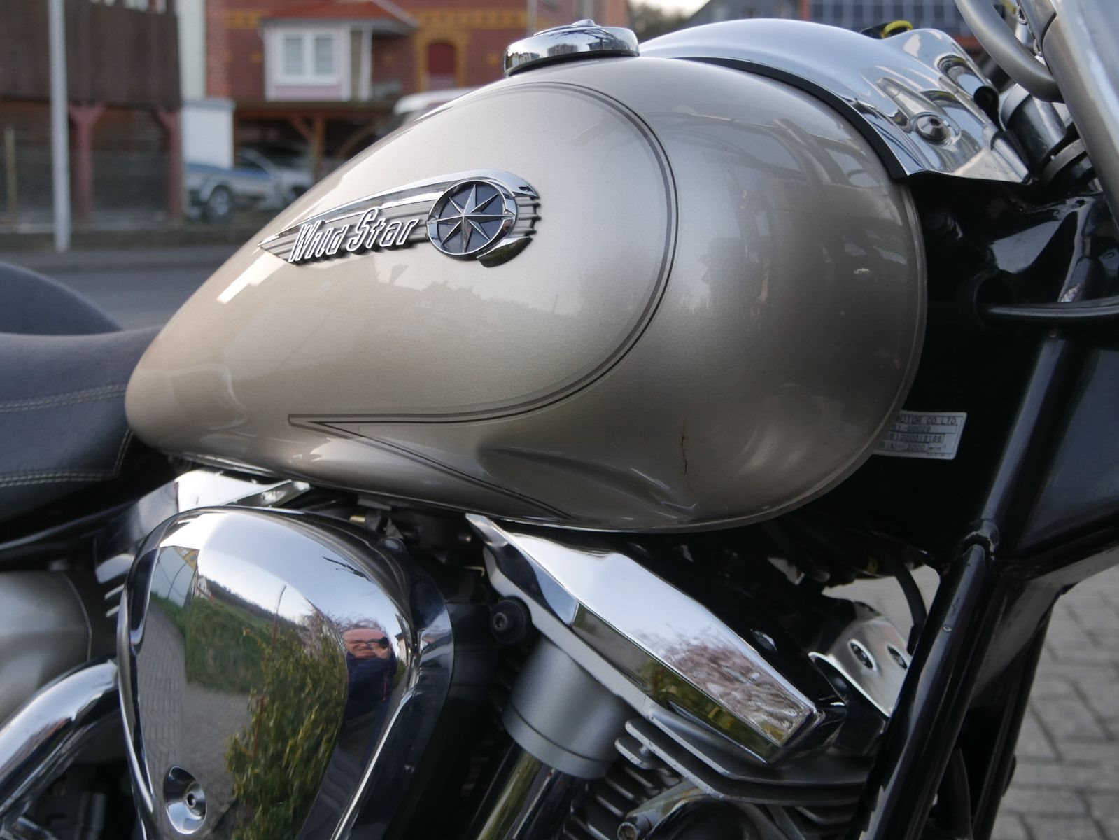 Yamaha Wild Star mit Windschild und Seitentaschen im Guten Zustand. Rechts unterhalb am Tank hat sie eine Delle ( siehe Foto ). Die letzte Inspektion war im Febraur 2023, bei 34.000km.