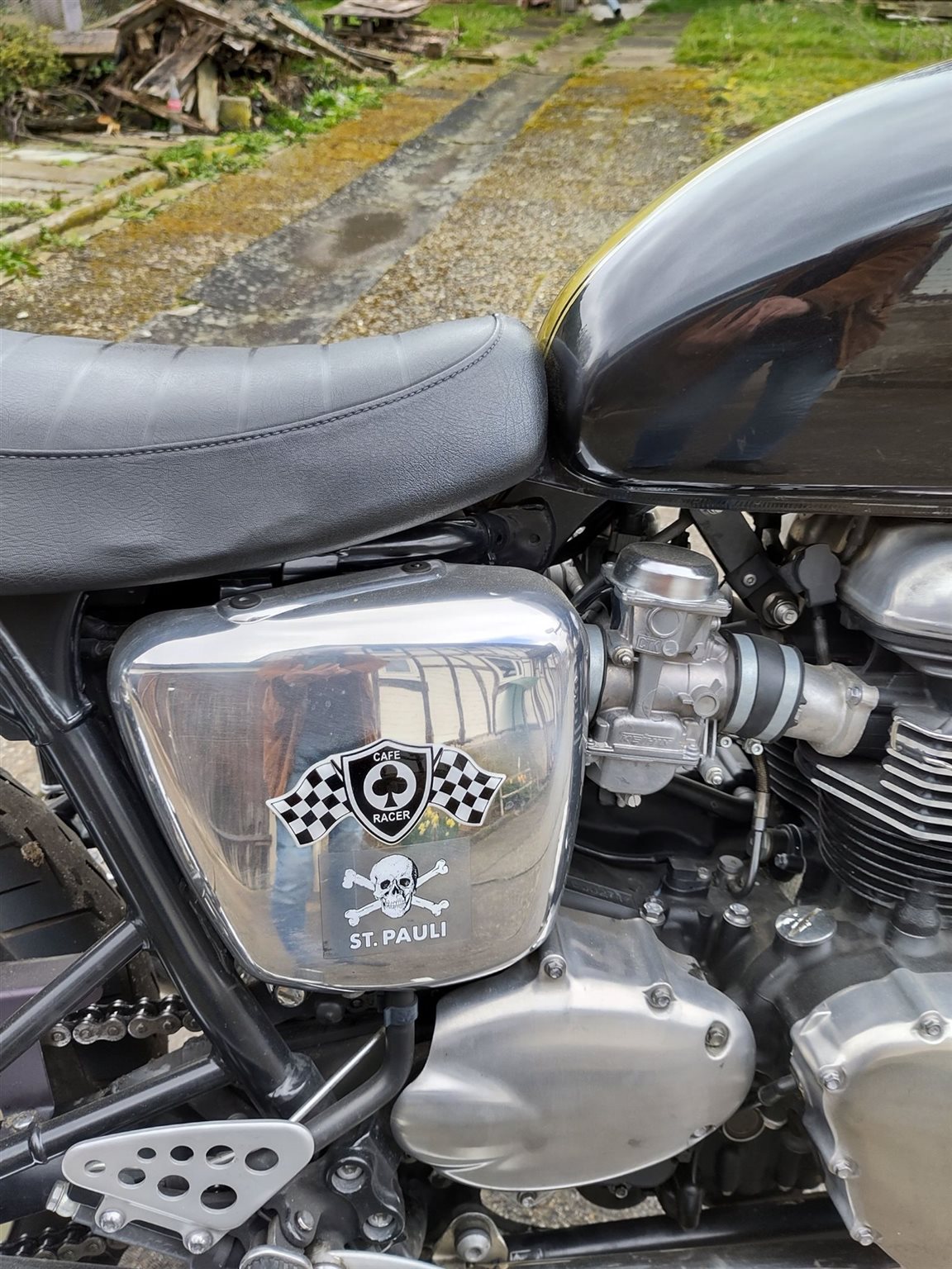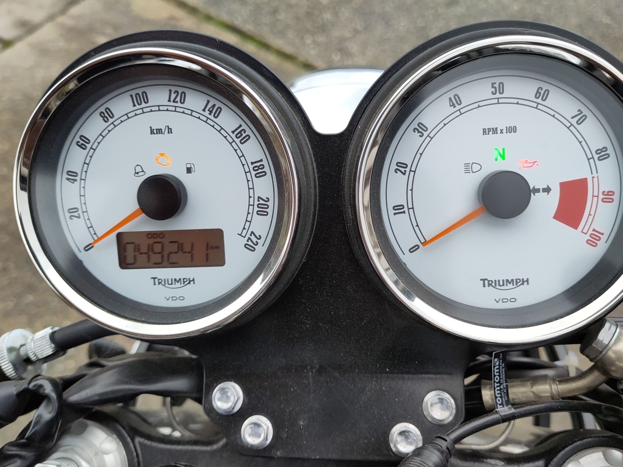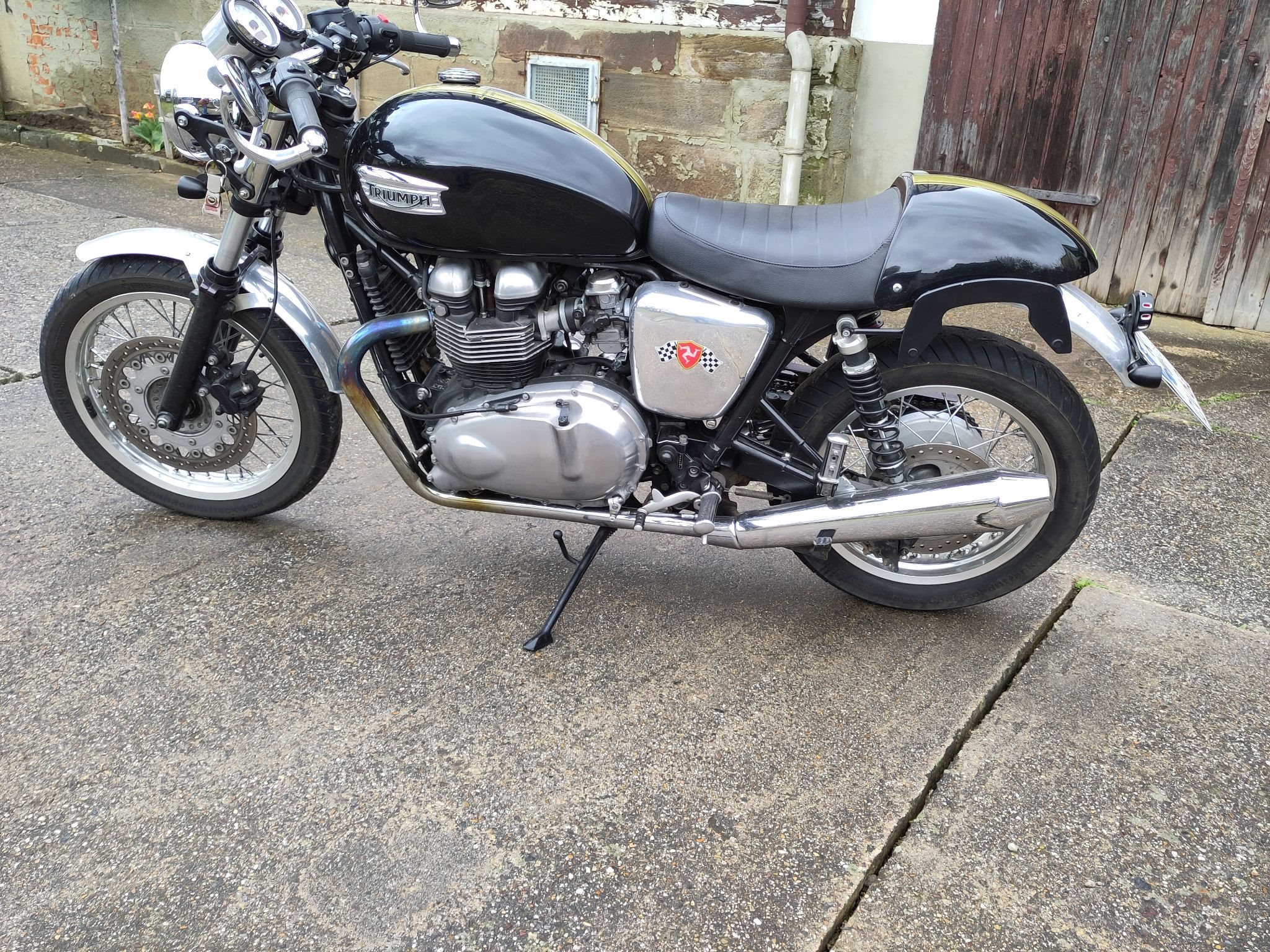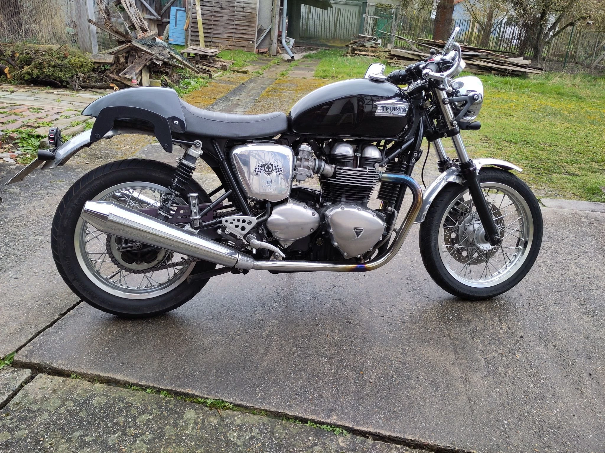 Wunderschöne Triumph Thruxton, Alle Plastikteile, Schutzbleche, Seitendeckel und Instrumentenbecher gegen Aluminiumteile von Classicbike Raisch getauscht. YSS Fahrwerk (Fork Upgrade Kit und Stoßdämpfer). Alle Arbeiten wurden von einem Triumph Händler durchgeführt. Kleiner Kratzer am Tank ( siehe Bild). C-Bow Träger und Softtaschen von Hepco Becker, Vorderreifen neu, Hinterreifen 50%.