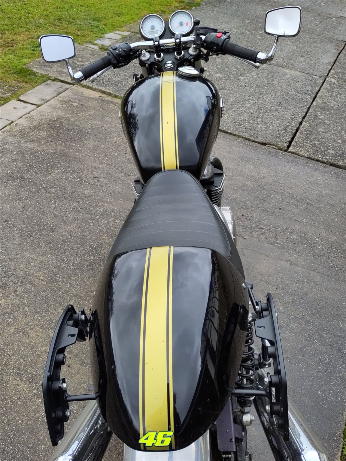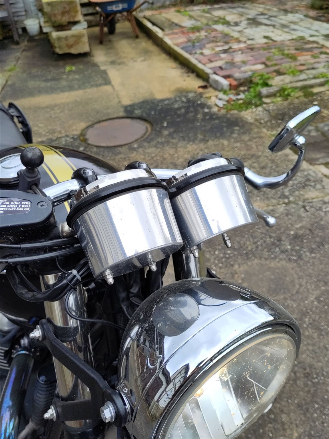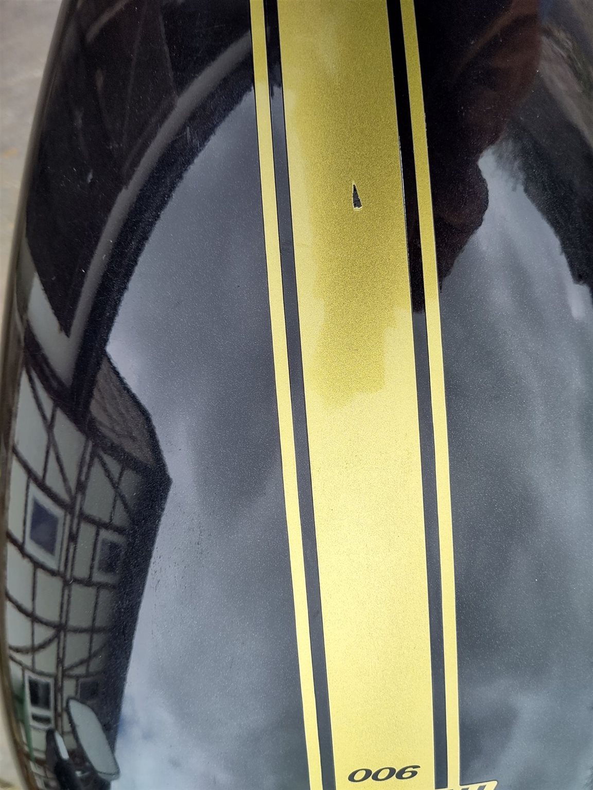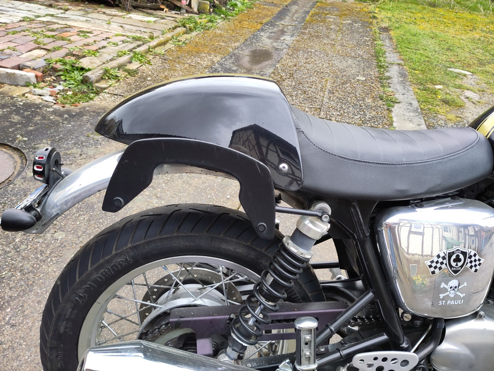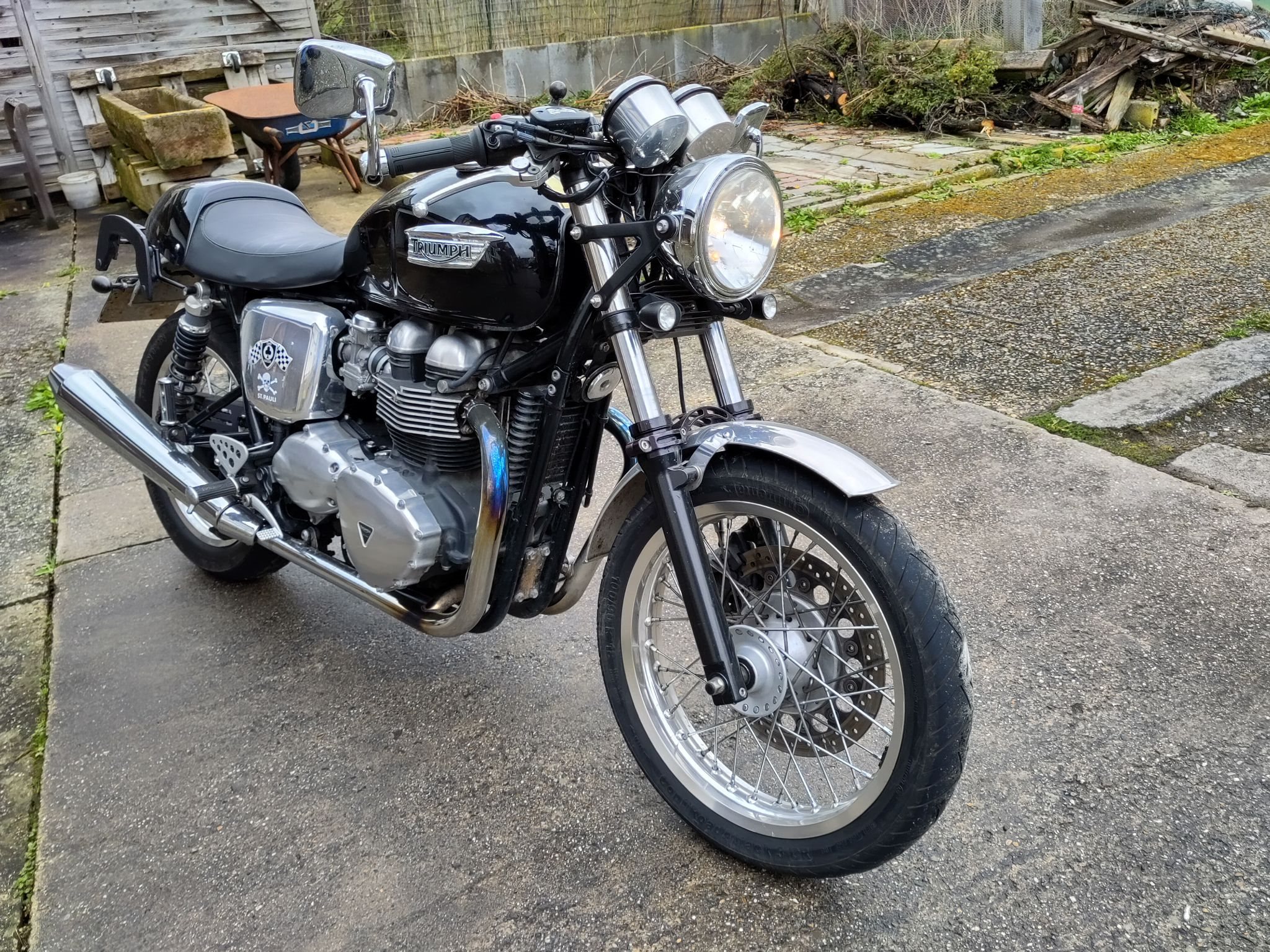 Wunderschöne Triumph Thruxton, Alle Plastikteile, Schutzbleche, Seitendeckel und Instrumentenbecher gegen Aluminiumteile von Classicbike Raisch getauscht. YSS Fahrwerk (Fork Upgrade Kit und Stoßdämpfer). Alle Arbeiten wurden von einem Triumph Händler durchgeführt. Kleiner Kratzer am Tank ( siehe Bild). C-Bow Träger und Softtaschen von Hepco Becker, Vorderreifen neu, Hinterreifen 50%.