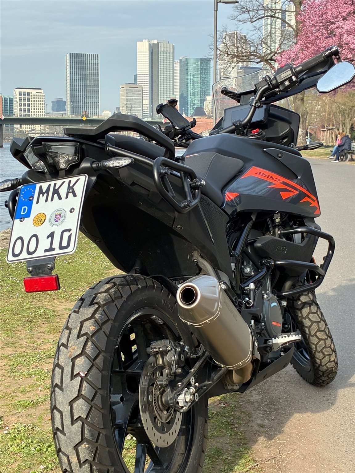 Die KTM 390 Adventure: eine leichte, wendige Reiseenduro mit 45 PS aus einem 390 cm Einzylinder-Motor. Sie wiegt fahrfertig 172 bis180 kg und bietet moderne Technik wie Kurven-ABS, Traktionskontrolle und TFT-Display. Ideal für Einsteiger. Pefekt für die City! Diese Maschine hat den höchsten Sattel und ist super geeignet für größere Fahrer (ich bin 1,90m und habe mich sehr wohl gefühlt.) Das Bike ist top in Schuss, hat regelmäßig Inspektion gehabt. Die beiden Koffer wurden nie benutzt, die Halterungen dafür sind montiert, man kann die Koffer einfach dranklippen. Momentan sind Lenkerspiegel dran (siehe Fotos), aber die Original Spiegel gibts narürlich dazu.