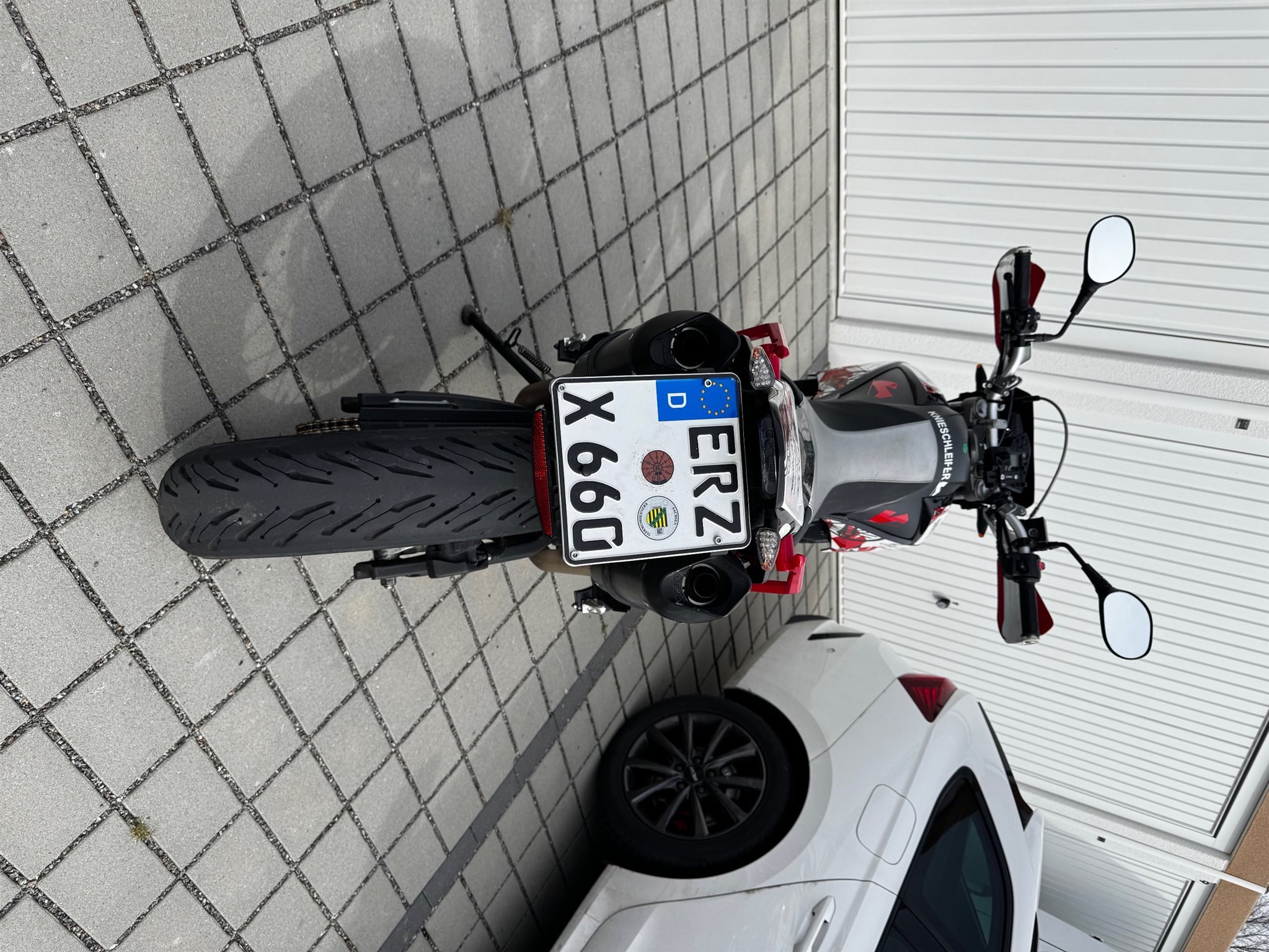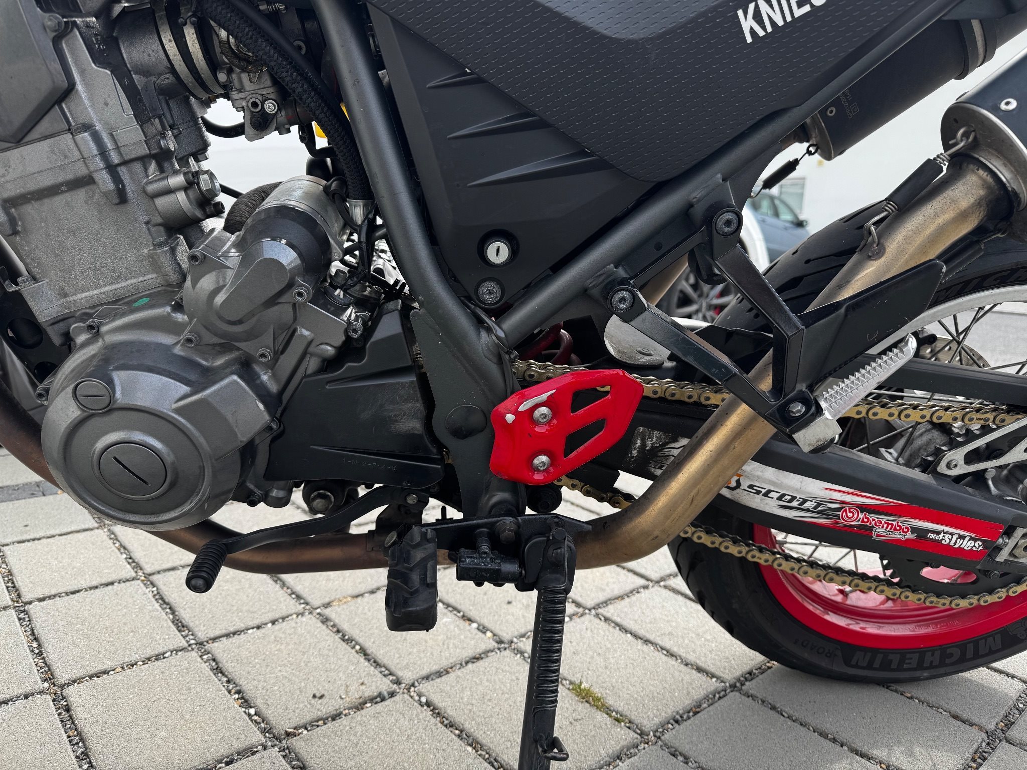 Der kernige GPR Sportauspuff sorgt für einen Sound, der unter die Haut geht. Der OTR Heckumbau, kurze Blinker mit individueller Einzelanfertigung, zweifarbige Felgen und markante Handguards machen sie zu einem echten Hingucker. Dieses Bike hebt sich garantiert von der Masse ab.