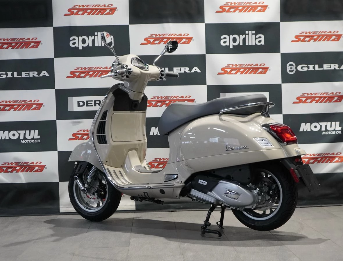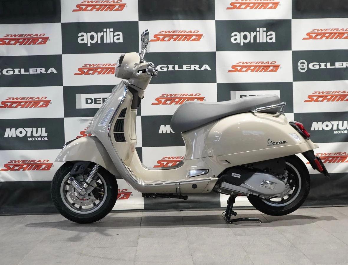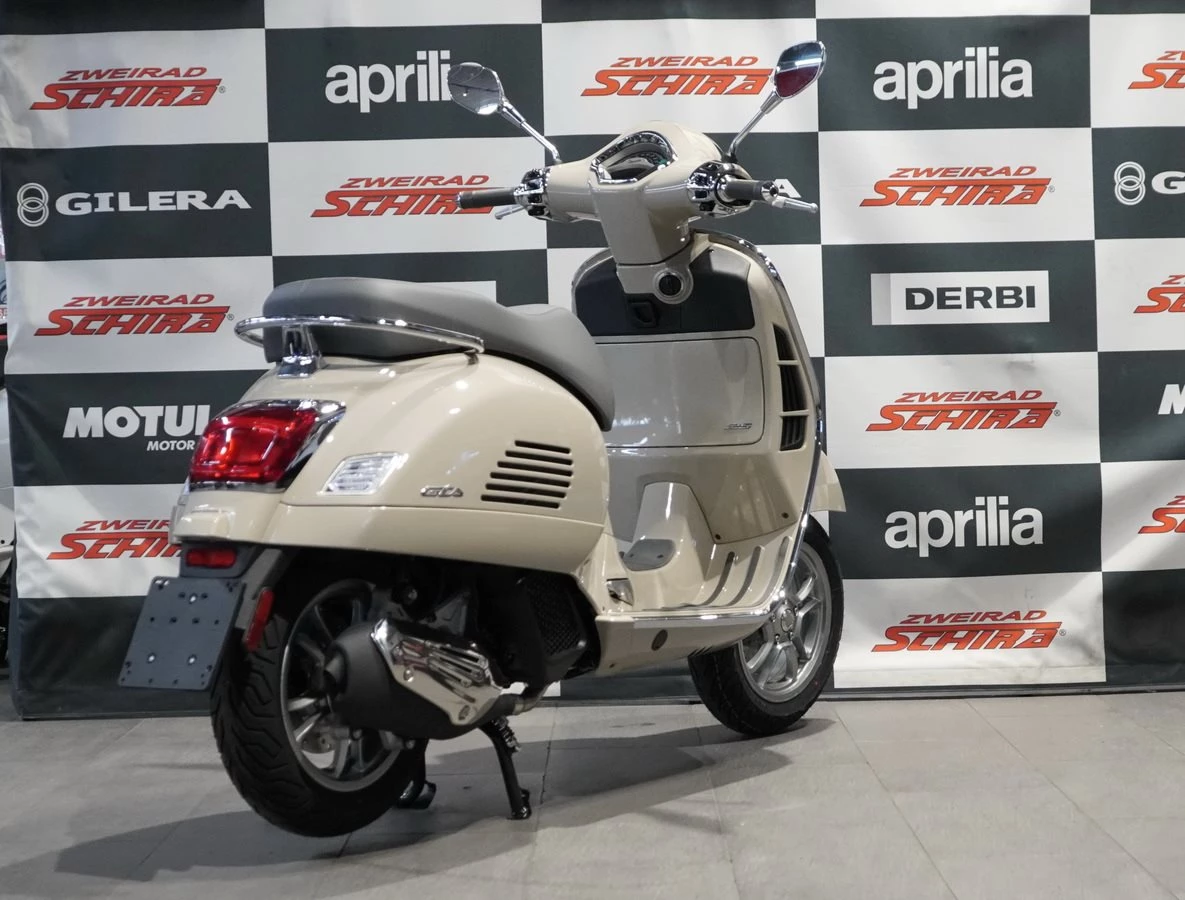 Die Vespa Gts ist bis ins kleinste Detail durchdacht. Die Metallic-Farben glänzen, Sitzbank und Interieur sind aufeinander abgestimmt, die Chromelemente sorgen für das gewisse Extra an Eleganz und natürlich trägt die berühmte Krawatte weiterhin zum Status der Vespa als zeitlose Ikone bei.
