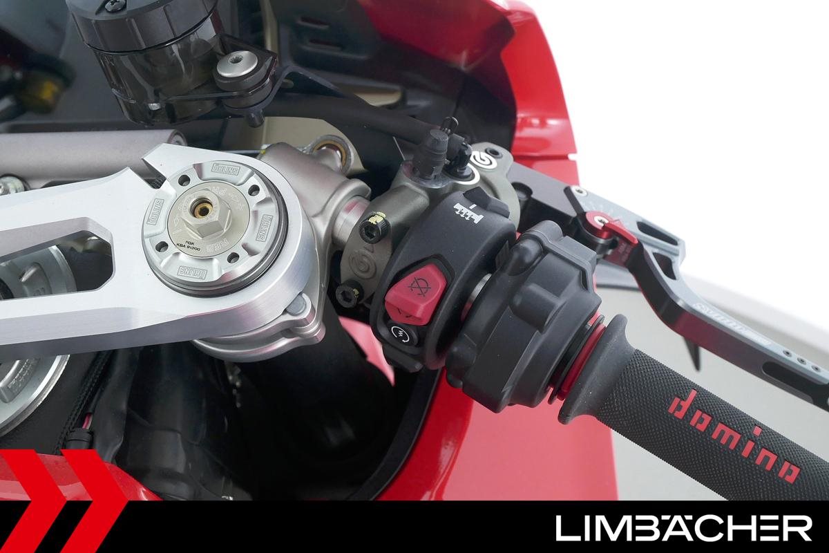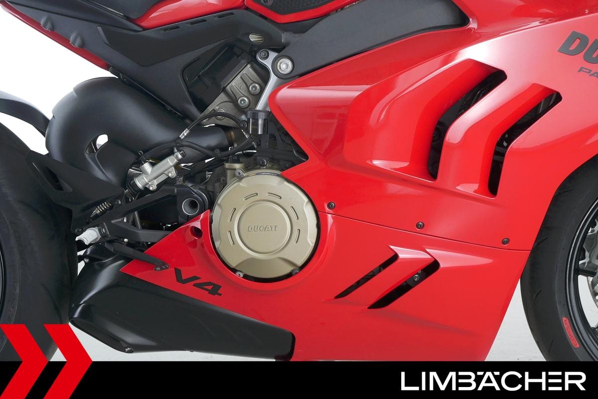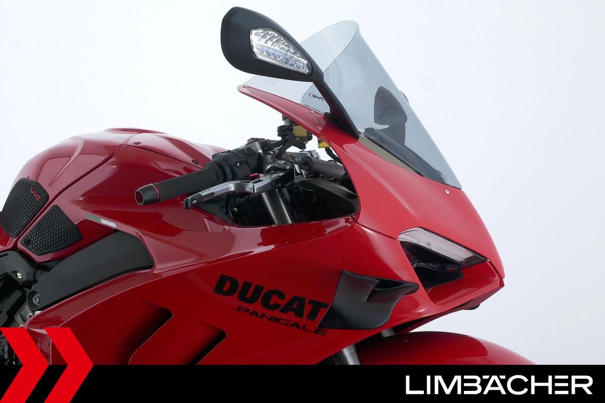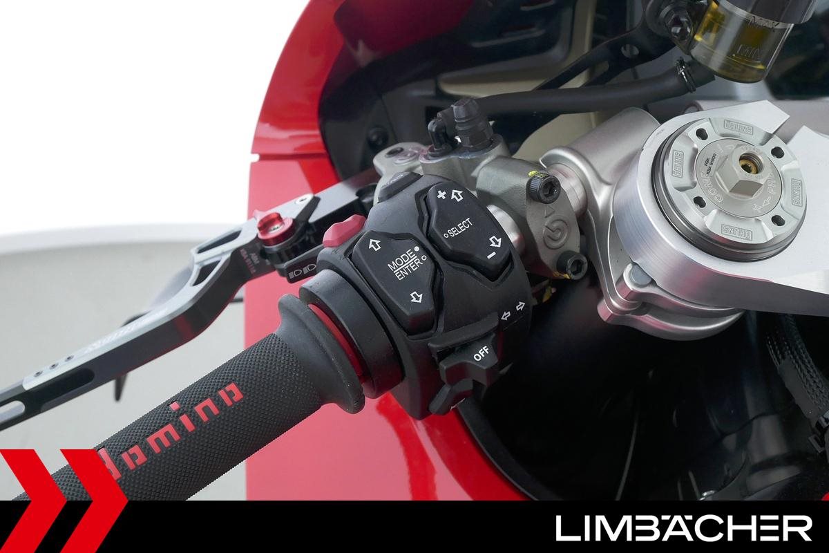 Eine Ducati Panigale V4 aus zweiter Hand in gepflegtem Zustand u.a. mit kurzem Kennzeichenhalter von Ducati Performance sowie Synto-Brems- und -Kupplungshebel.