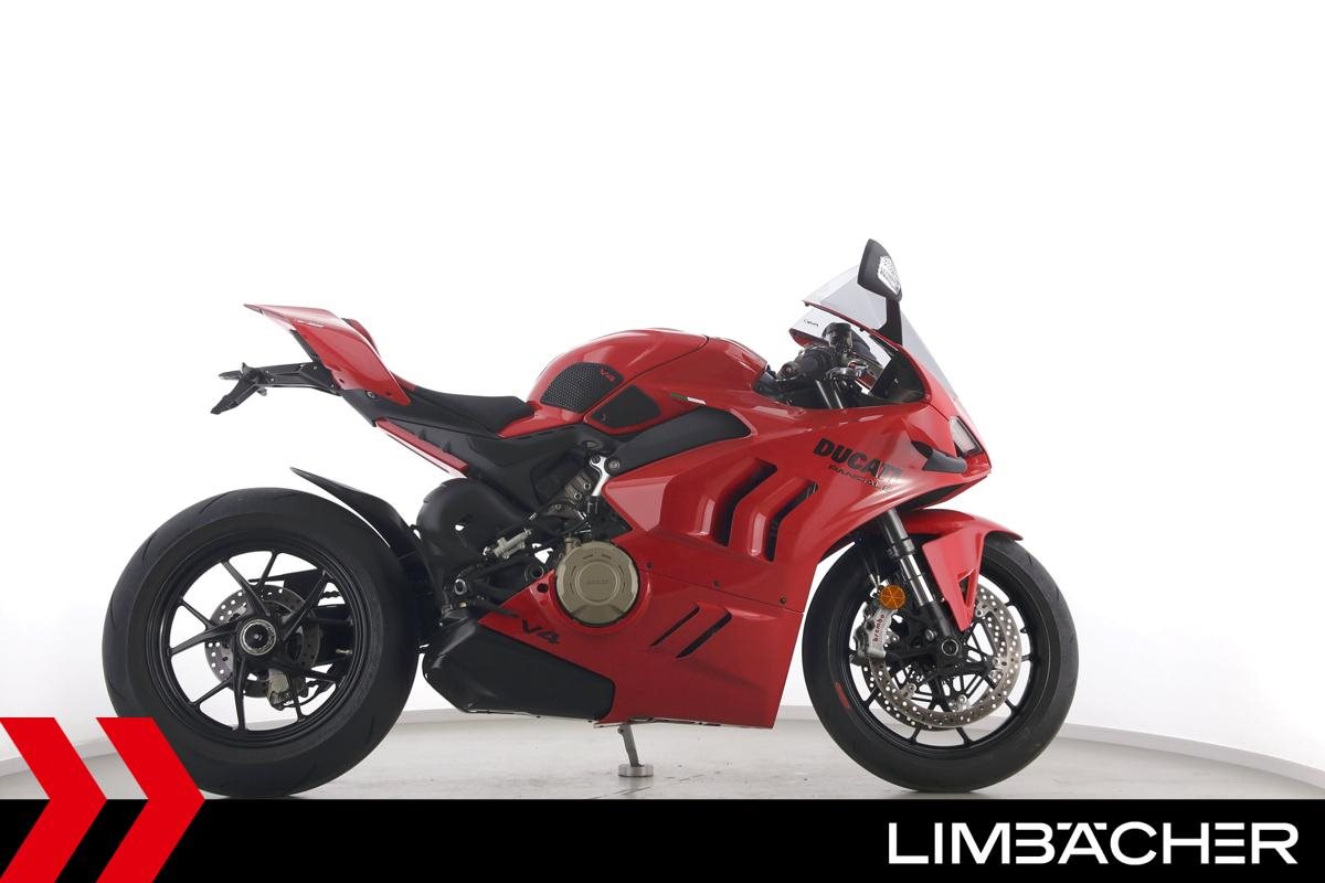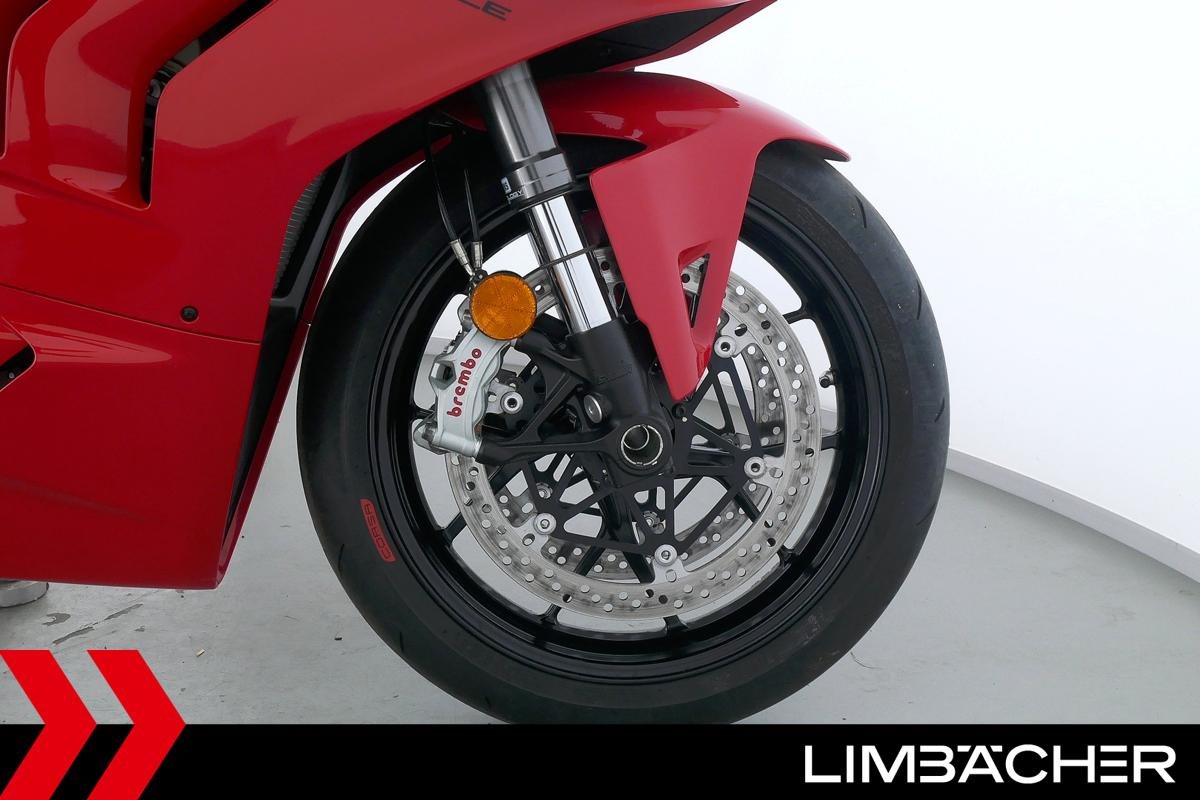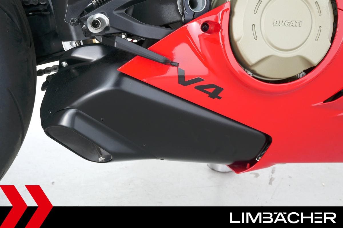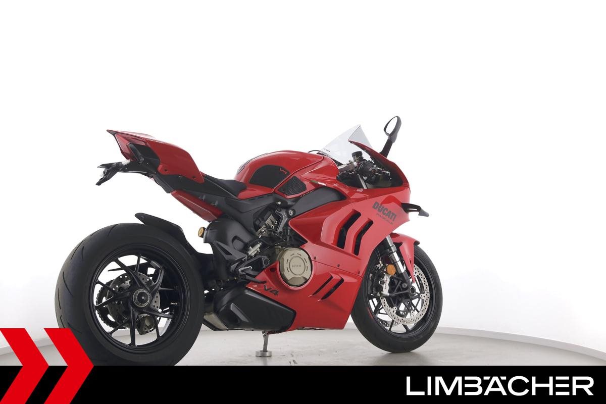 Eine Ducati Panigale V4 aus zweiter Hand in gepflegtem Zustand u.a. mit kurzem Kennzeichenhalter von Ducati Performance sowie Synto-Brems- und -Kupplungshebel.