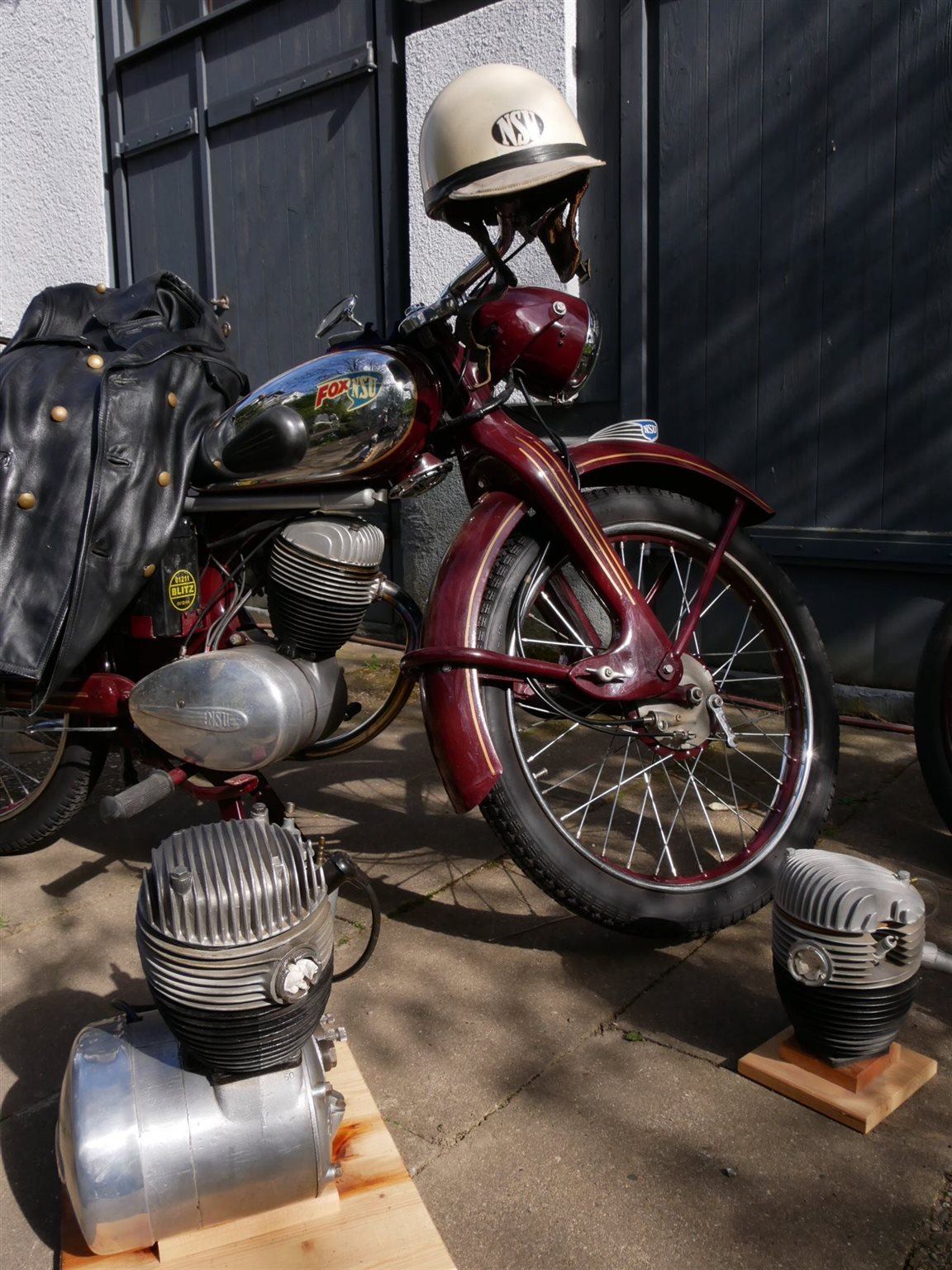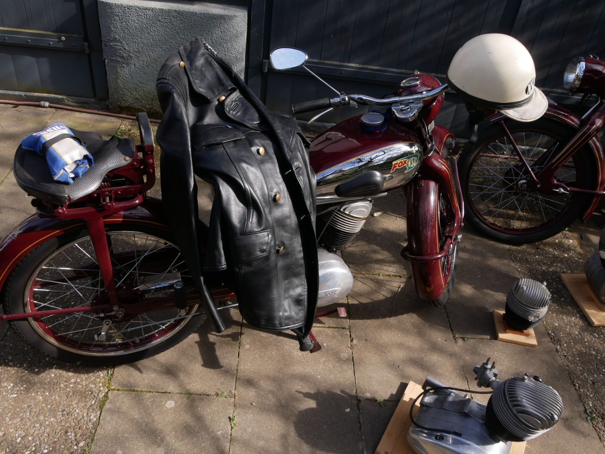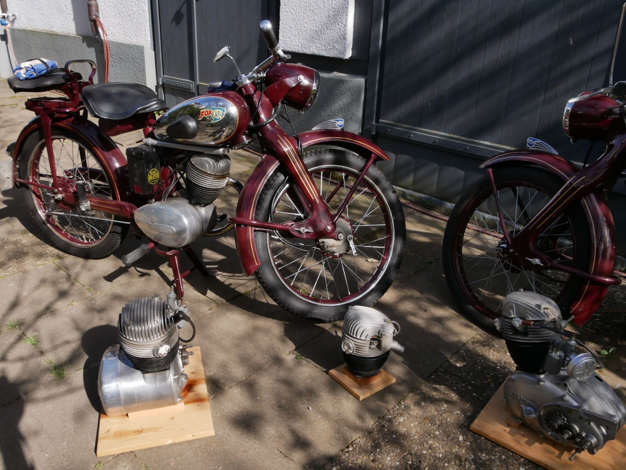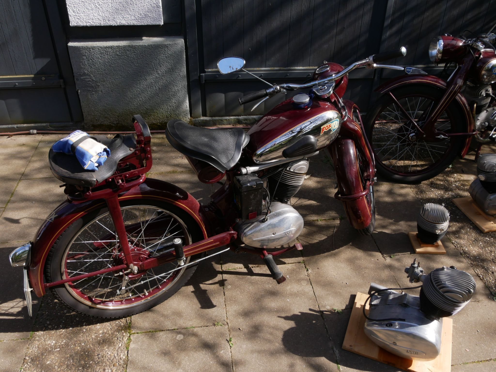 Fahrzeug und Motor wurden komplett neu aufgebaut, Exportfarbe bordeuxrot mit Goldlinierung, Soziussitz unbenutzt, Werkzeug, alter Helm, Lederjacke, Lederhose, Bücher über Foxmotorräder etc.