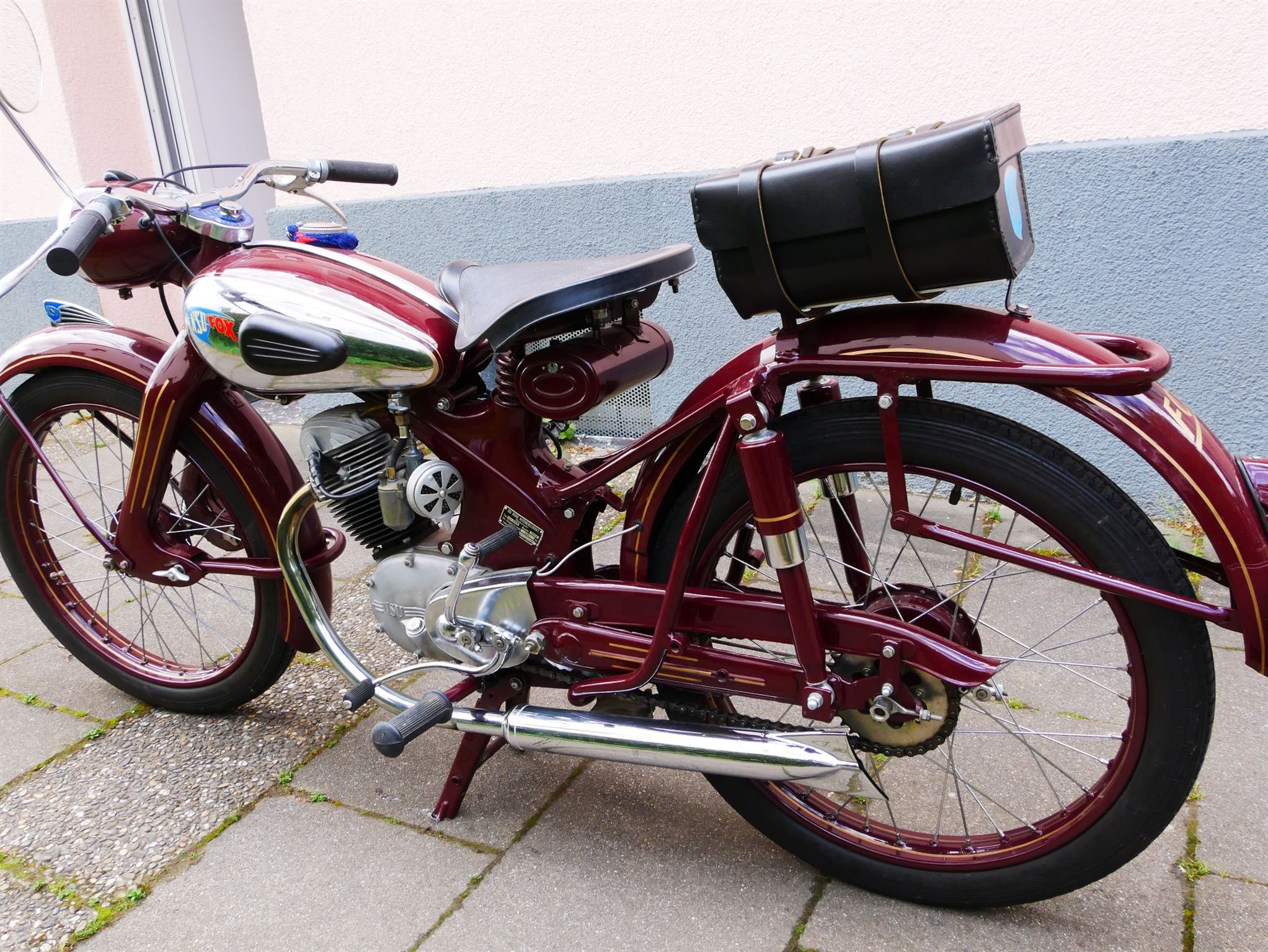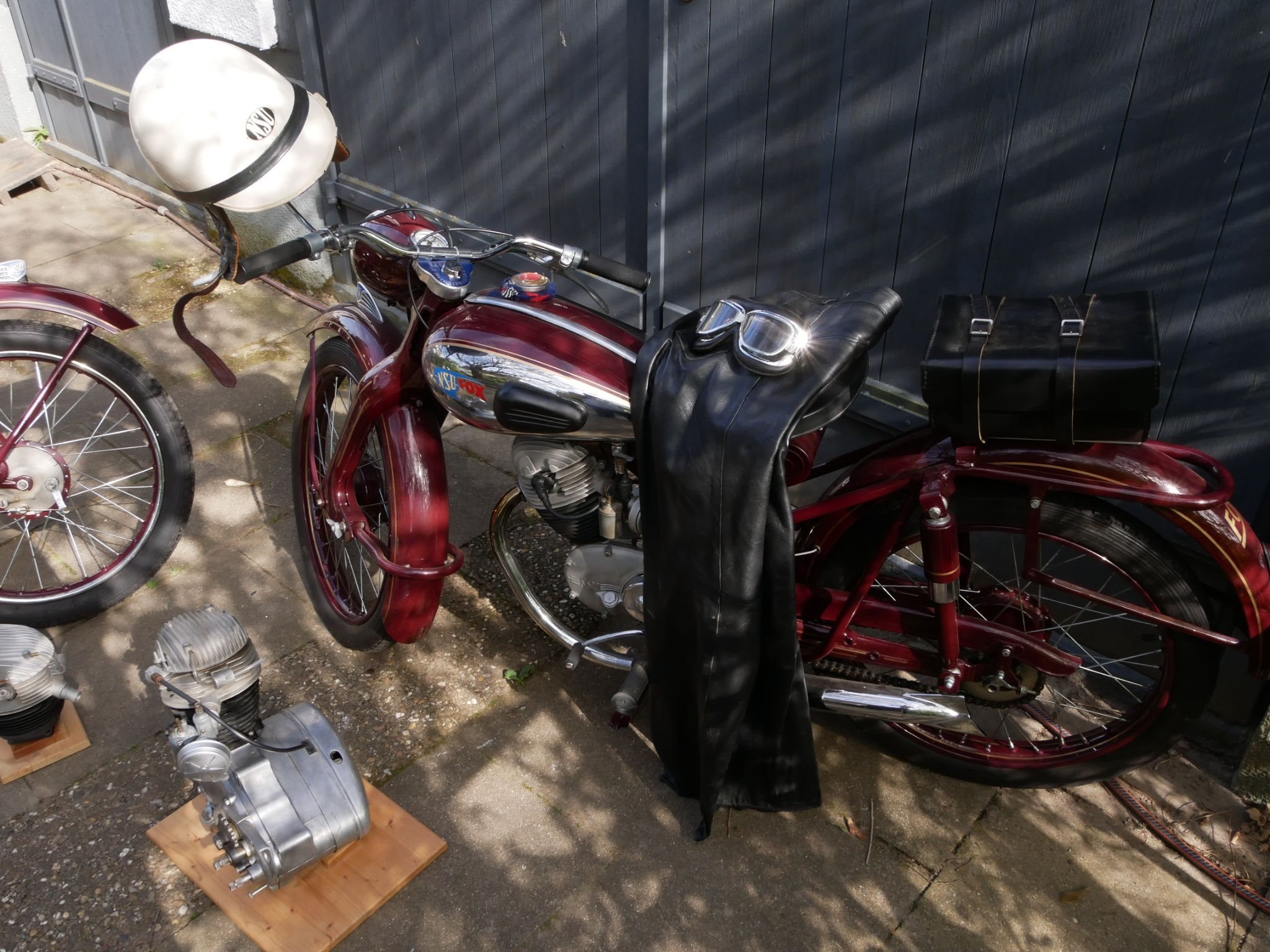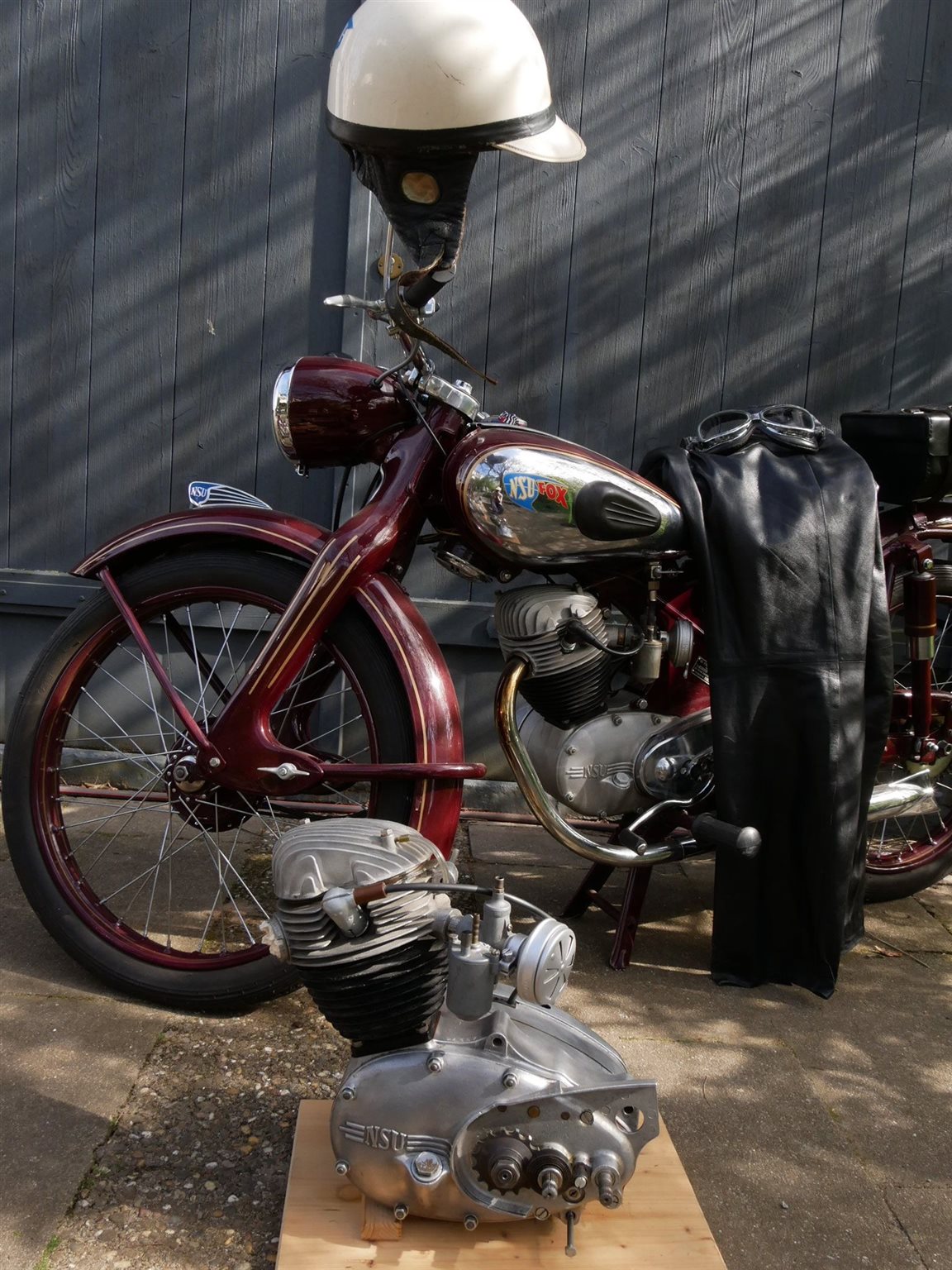 Fahrzeug und Motor wurden komplett neu aufgebaut, Exportfarbe bordeuxrot mit Goldlinierung, Soziussitz unbenutzt, Werkzeug, alter Helm, Lederjacke, Lederhose, Bücher über Foxmotorräder etc.