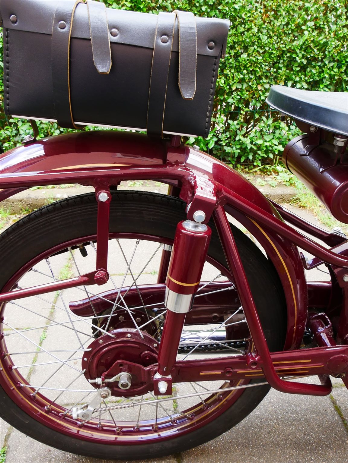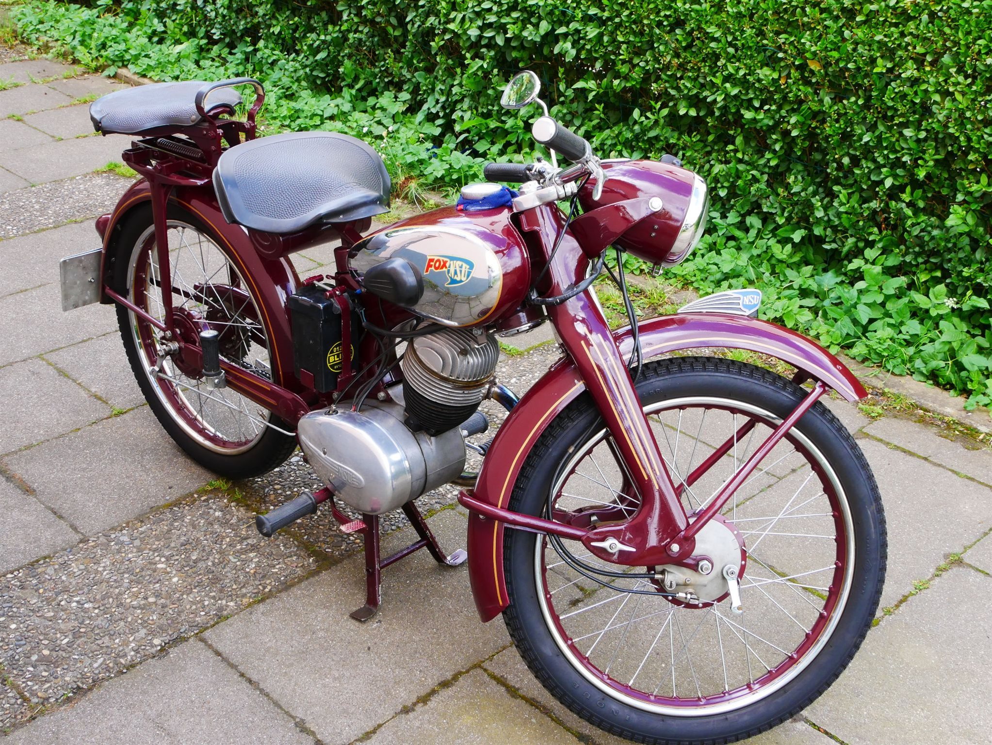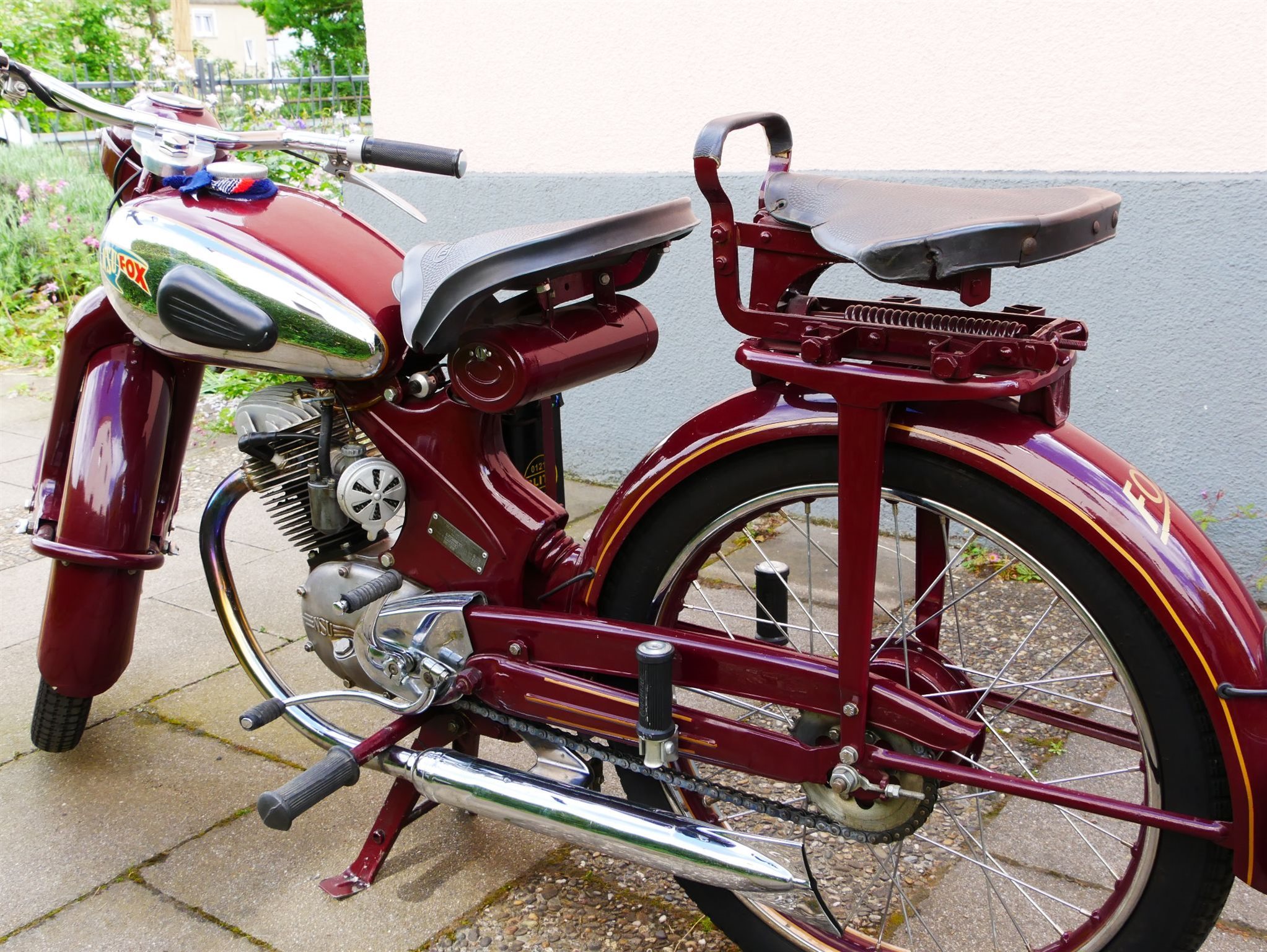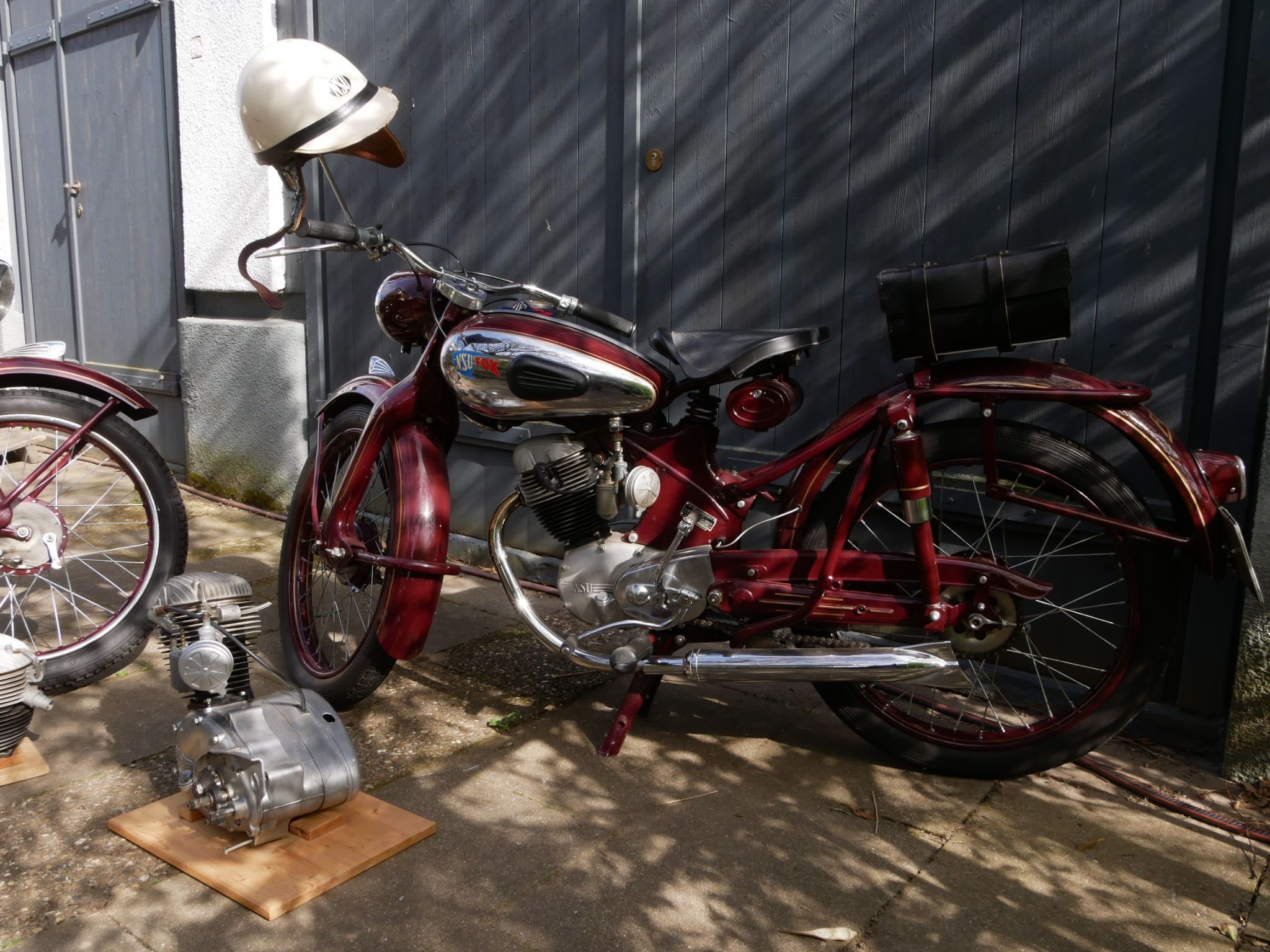Fahrzeug und Motor wurden komplett neu aufgebaut, Exportfarbe bordeuxrot mit Goldlinierung, Soziussitz unbenutzt, Werkzeug, alter Helm, Lederjacke, Lederhose, Bücher über Foxmotorräder etc.