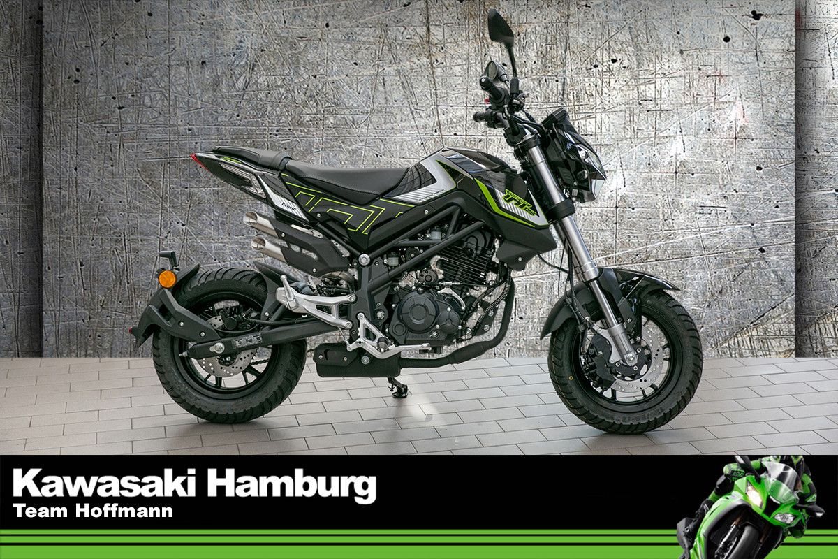 Befeuert von einem luftgekühlten 125 cm-Motor mit 2 Zündkerzen und ausgestattet mit fortschrittlicher Federung, einem verwindungssteifen Stahlrahmen, Leichtmetallfelgen, Scheibenbremsen, Allwetterreifen zaubert dieses rassige Naked-Bike allen ein Grinsen auf die Lippen.
