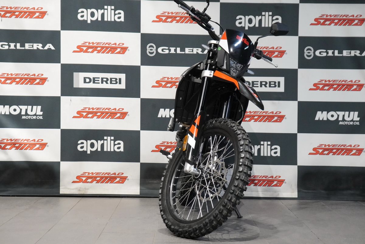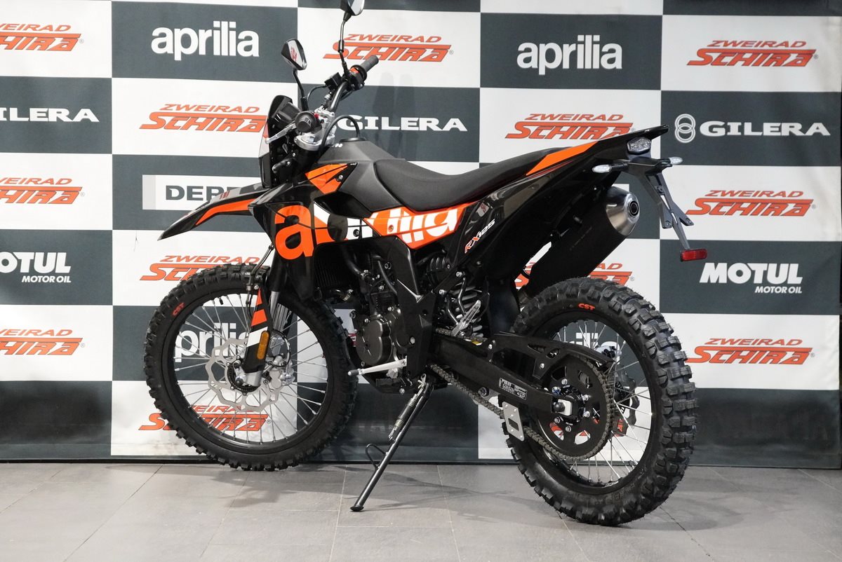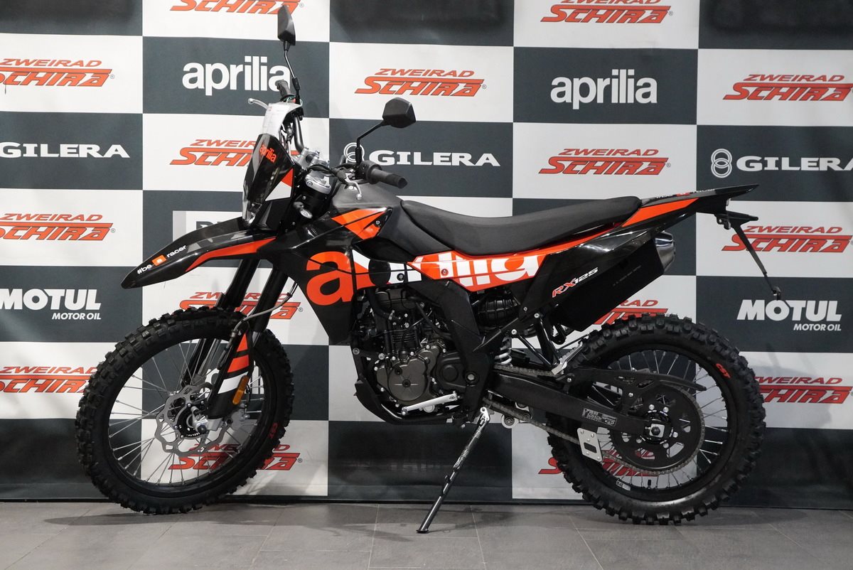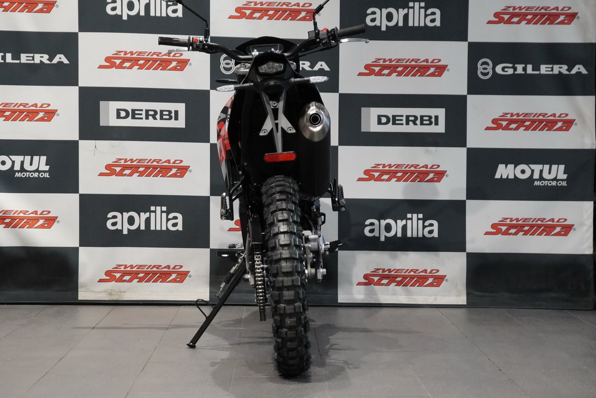 Das Design der Aprilia RX 125 ist schnittig und minimalistisch, mit scharfen Linien, die sich von vorne bis hinten erstrecken und ihre Rennsport-DNA betonen. Der mattschwarze Auspuff fügt sich nahtlos in den glänzend schwarzen Rahmen, den Lenker, den Motor und die Schwinge ein. Die eloxierten, glänzend schwarzen Räder, die für echte Offroad-Leistung ausgelegt sind (21 vorne, 18 hinten), sorgen in Kombination mit den Stollenreifen für optimale Kontrolle und Traktion auf jedem Gelände.