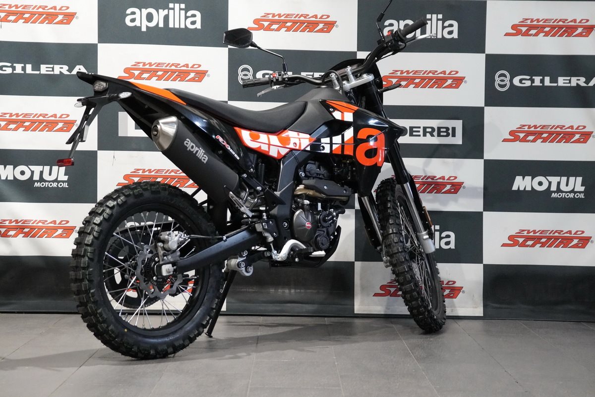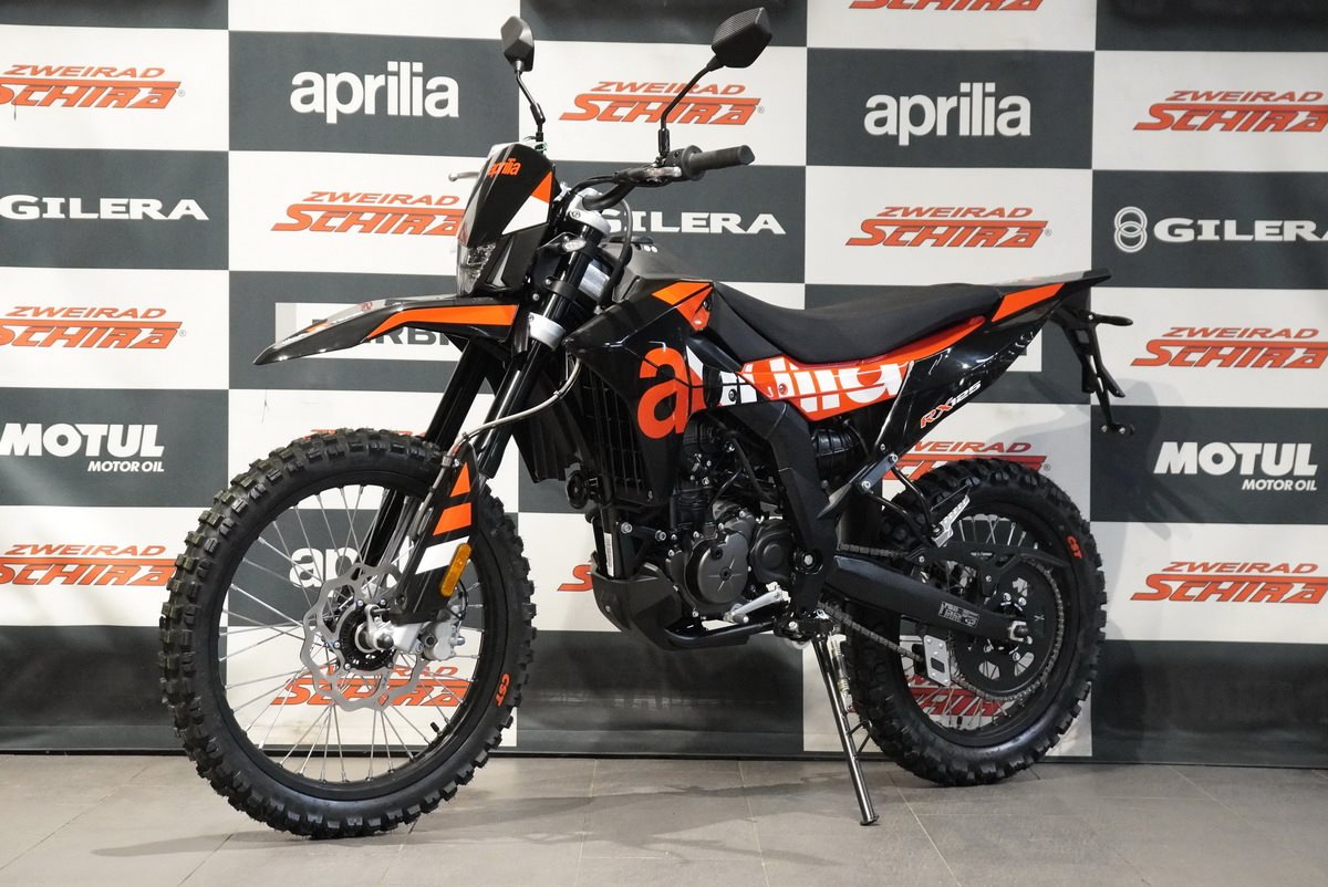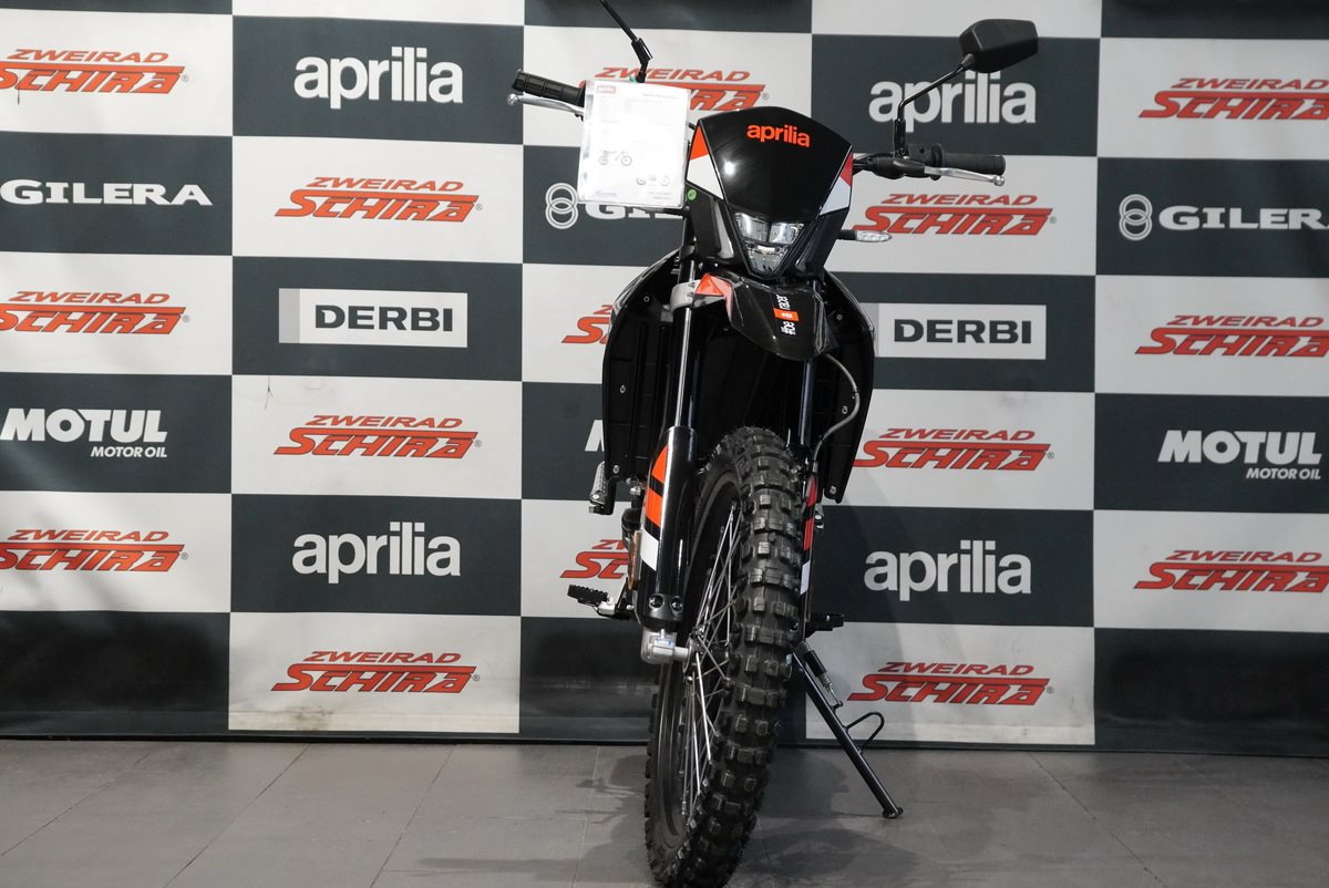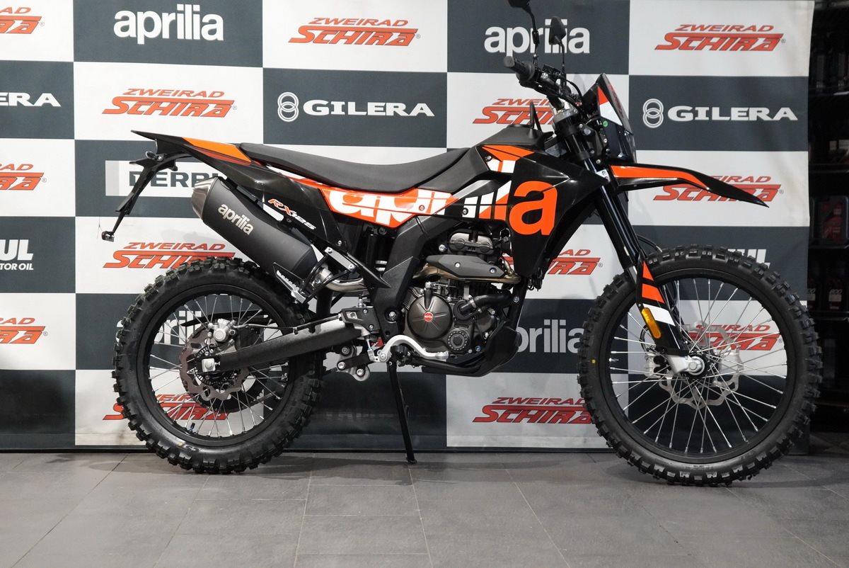 Das Design der Aprilia RX 125 ist schnittig und minimalistisch, mit scharfen Linien, die sich von vorne bis hinten erstrecken und ihre Rennsport-DNA betonen. Der mattschwarze Auspuff fügt sich nahtlos in den glänzend schwarzen Rahmen, den Lenker, den Motor und die Schwinge ein. Die eloxierten, glänzend schwarzen Räder, die für echte Offroad-Leistung ausgelegt sind (21 vorne, 18 hinten), sorgen in Kombination mit den Stollenreifen für optimale Kontrolle und Traktion auf jedem Gelände.