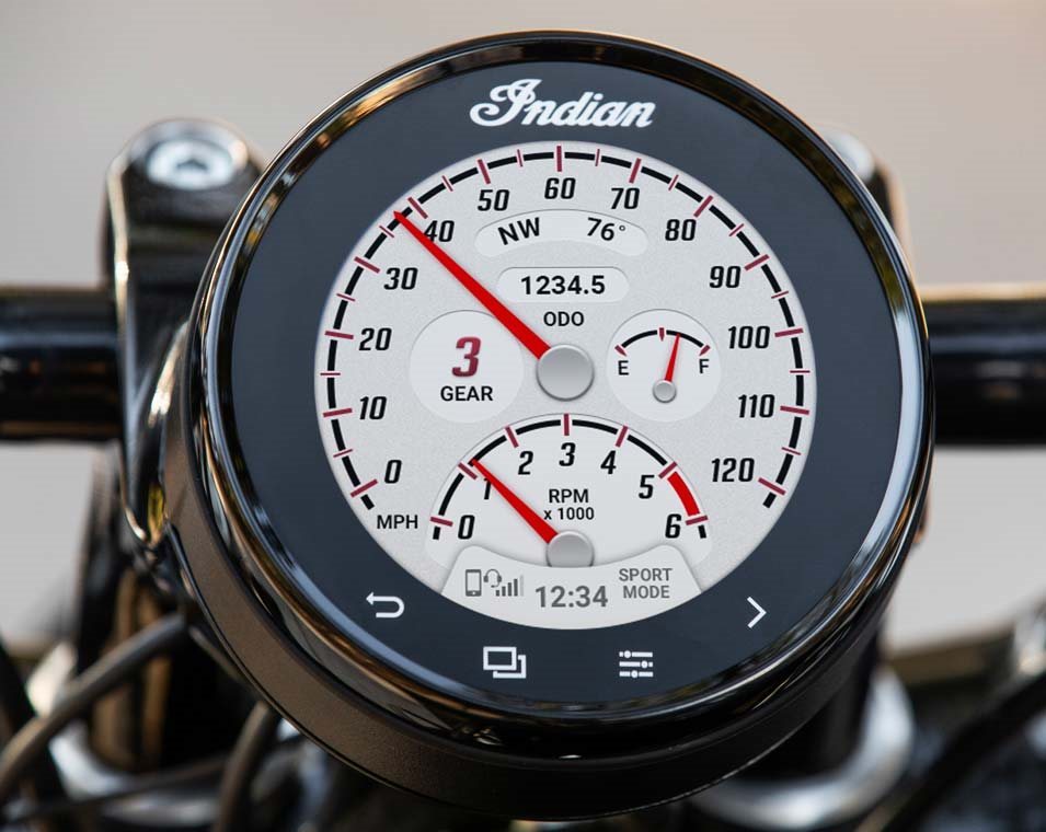 Der 4" große Touchscreen bietet eine klassische Ästhetik, indem er sich als analoges Instrument tarnt. Du kannst ihn als Drehzahlmesser und Tacho nutzen, aber er bietet auch Pfeil-Navigation, steuert die Fahrmodi, lässt dich Anrufe annehmen und ablehnen und deine Musik von jedem mit Bluetooth verbundenen Gerät steuern.