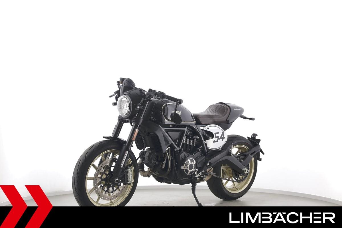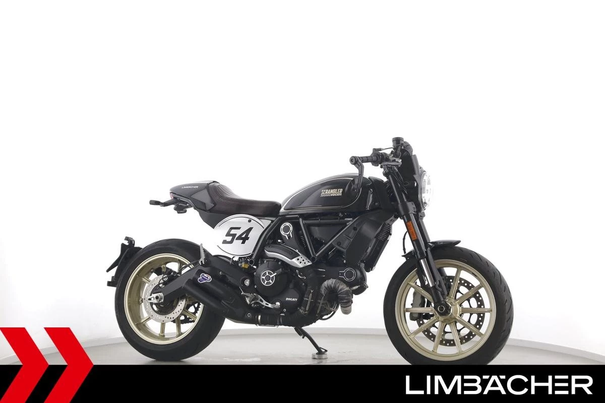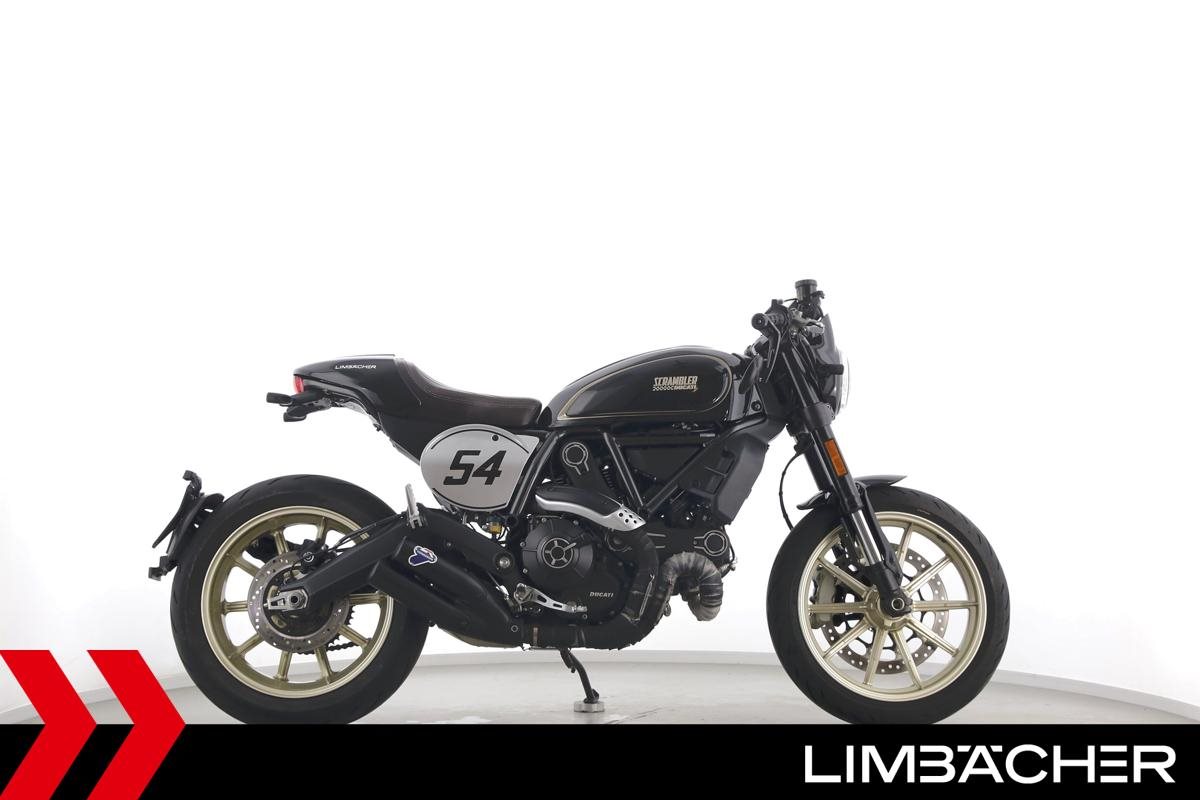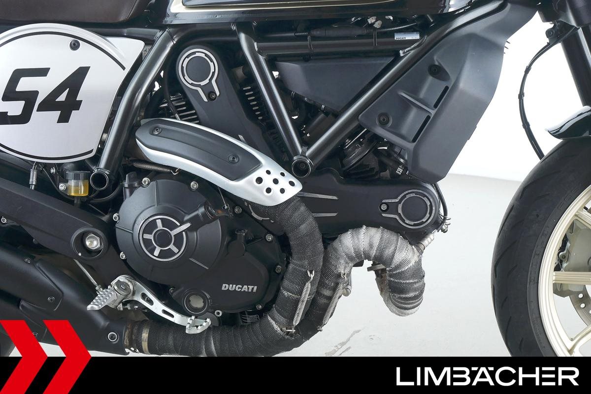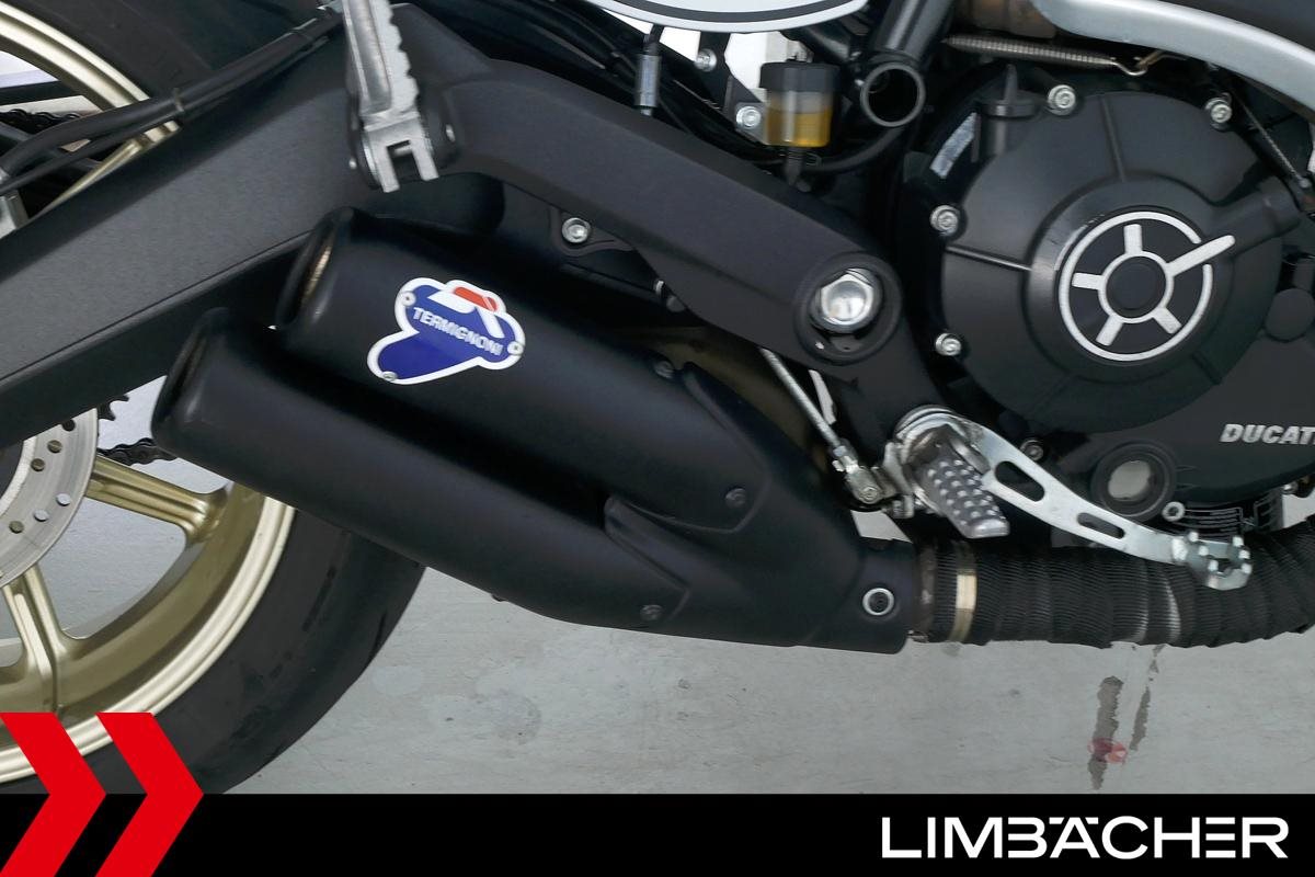 Eine scheckheftgepflegte Ducati Scrambler Café Racer aus zweiter Hand in sehr gepflegtem Zustand u.a. mit Termignoni-Endschalldämpfer sowie Scrambler-LED-Blinkern.