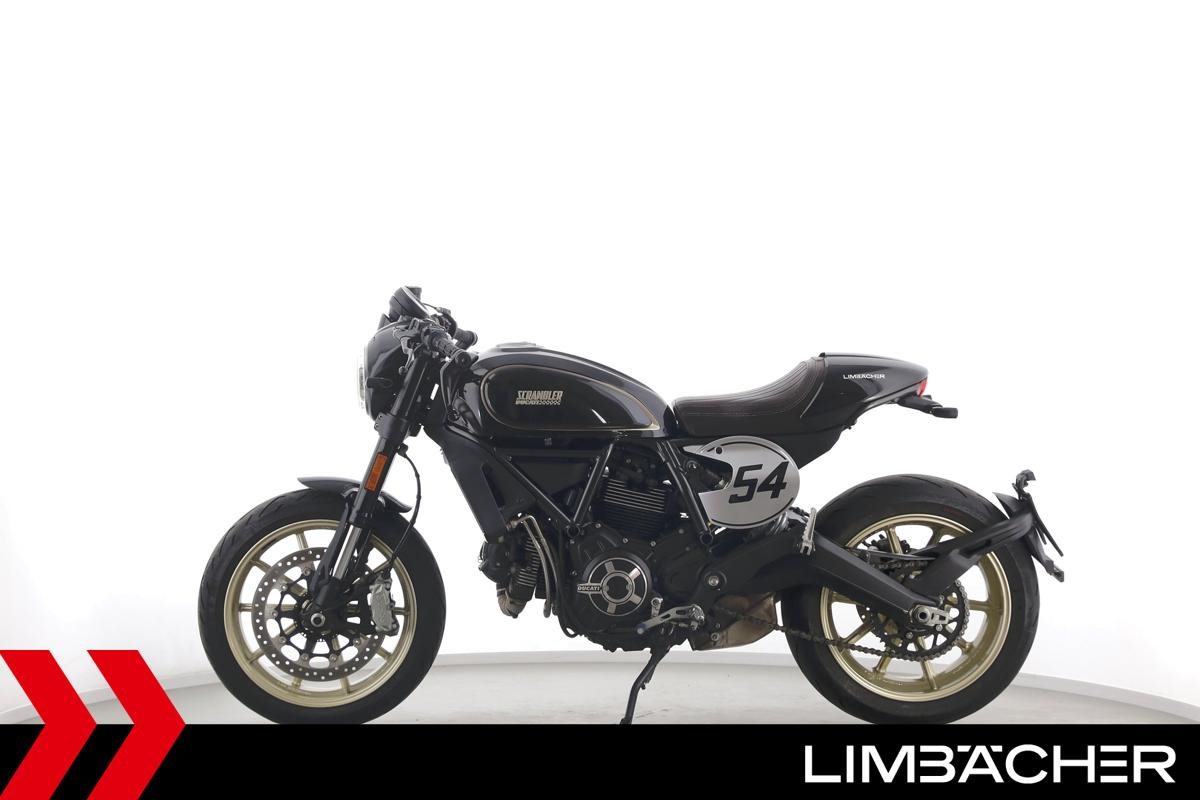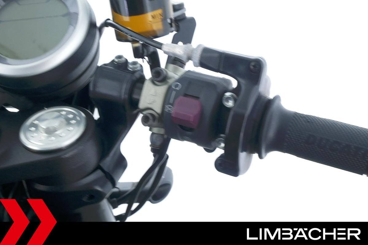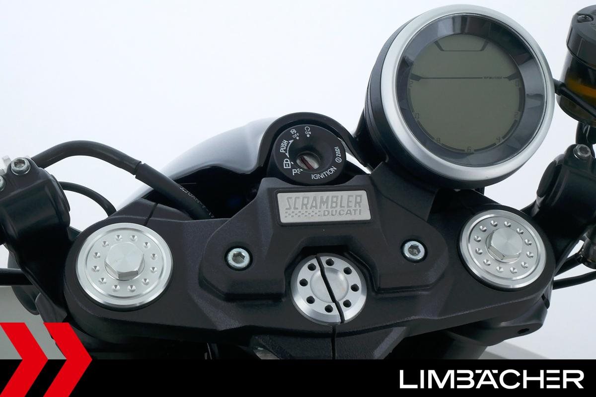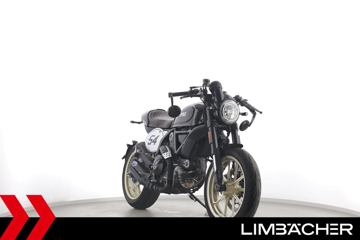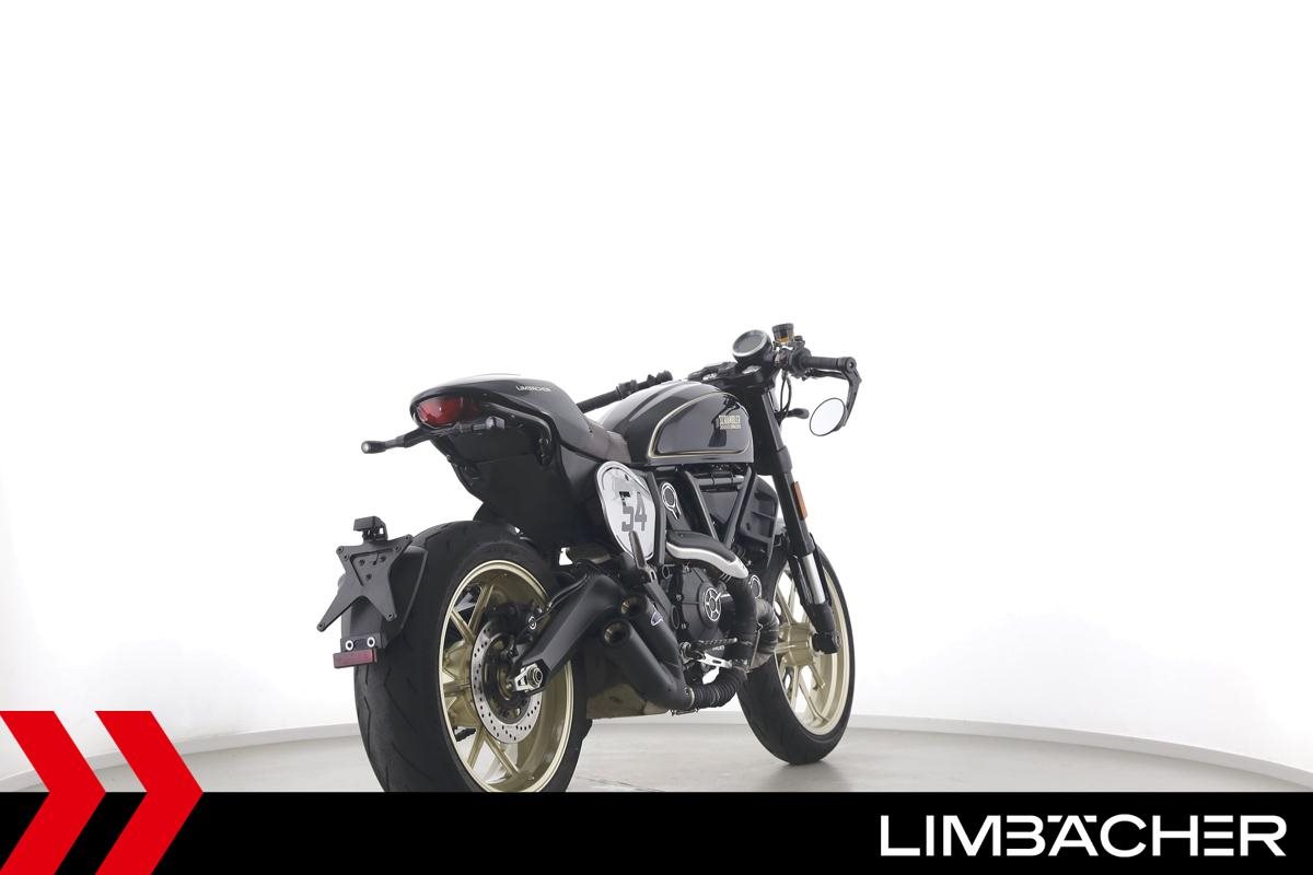 Eine scheckheftgepflegte Ducati Scrambler Café Racer aus zweiter Hand in sehr gepflegtem Zustand u.a. mit Termignoni-Endschalldämpfer sowie Scrambler-LED-Blinkern.