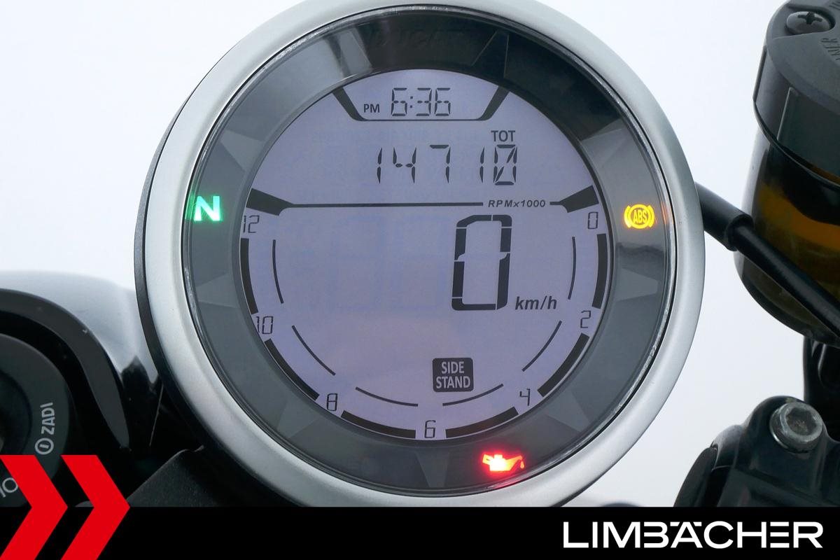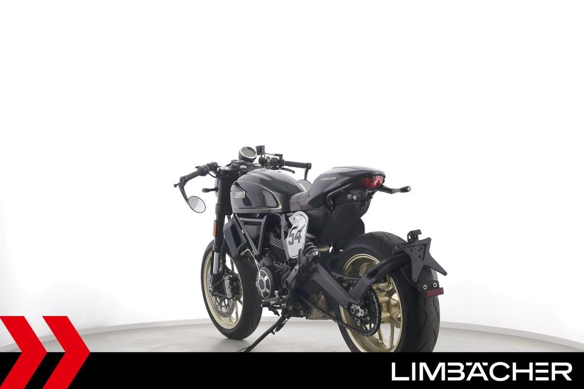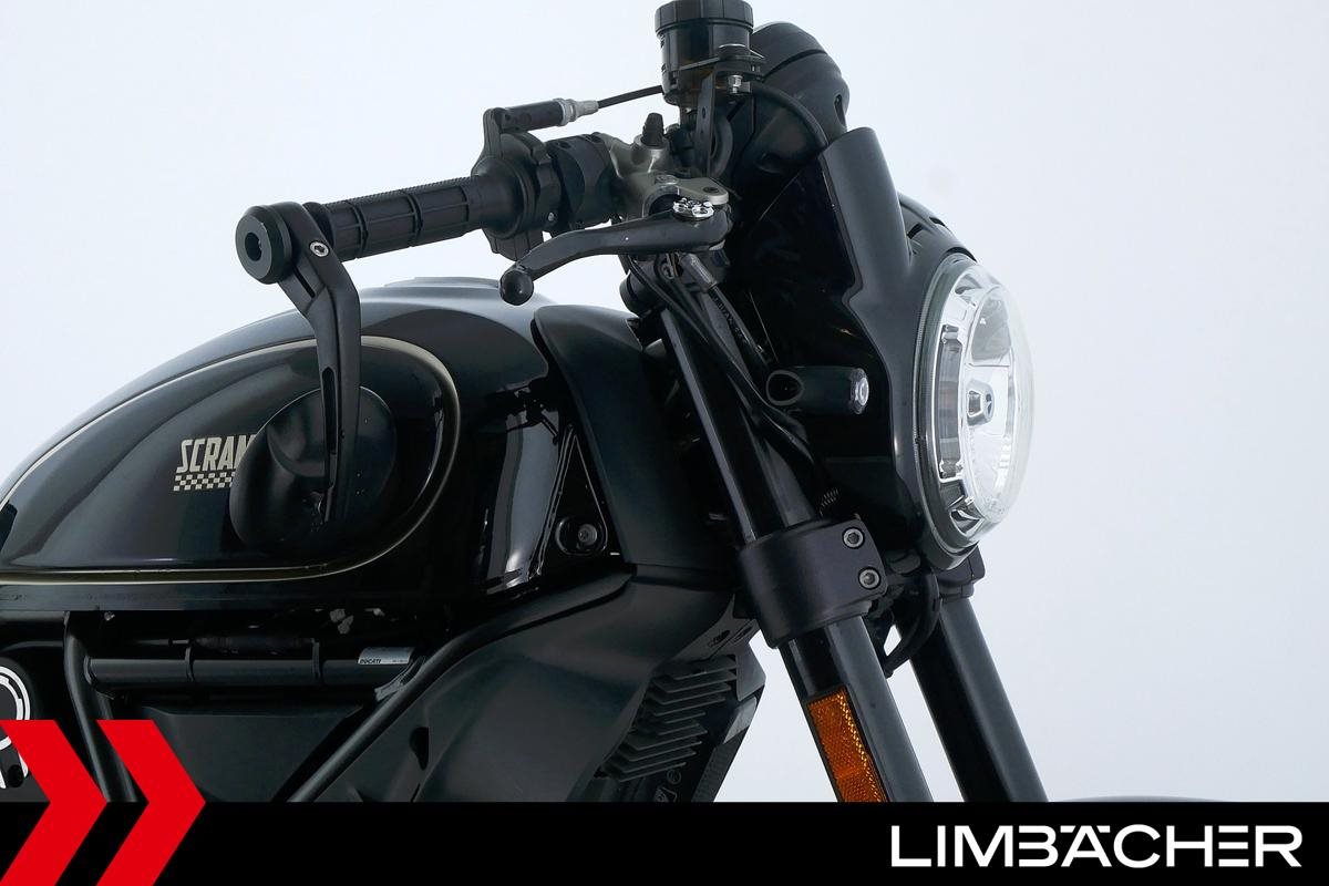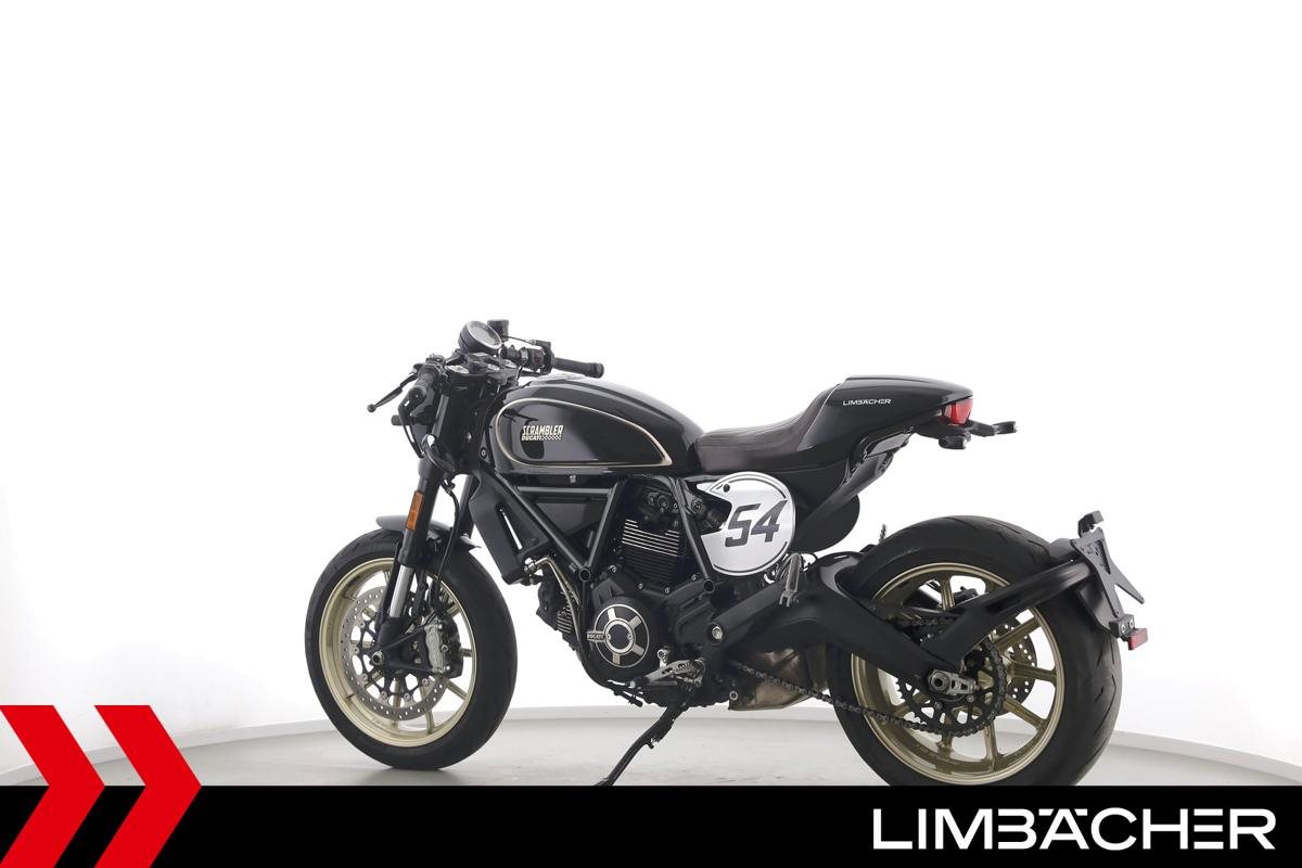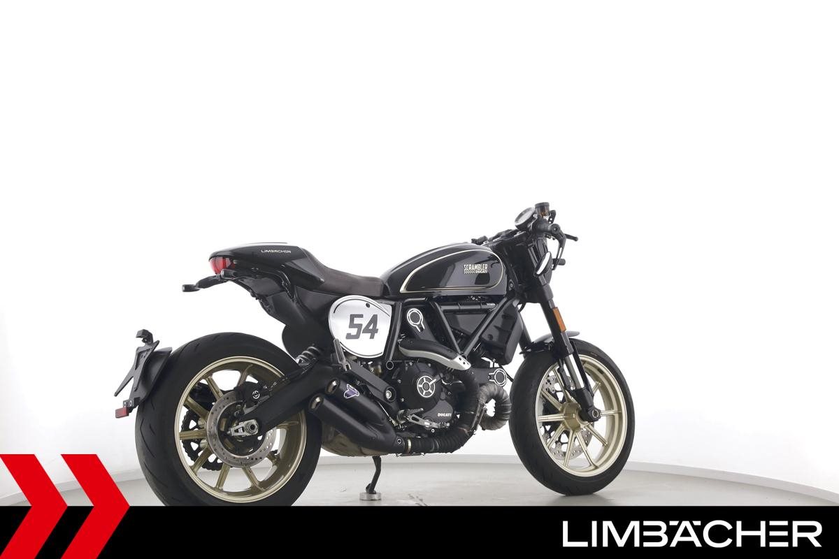 Eine scheckheftgepflegte Ducati Scrambler Café Racer aus zweiter Hand in sehr gepflegtem Zustand u.a. mit Termignoni-Endschalldämpfer sowie Scrambler-LED-Blinkern.