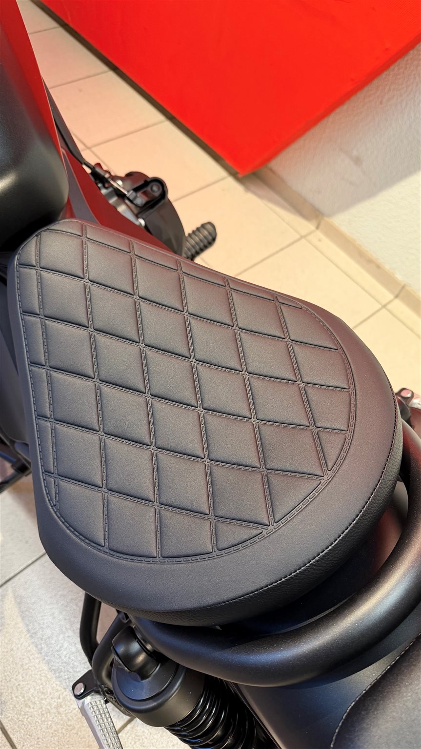 S-Version mit Frontverkleidung, Gabelabdeckungen und spezieller Sitzbank im Diamond-Stitch-Design