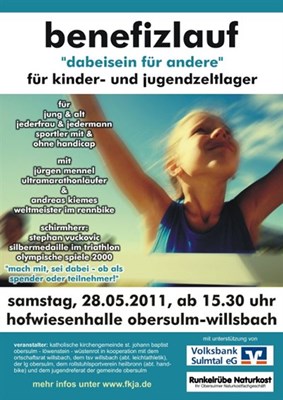 Am 28. Mai findet in Obersulm Willsbach ein Benefizlauf zugunsten der Kinder und Jugendarbeit statt. Zusätzlich gibt es eine Tombola mit tollen Preisen gestiftet von Firmen aus dem Weinsberger Tal. Preise unter anderem: Buggy fahren, Quad Touren, Schokoladen Fondue Gerät, Restaurant Gutscheine. Dazu kommen Einkaufs Gutscheine von Metzgereien, Weingütern, Bäckereien, Kfz Werkstatt sowie Waren Gutscheine für Fahrzeug kauf, Wellness Gutscheine, Pedelec/E-Fahrad fahren und vieles mehr.