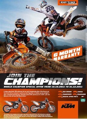KTM gibt auf alle vom 10.10.2011 bis 31.12.2011 gekauften 250 und 350 SX-F 2012 6 Monate Garantie, statt der bisherigen 30 Tage. KTM unterstreicht damit die Qualität der aktuellen Motorräder und unterstützt die Kunden beim Kauf eines neuen Motorrades.