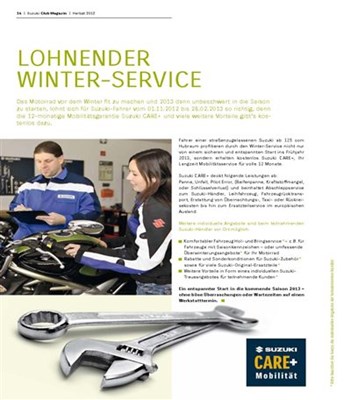 die 12-monatige Mobilitätsgarantie Suzuki CARE+ und viele weitere Vorteile gibt‘s kostenlos dazu.
