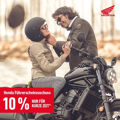 * Führerscheinzuschuss: 10 % Nachlass auf die UVP (inkl. Überführungsgebühr), bis zu 1.000, € für jede zulassungsfähige neue Honda CBR500R, CMX500 Rebel S Edition, CMX500 Rebel, CB500F, CB500X, CL500 oder NC750X (mit Schaltgetriebe). Gültig sowohl für Direkteinsteiger als auch für Aufsteiger, die nur noch eine praktische Prüfung ablegen müssen, sowie für absolvierte Prüfungen aus dem Jahr 2022/2023. Inhaber eines A2-Führerscheins können ein 35-kW(48-PS)-Drosselkit erwerben (für den Umbau bzw. die Eintragung können zusätzliche Kosten anfallen). Das limitierte Angebot gilt bis längstens 31.10.2023, nur bei teilnehmenden Händlern. Nicht mit anderen Aktionen kombinierbar.