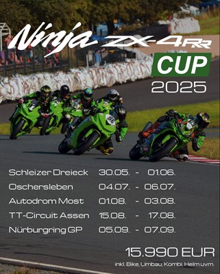 Der Kawasaki Ninja ZX-4RR-Cup geht 2025 in seine zweite Auflage. Dabei wird Bewährtes fortgeführt, aber auch einige Neuerungen und Verbesserungen stehen für die Piloten und Teilnehmer an: Vier der fünf Termine werden im Rahmen der Internationalen Deutschen Motorradmeisterschaft (IDM) ausgetragen. Erstmals wurde der Kawasaki Ninja ZX-RR-Cup im Jahre 2024 durchgeführt. Auf der Basis des im Probejahr Gelernten, stehen die Zeichen nun klar auf Zukunft. Die Premieren-Saison lieferte bereits spannende Rennen und die Titelentscheidung fiel ganz am Ende um nur einen Punkt. Kostengünstiger Motorradrennsport ab 14 Jahre Im Kawasaki Ninja ZX-4RR-Cup kann man ab 14 Jahren teilnehmen, was die Klasse zu einem perfekten Einstieg in den Lizenzrennsport auf Großrennstrecken macht. Der Preis von 15.990 Euro inklusive Motorrad, Startgeld, Helm, Lederkombi und Zelt ist dabei unschlagbar. Doch damit nicht genug. Die Piloten des Cups profitieren von weiteren Gimmicks und dabei ist das tolle, familiäre Umfeld und die gegenseitige Hilfe der Teilnehmer untereinander noch kostenlos dabei. An der Strecke wartet auf die Teilnehmer eine technische Unterstützung im Technik-Zelt, wo jederzeit geholfen wird sei es bei der Abstimmung oder bei Reparaturen. Bereits 2024 gab es Riding Coaches an den Strecken, die bei manchen Teilnehmern Verbesserungen von über 10 Sekunden pro Runde ermöglichten. Gaststarter Willkommen Neben den fest eingeschrieben Piloten wird es auch 2025 wieder die Möglichkeit geben, als Gaststarter dabei zu sein. Einige, die diese Chance in der Premieren-Saison ergriffen hatten, haben signalisiert 2025 fester Bestandteil des Kawasaki Ninja ZX4-RR Cups werden zu wollen. 2025 wird es wieder und noch mehr Möglichkeiten für Gaststarts geben. Fakten Preis: 15.990 EUR Motorrad: Kawasaki Ninja ZX-4RR Ausstattung: Helm, Lederkombi, Zelt Startgeld: enthalten Infos: Kawasaki.de, Fr-Performance.de, Intermot Racing-Halle oder per eMail an racing@kawasaki.de Termine 30.05.-01.06. Schleizer Dreieck 04.07.-06.07. Oschersleben 01.08.-03.08. Autodrom Most (CZE) 15.08.-17.08. TT-Circuit Assen (NED) 05.09.-07.09. - NürburgringGP