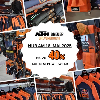 Pünktlich zum Maimarkt am Sonntag, den 18.05.2025 gibt es SATTE RABATTE von bis zu 40% auf KTM Powerwear!