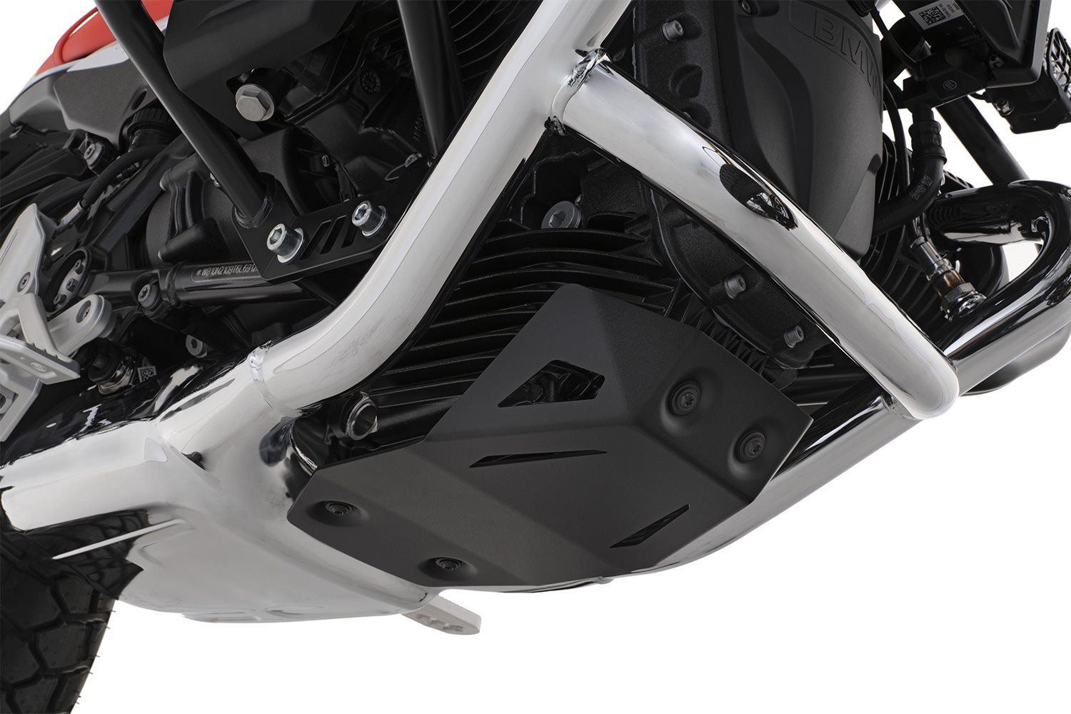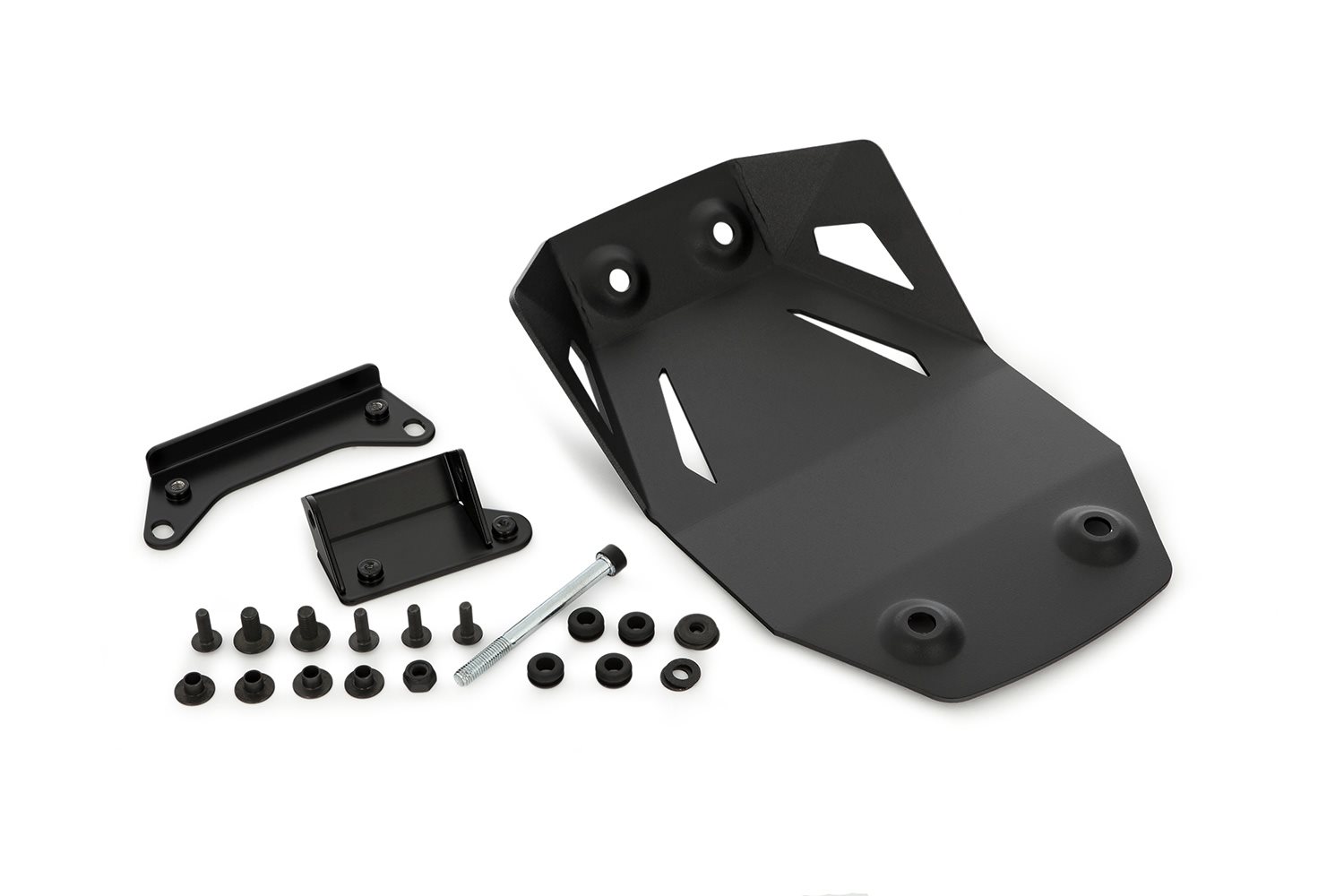 Der Aluminium-Motorschutz ist korrosionsbeständig und schwarz beschichtet. Das Bauteilgewicht wurde optimiert, während hohe Steifigkeit und Formstabilität erhalten bleiben. Ergebnis: ein puristischer, widerstandsfähiger, gewichts- und formoptimierter Motorschutz nach dem Prinzip Form follows function, der eng anliegt, die Baseline des Motorrads perfekt flankiert.