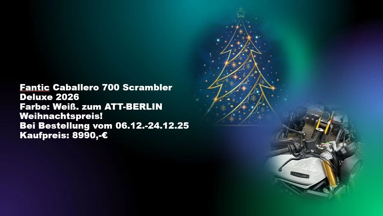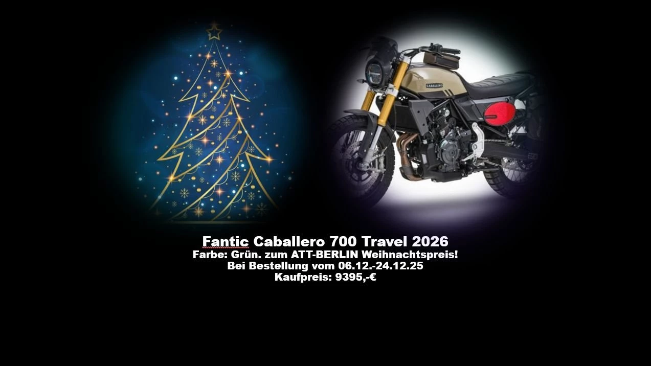 Für alle die für 2026 eventuell mit einer neuen Fantic liebäugeln haben wir jetzt , wo Fantic wieder richtig liefern kann, einige wunderschöne Fantic Motorräder bei Bestellung vom 06.12.2025 - 24.12.2025 zum ATT-Berlin Weihnachtspreis inkl. Finanzierungsangebot mit der Santander Consumer Bank AG auf unserer Hompage eingestellt. Den Termin für die Auslieferung sprechen wir gerne ab. Ob noch zu Weihnachten oder erst zum Saisonbeginn im März 2026. Das können Sie entscheiden.