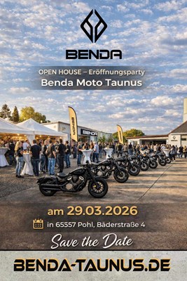 Ihr seit herzlich eingeladen zu unserer großen Eröffnung und entdeckt die neuesten Benda-Motorräder in entspannter Atmosphäre.