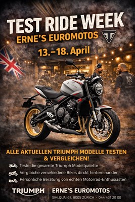 Bei der Test Ride Week von Erne’s Euromotos hast du die einmalige Gelegenheit, alle aktuellen Modelle von Triumph Motorcycles ausgiebig zu testen, zu vergleichen und deinen persönlichen Favoriten zu finden.