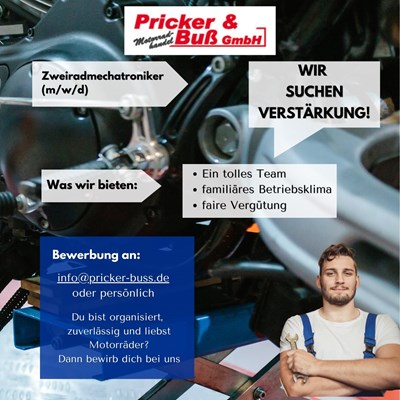 Dann werde Teil unseres Werkstattteams bei Pricker & Buß einem etablierten Motorradbetrieb in Haren-Emmeln mit langjähriger Erfahrung und moderner Ausstattung.