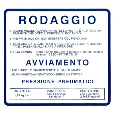 Aufkleber Einfahrvorschrift, RODAGGIO für Vespa 50 SS/90 SS